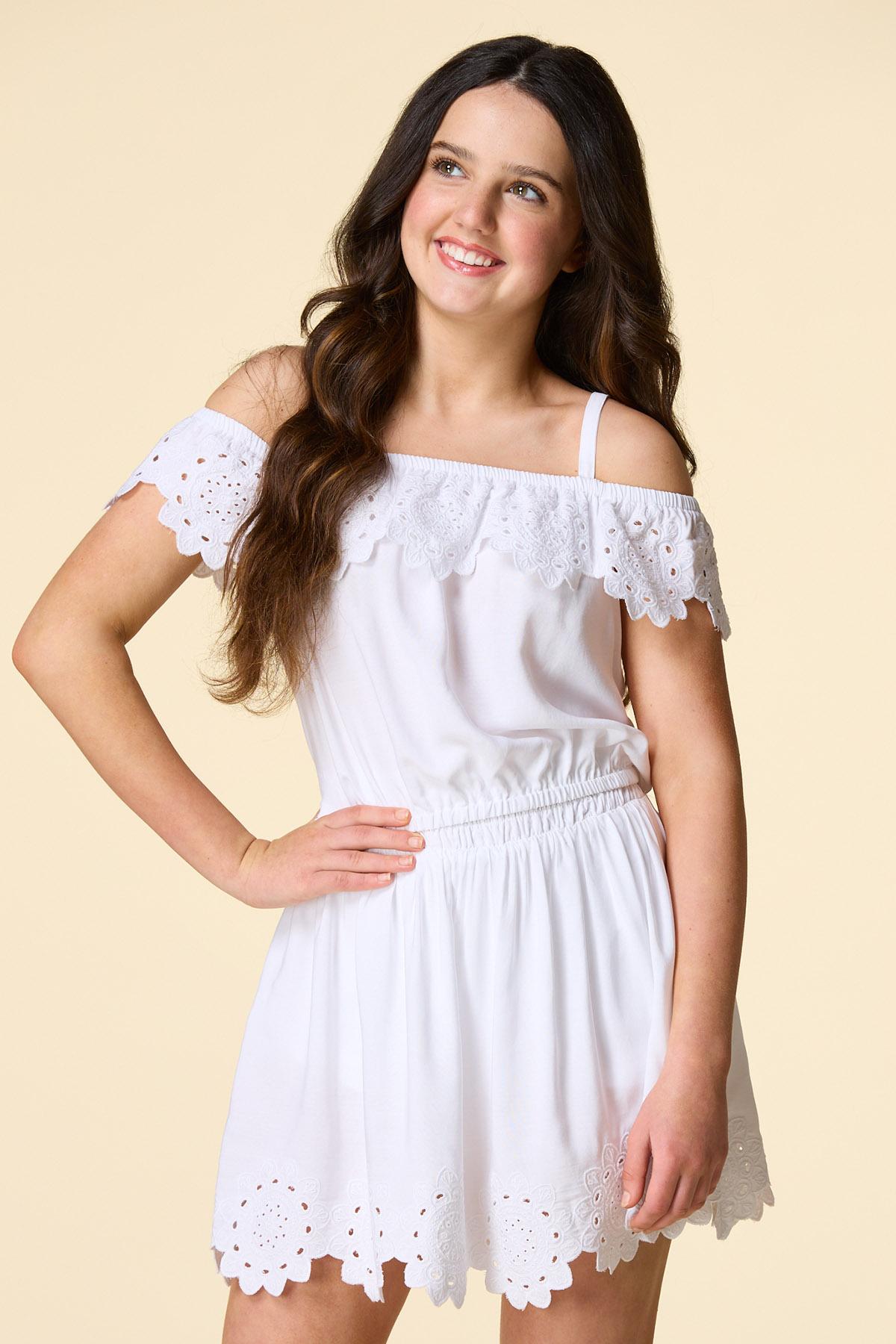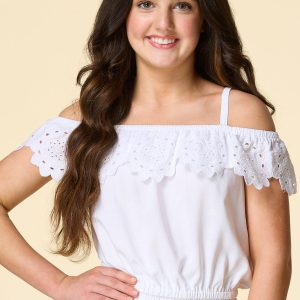 Get ready to look so sweet for the sun with this one. A ruffled, off shoulder design with delicate-eyelet detail is topped by an elastic hem and bright white hue. Pair with denim shorts or our matching skort for fit options both you and your friends will love.