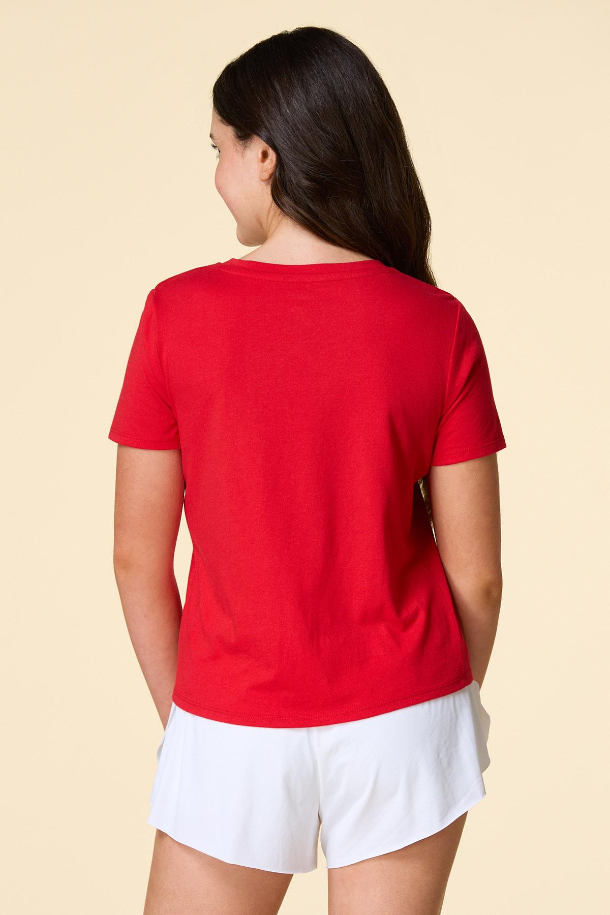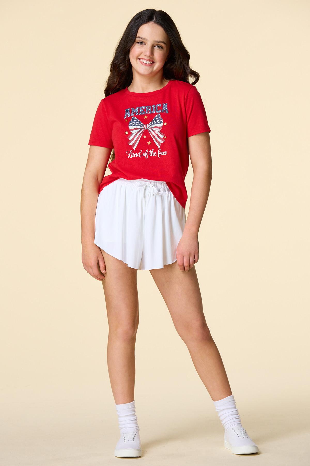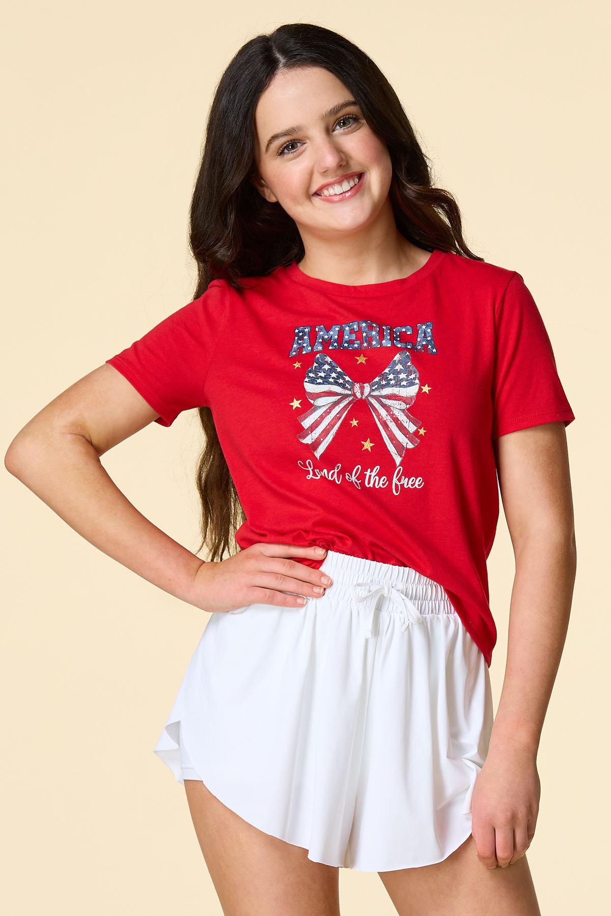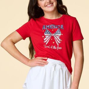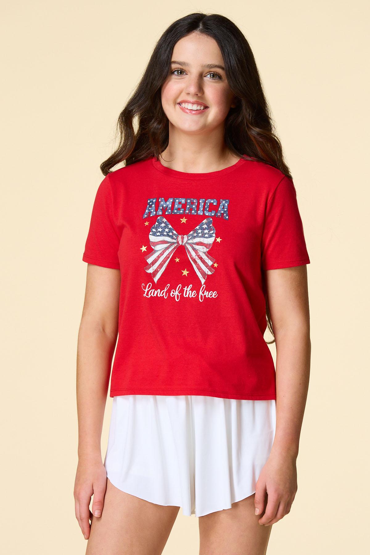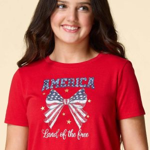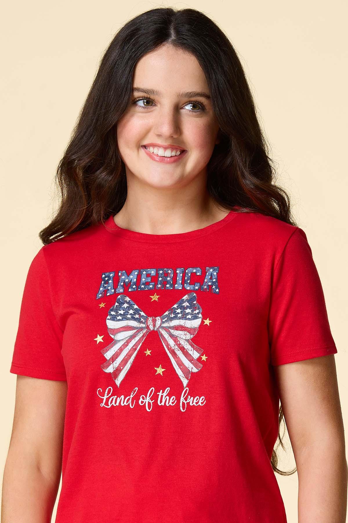 What a cute-tee you’ll be with this patriotic piece, featuring a scoop neckline, classic fit and “America Land of the Free” bow graphic for a festive, firework-ready finish.