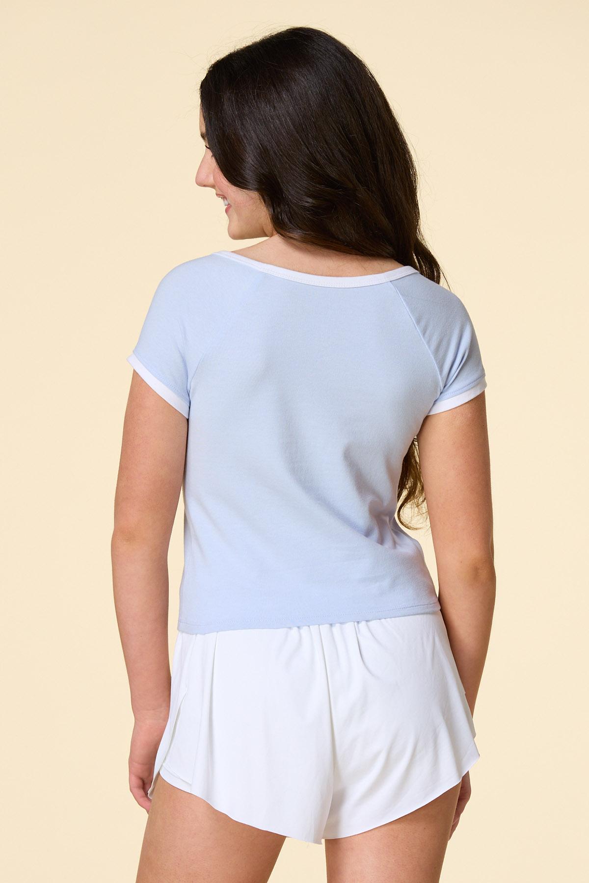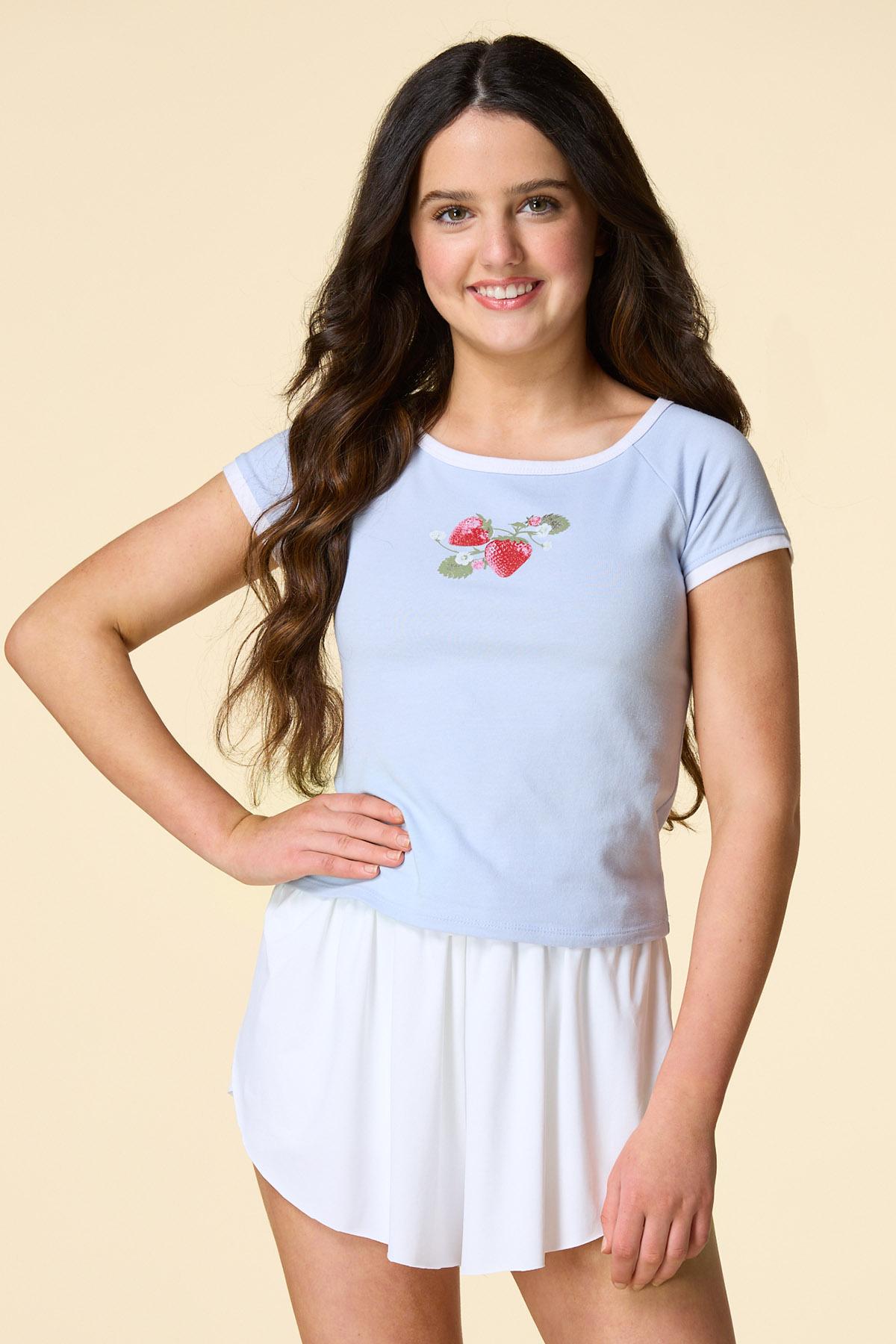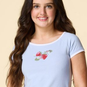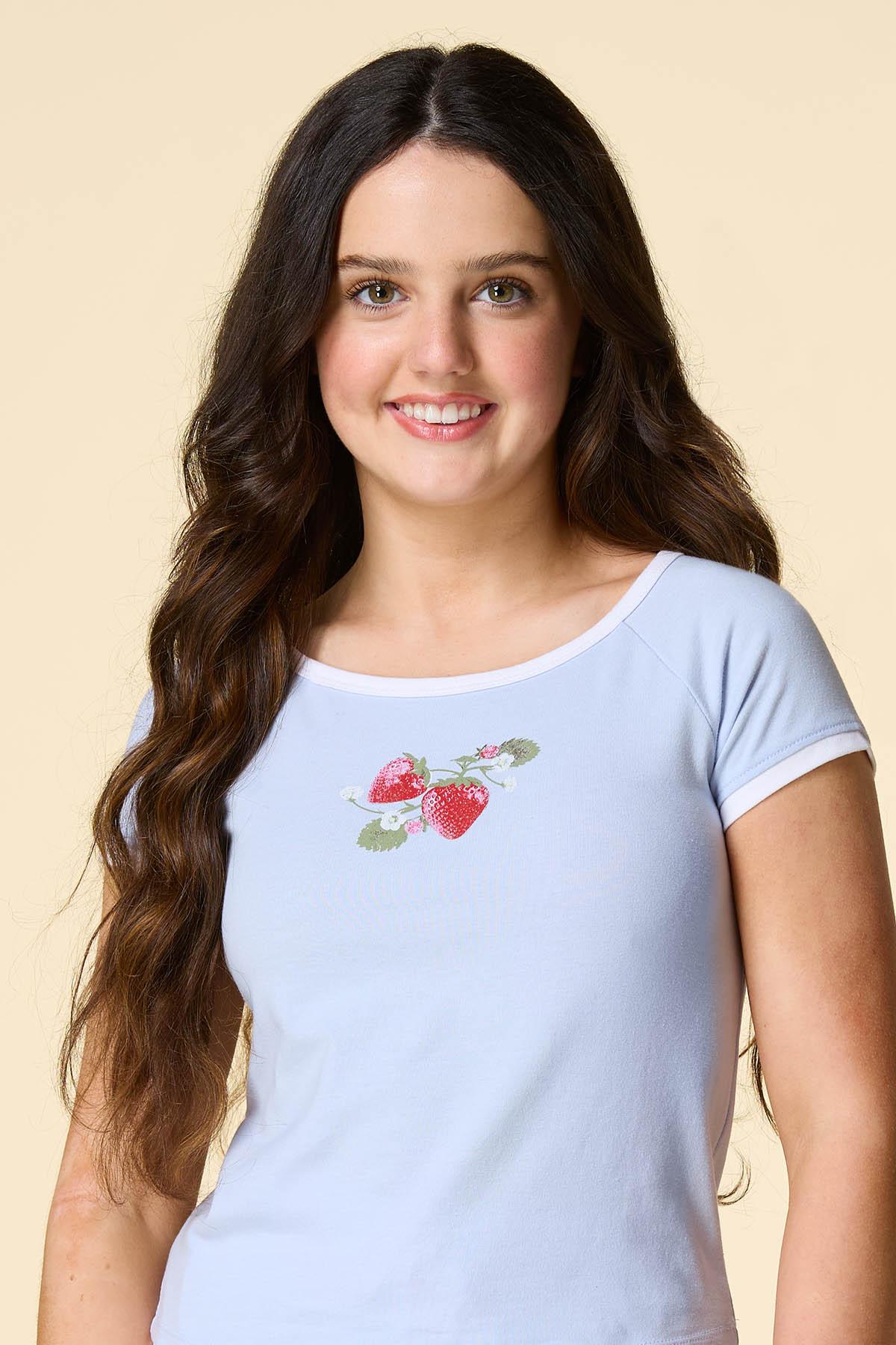 How sweet you’ll be in this cute-tee, featuring a scoop neckline, contrasting trim, a sky-blue hue and dainty vine strawberry print for an adorable look you can’t help but love with your favorite denim styles.