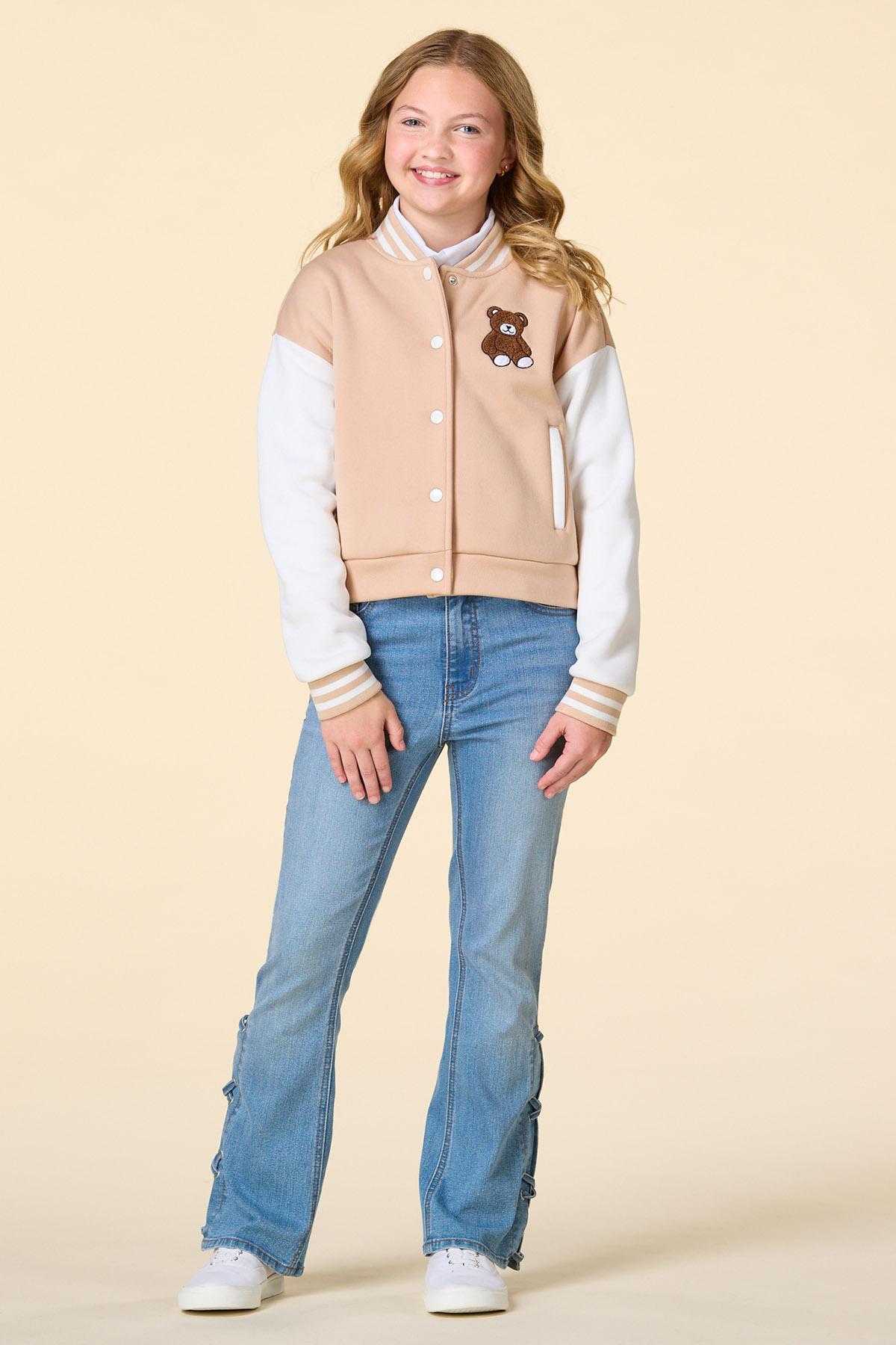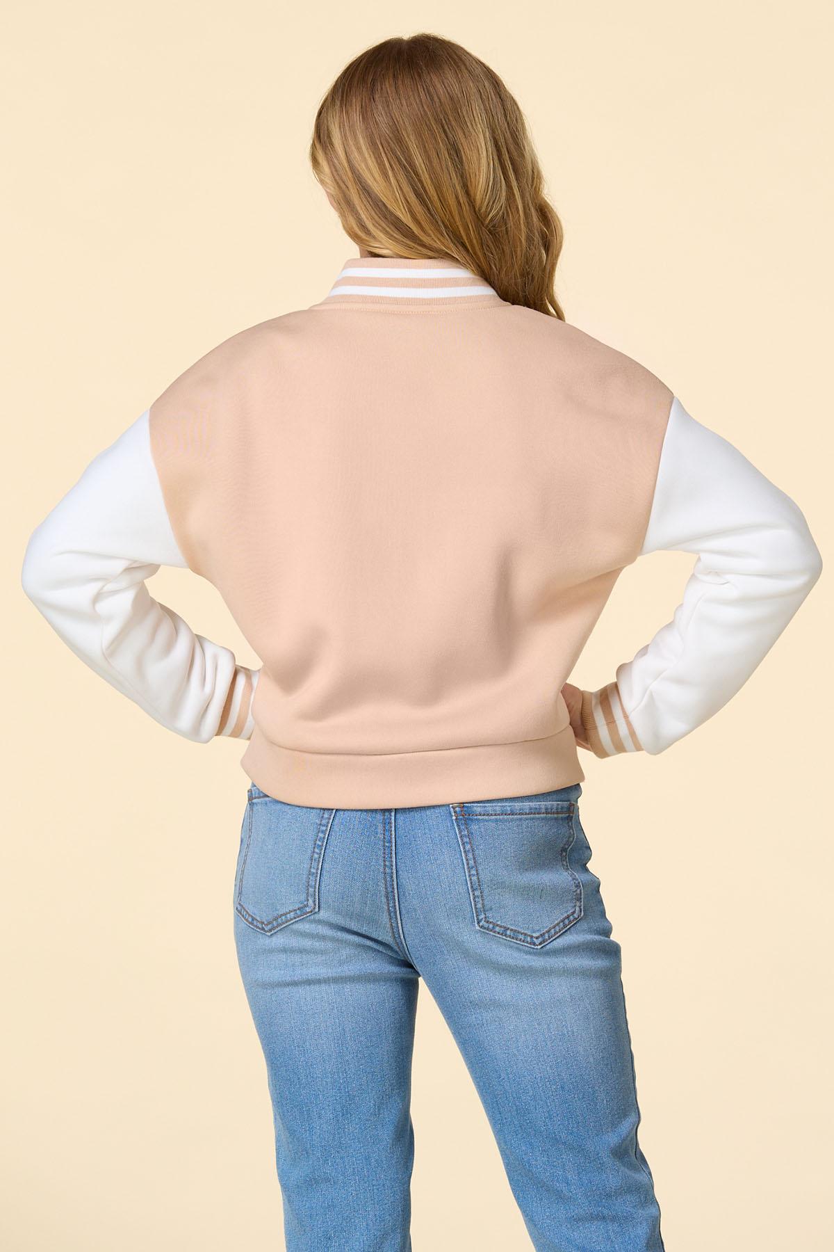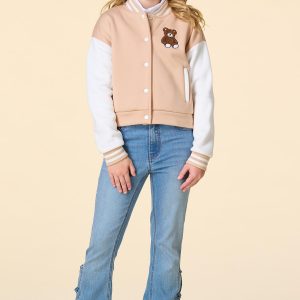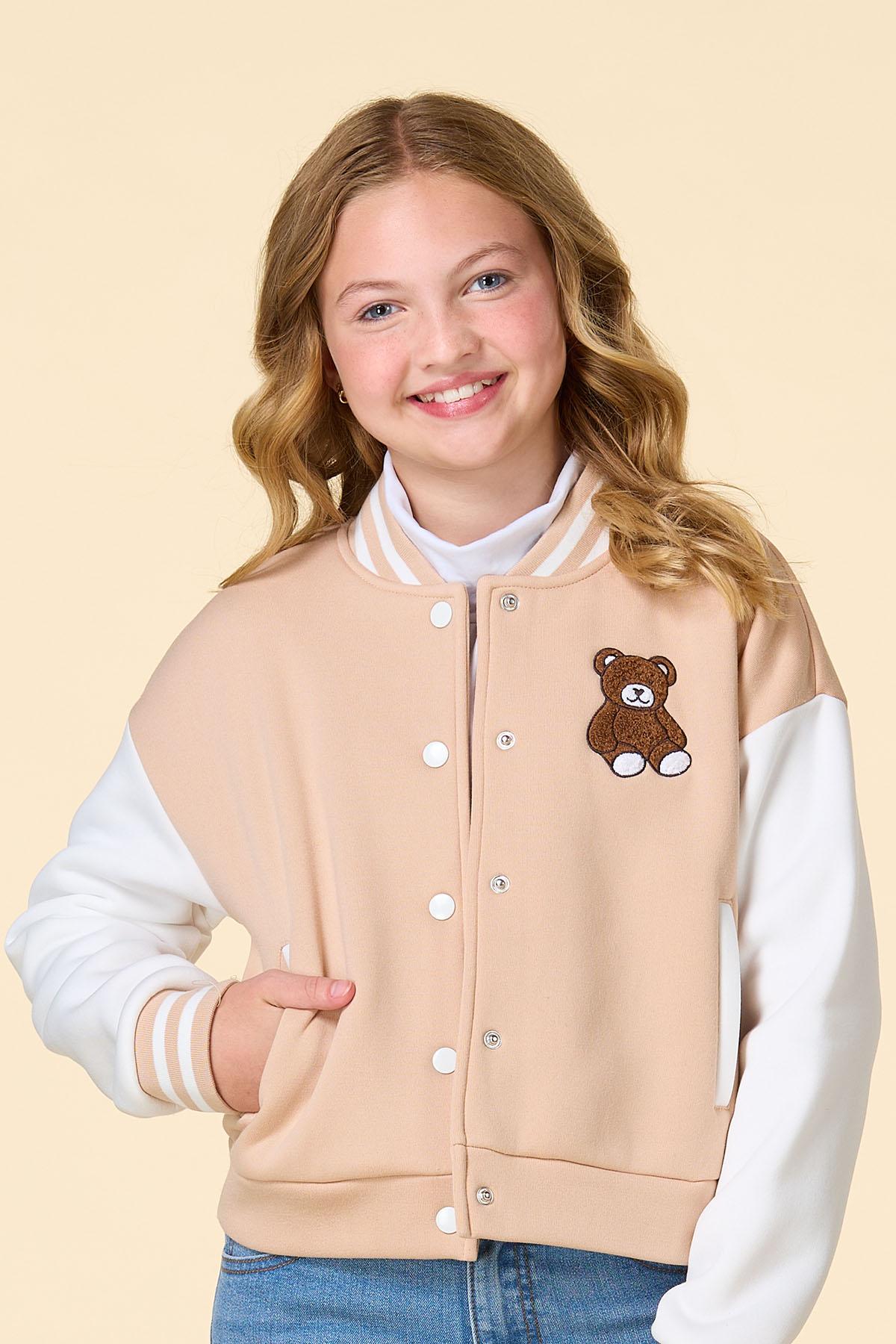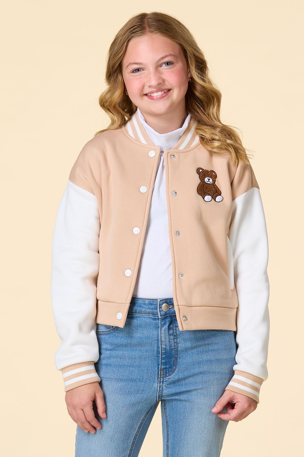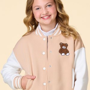 So snuggly and sweet. This jacket is perfect for keeping warm on those chilly summer nights, featuring color-blocked panels, a snap front closure, and striped collar and cuffs. Finished with a fuzzy teddy bear patch on the chest, you’re sure to be the cute one of the crew!
