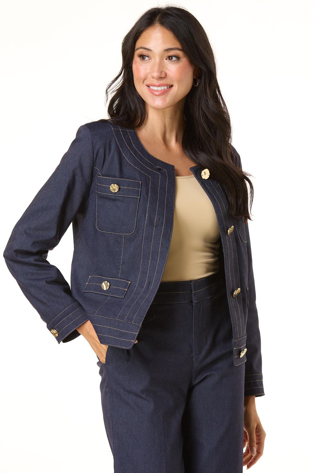 You’ll be making quite an impression when you show up wearing this dressy, denim style. Starting with lightly padded shoulders and continuing with a dark denim hue, stretch fit, contrasting stitch and hammered-gold buttons, this layering piece is the perfect match to our gold button denim pants.