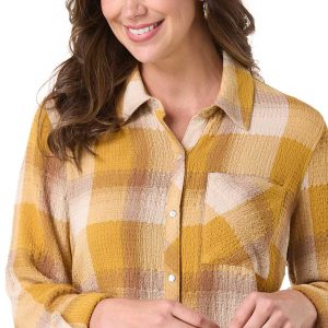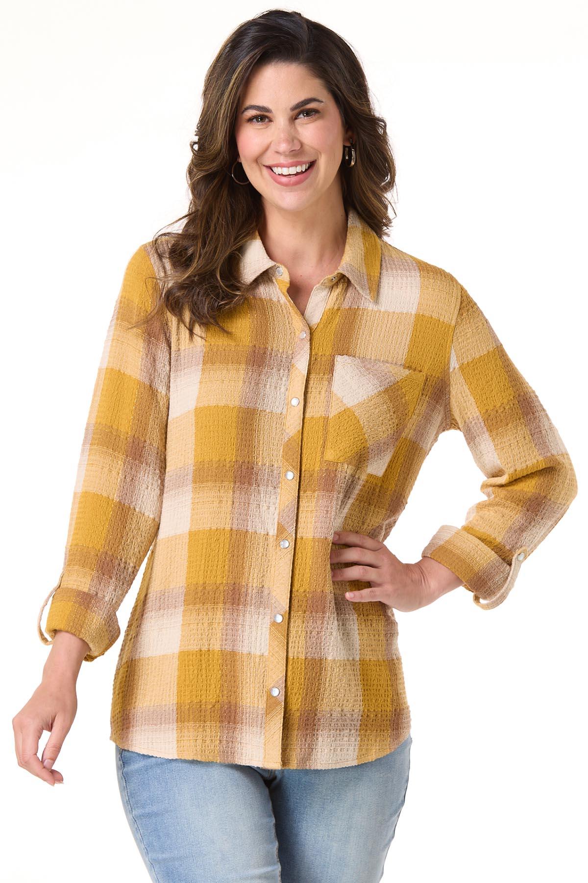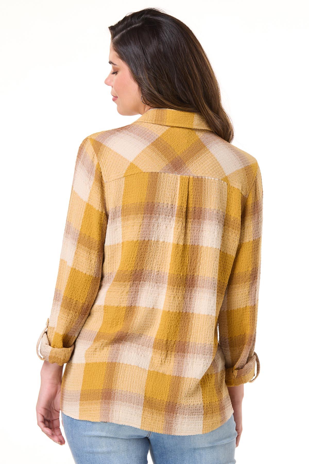 Hayrides and autumn afternoons were meant for a look like this. A collared neckline meets a snap down front, while a plaid pattern, golden hue, roll tab sleeves and hint of shimmer top off this look for a relaxed, easy-going look.