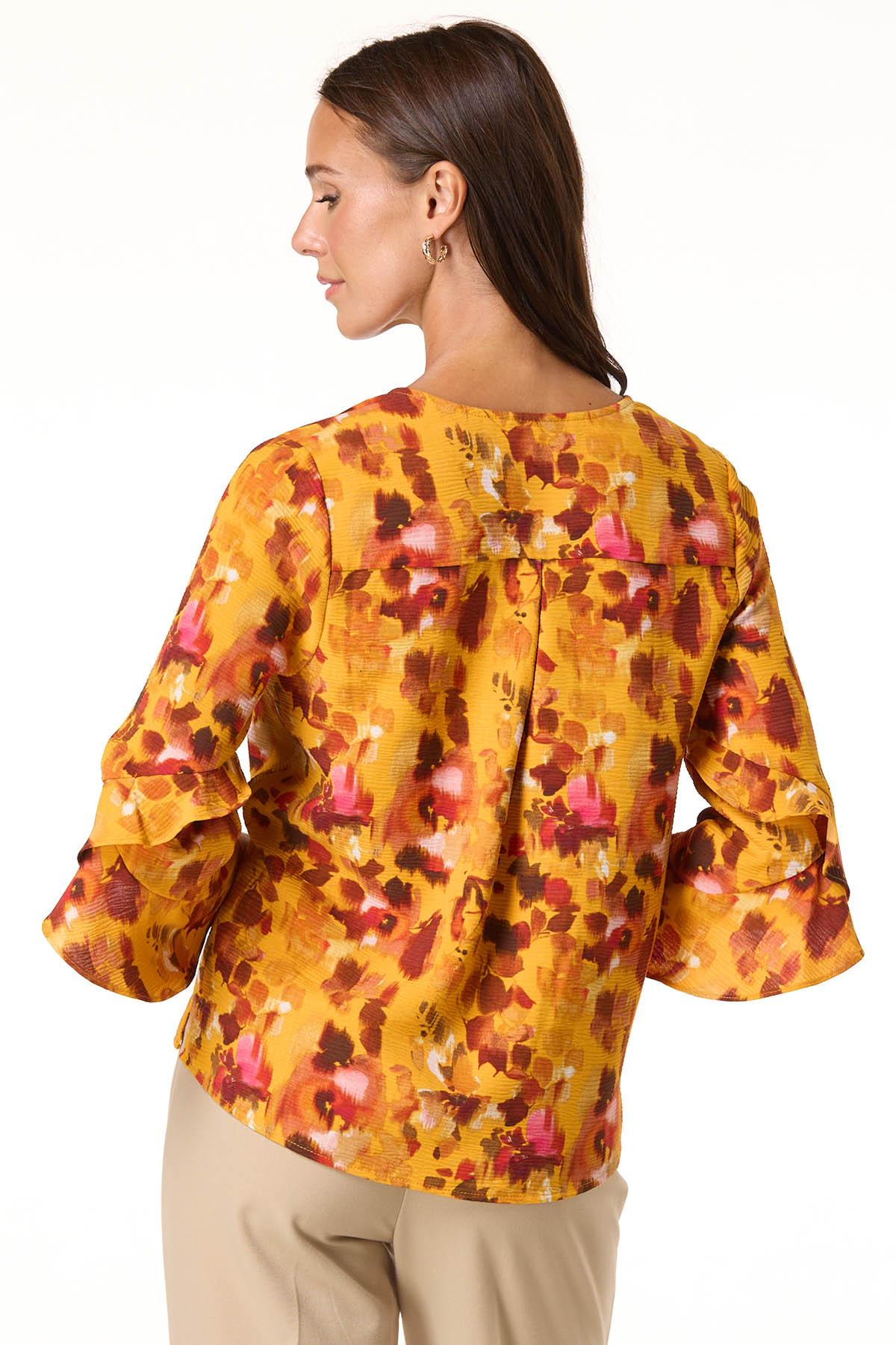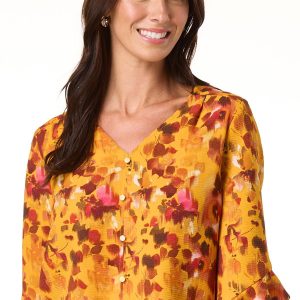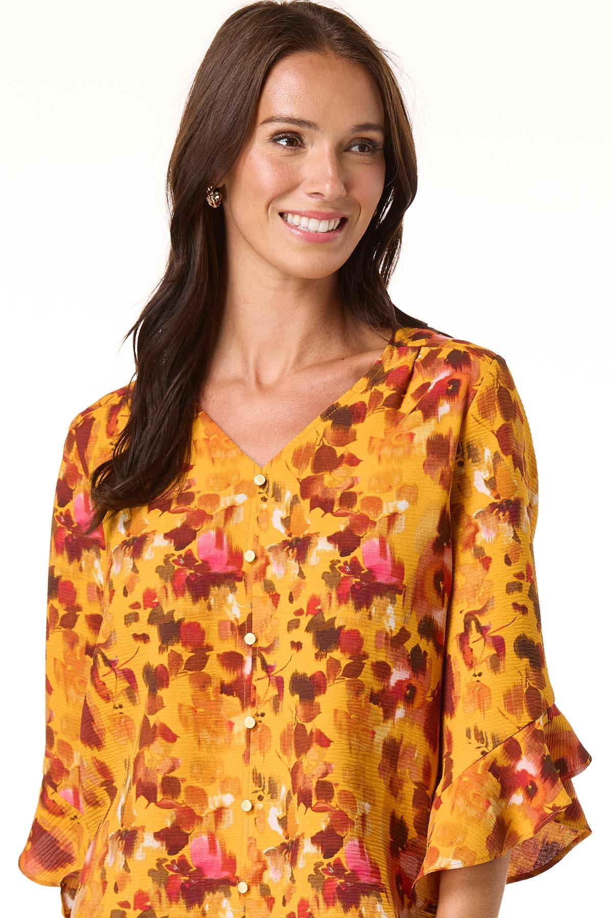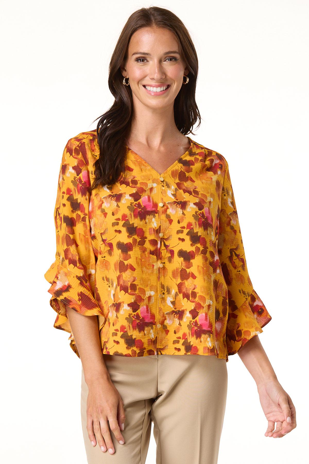 Light and airy, this woven blouse features an airflow fabric, 3/4 ruffle sleeves, a button front, a golden yellow hue and floral print – perfectly polished with a breezy feel.