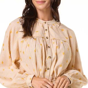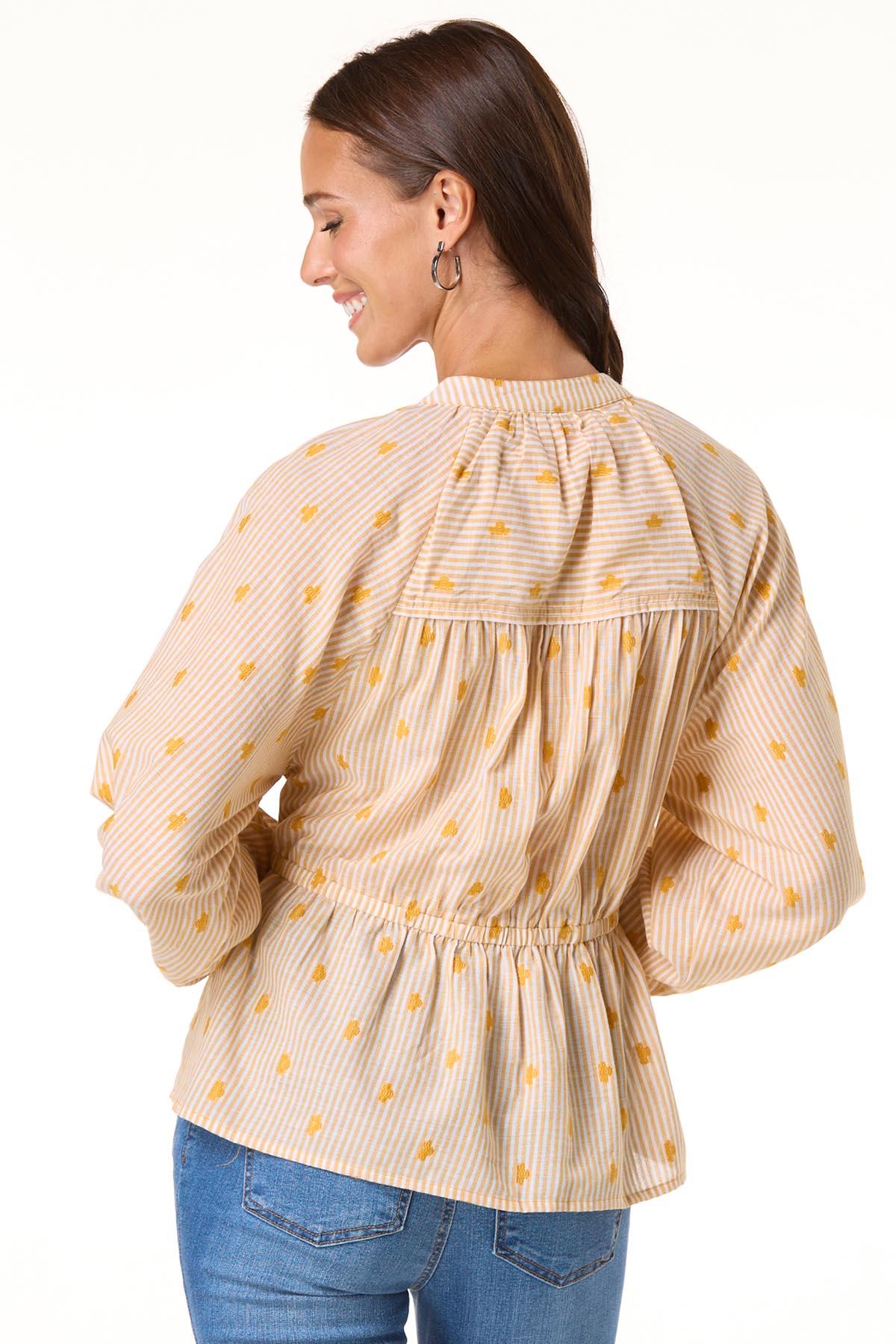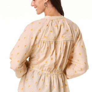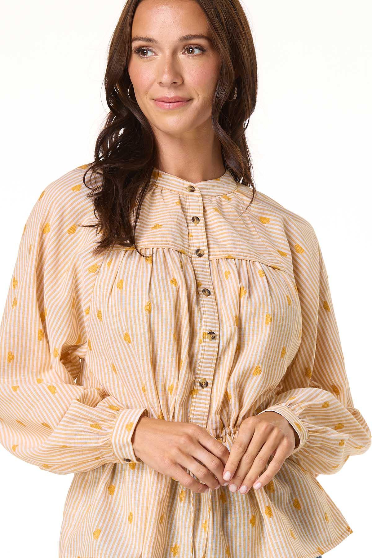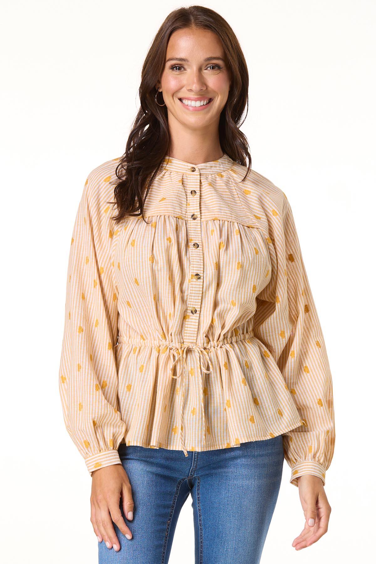 Add a touch of charm to your everyday look with this striped casual top, featuring a partial button-down front, tie waist, peplum flair, and delicate embroidered details.