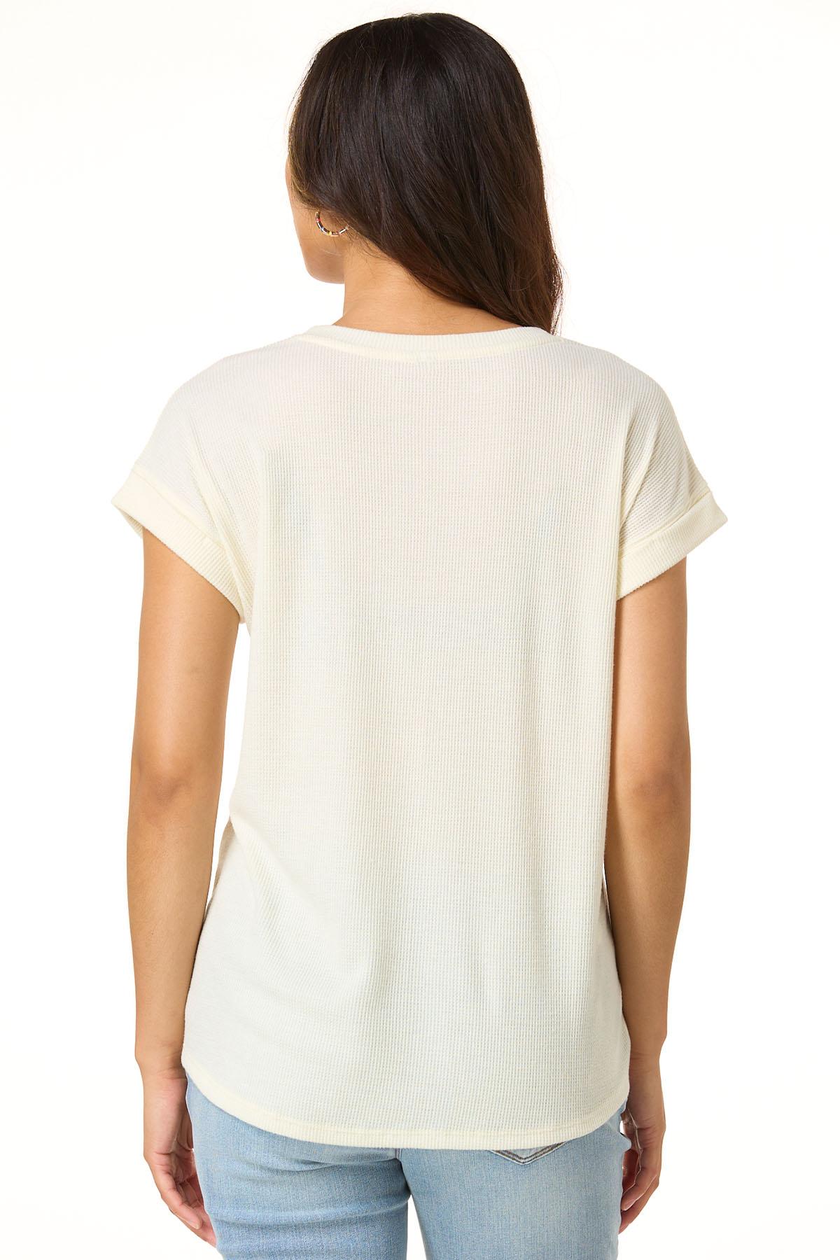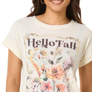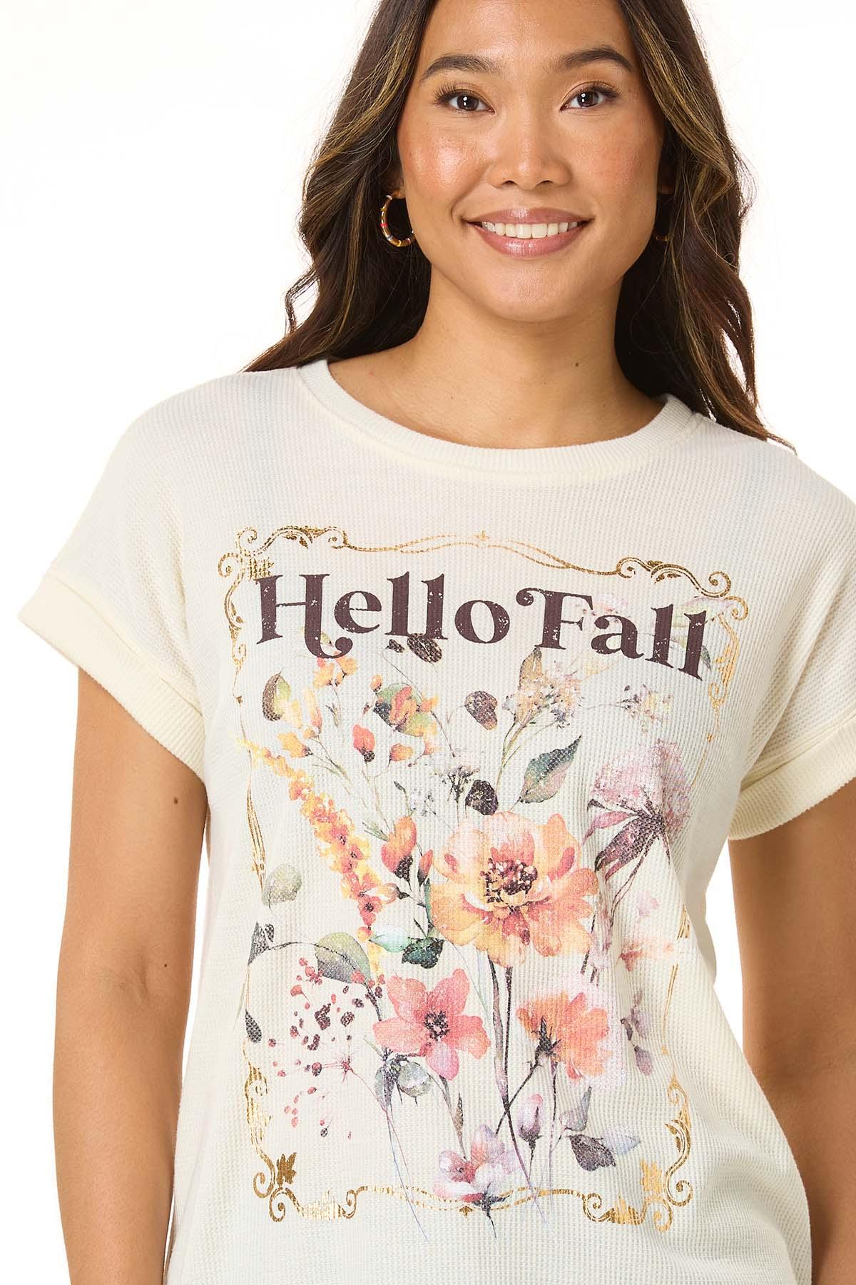 Say hello to cozy season in this waffle knit tee, featuring a charming floral “Hello Fall” graphic framed in a touch of metallic shine. A perfect blend of comfort and autumn charm.