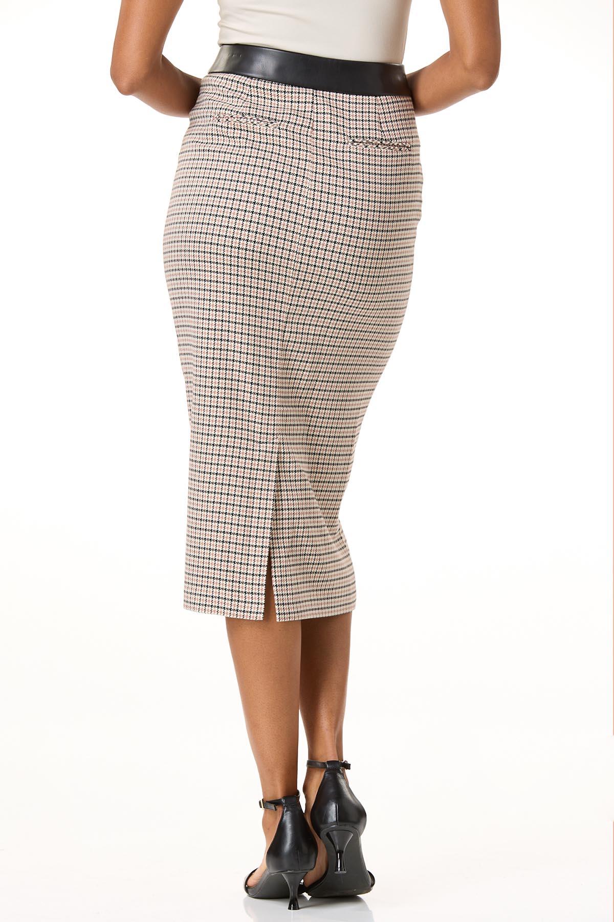 Polished? Check. Classic? Absolutely. Step into boss mode with this flattering stretch style, featuring a refined houndstooth check, pull-on design, sleek faux leather waistband, and a neutral palette for a chic, timeless look.