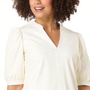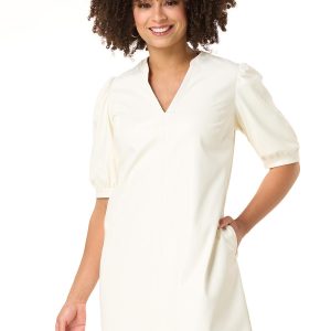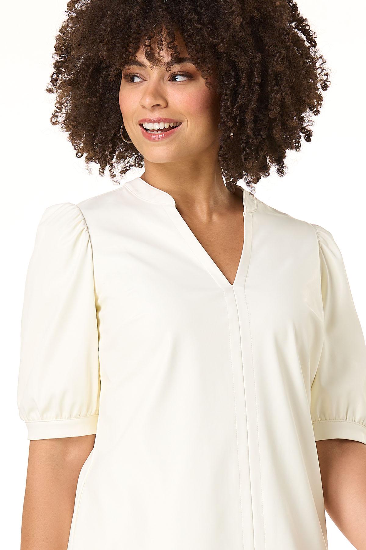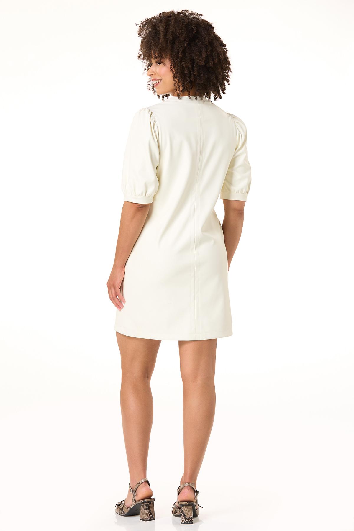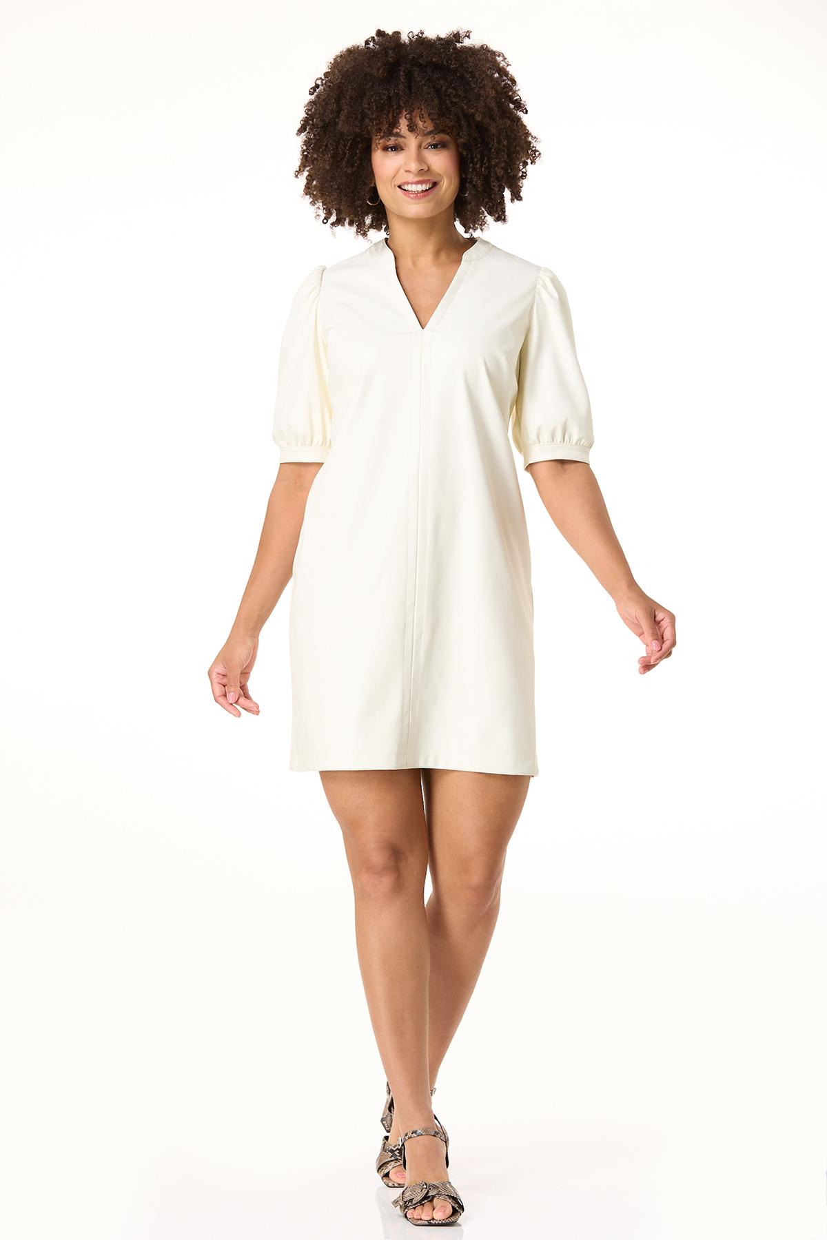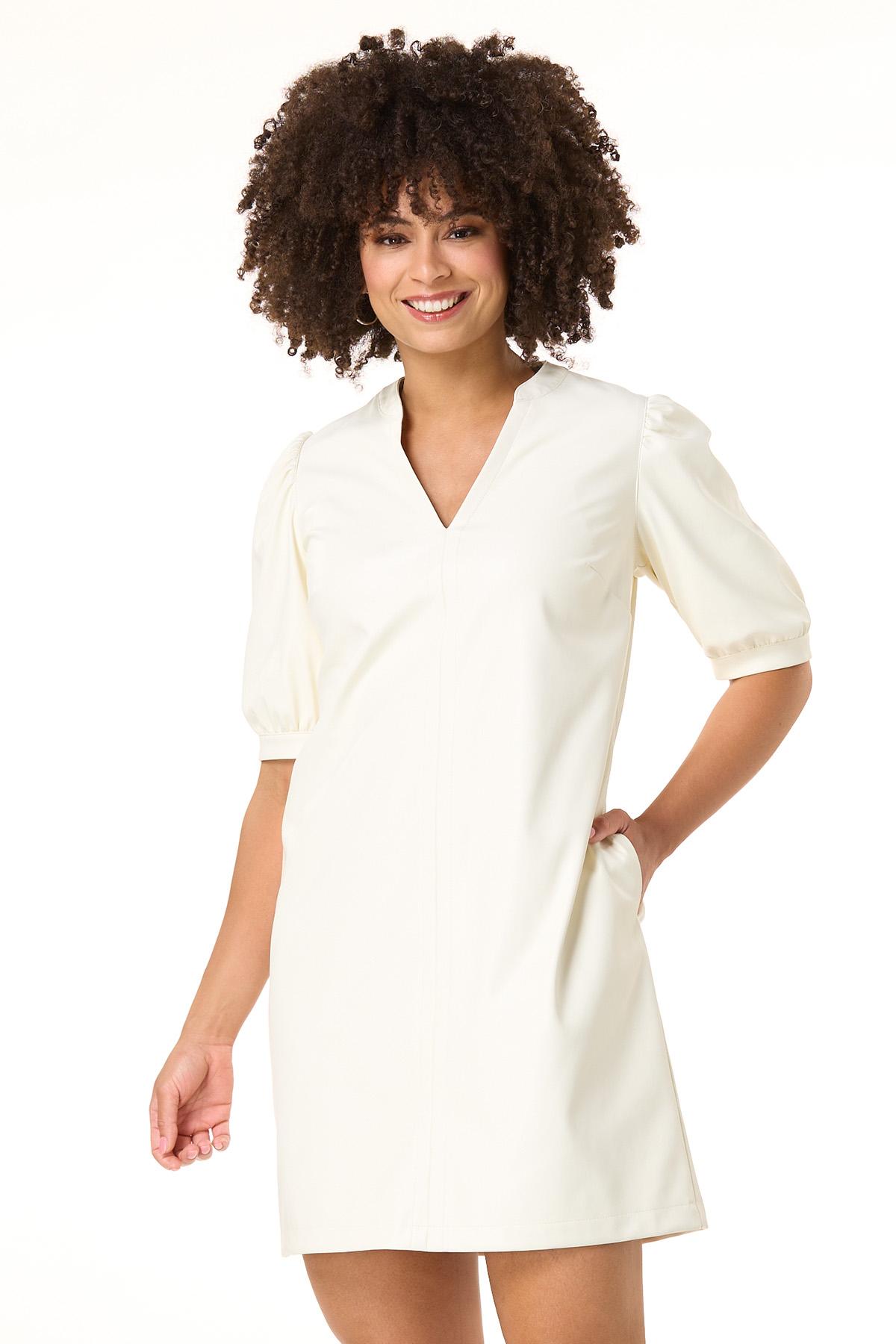 Turn heads in this short sleeve ivory dress, crafted from soft faux leather with a sleek split neckline and hidden side seam pockets. Style it with ankle boots and gold accessories for a polished, modern look.