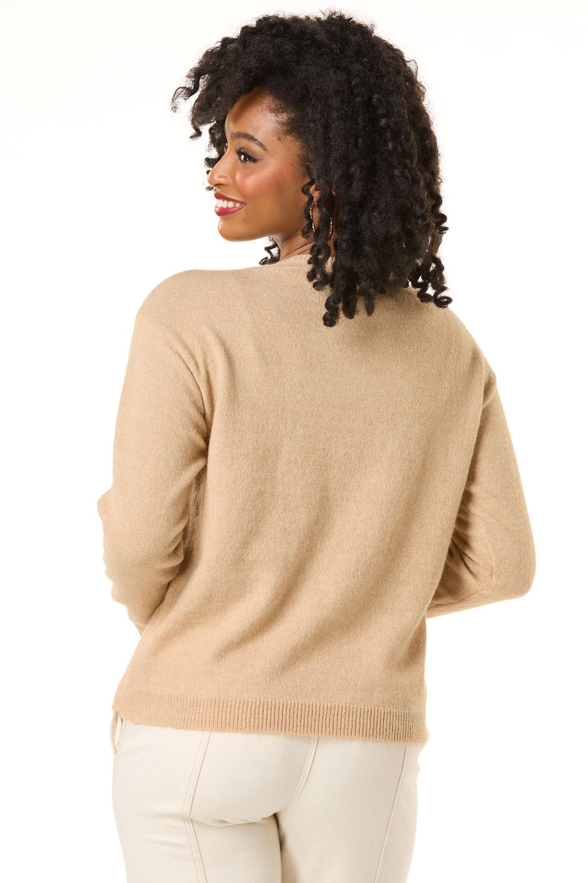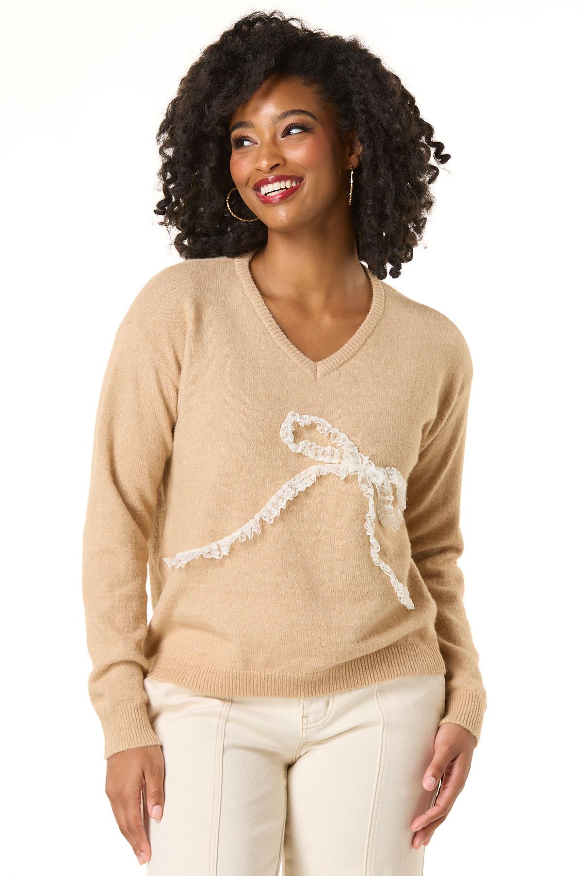 Charming and cozy – lucky for you, it’s true with this pullover style, featuring a v-neckline, beige hue, relaxed fit and sweet bow detail with a lovely-lace design.