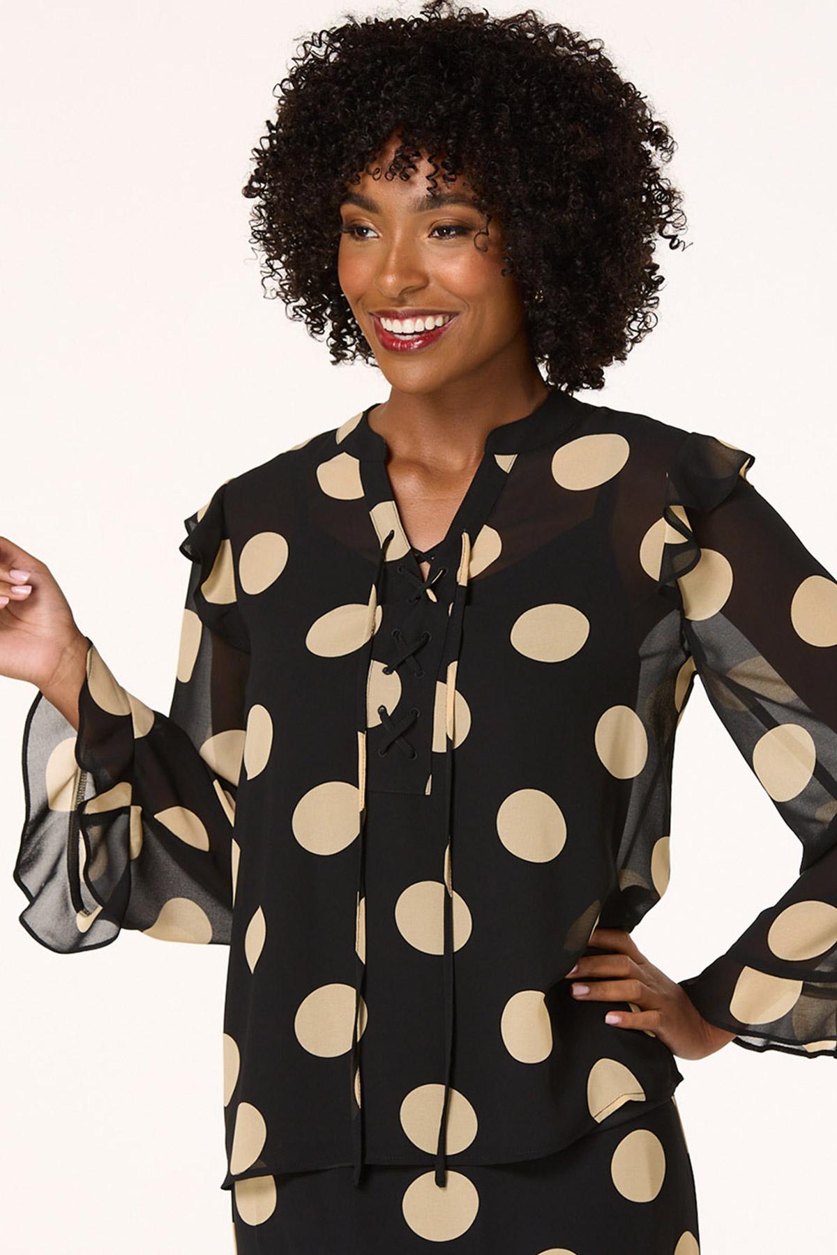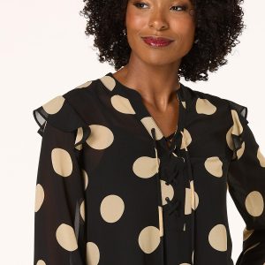 You’ll be the one that stands out when you show up in this charming dotted-print style, featuring a lace up neckline, polka dot print and a beige and black color palette for a classic finish.