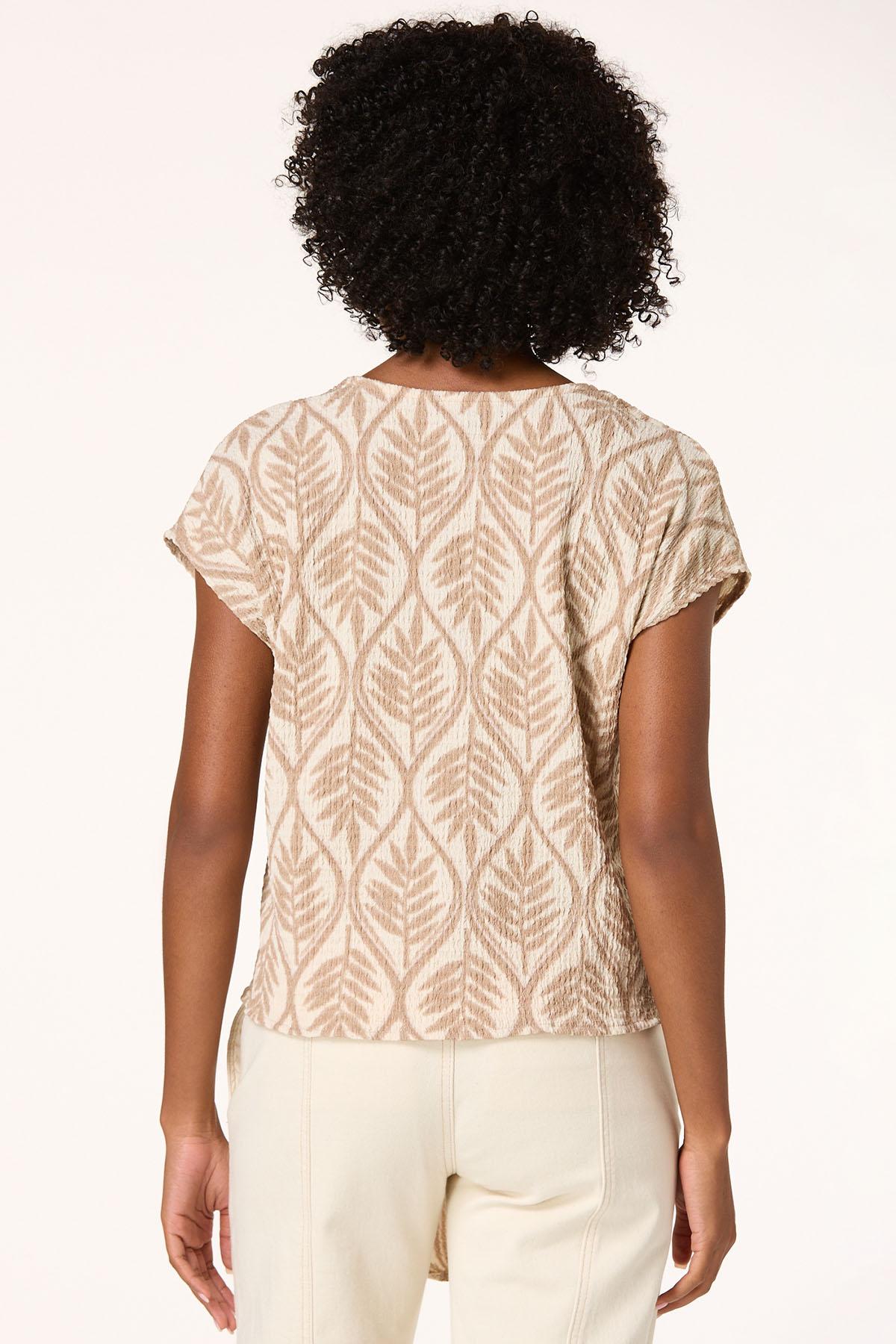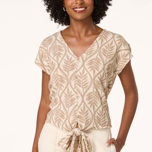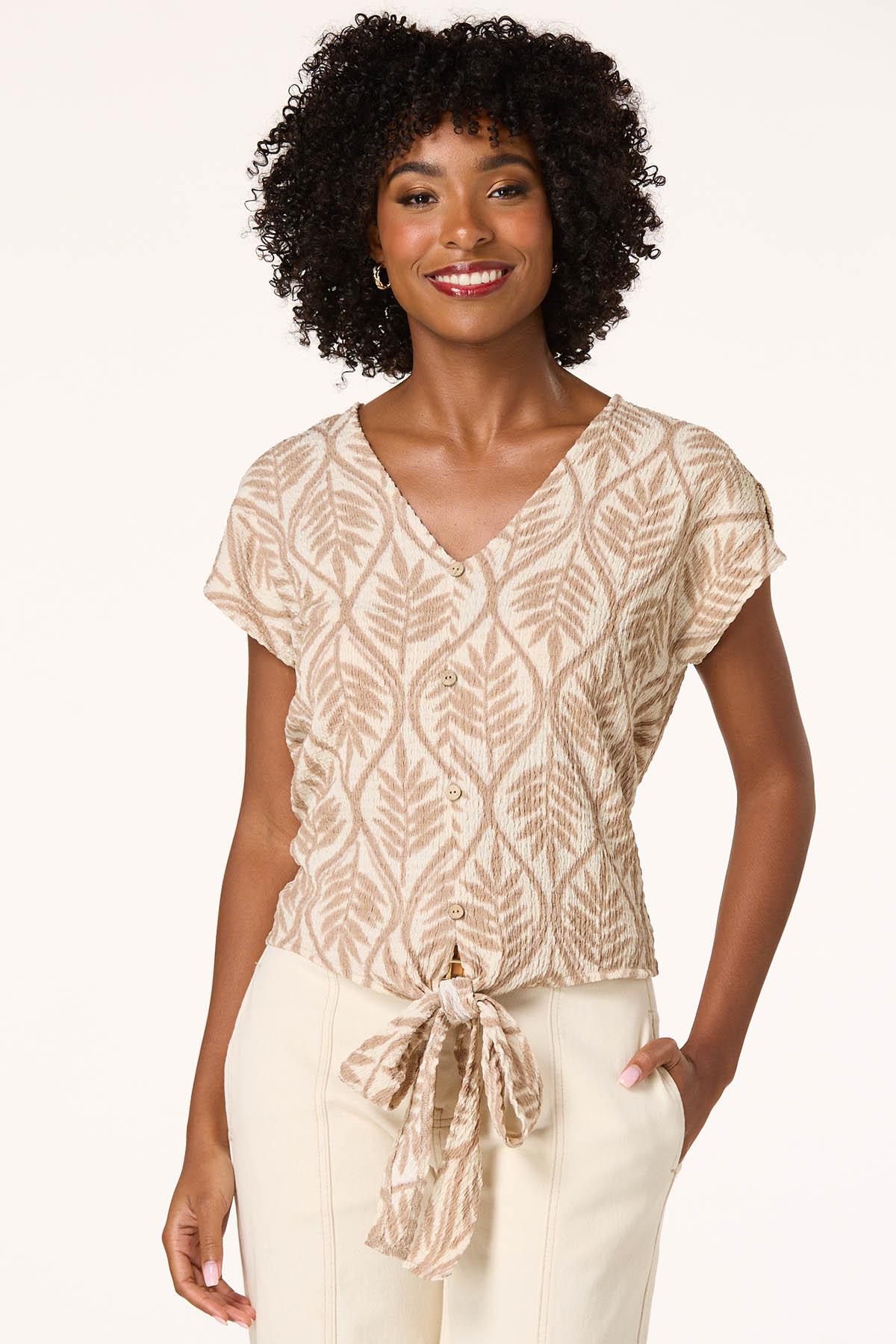 This earthy top feels so great even on the hottest summer day. A stretch, puckered knit fabric features a neutral geo-leaf print, a v-neckline, button front design and a tie front hem – a fabulous finish to a look you can’t help but love.