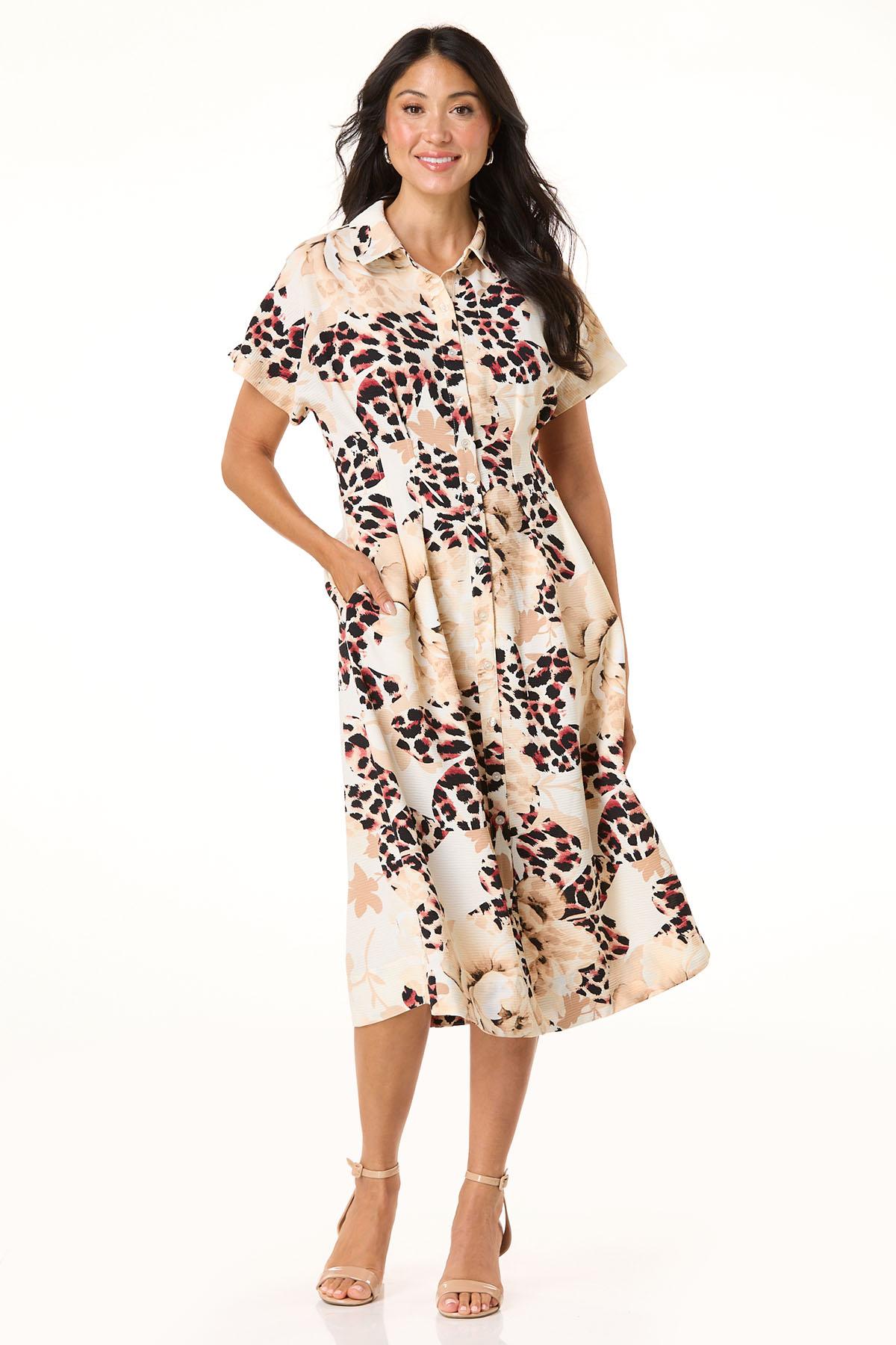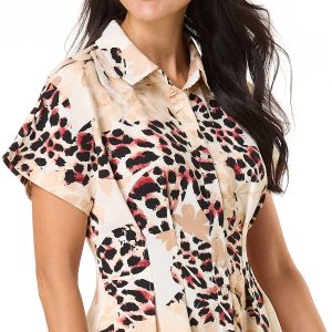 Be the one they remember when you show up wearing this wrinkle-free style, featuring a partial button down front, collared neckline and floral-leopard print in noteworthy-neutral hues.