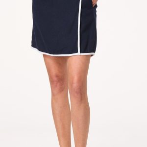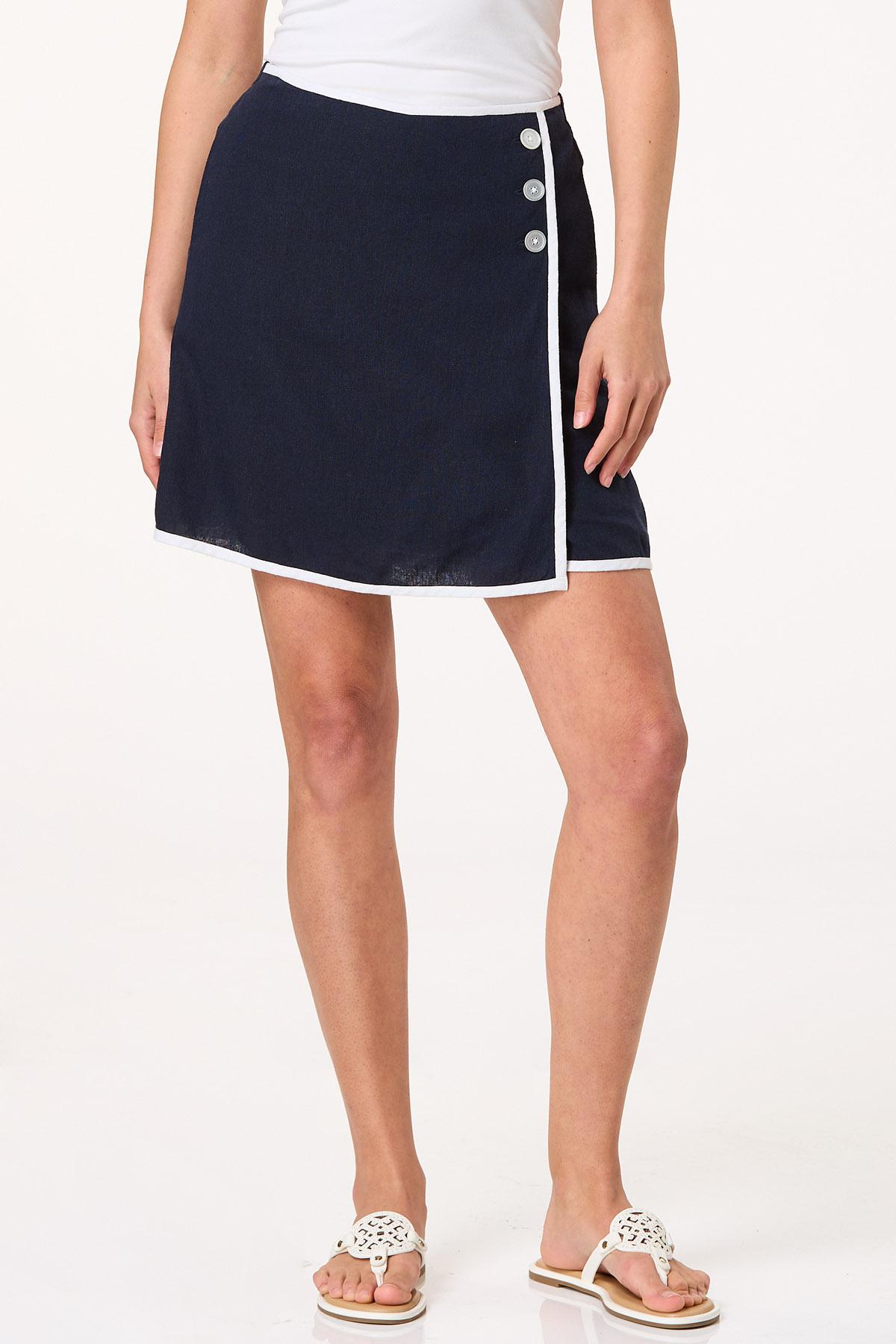 This navy linen skort brings breezy sophistication to your warm-weather wardrobe. Featuring a flattering wrap silhouette with a three-button closure and practical side seam pockets, it blends the tailored look of a skirt with the ease of shorts – perfect for everything from brunch to boardwalk.