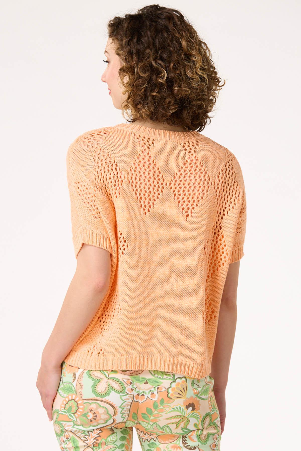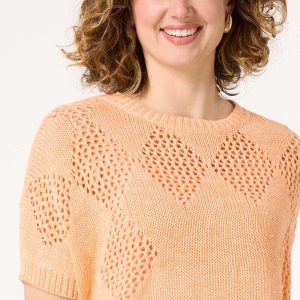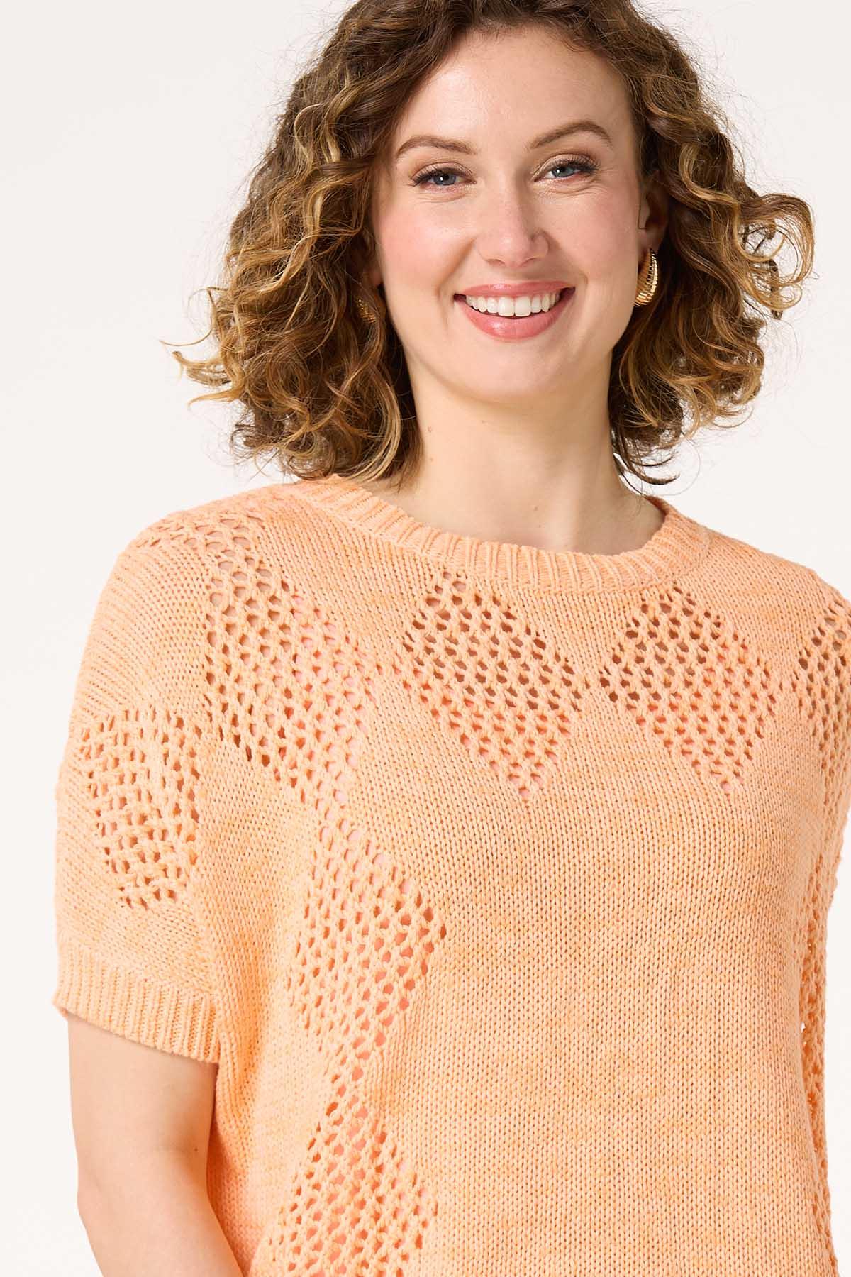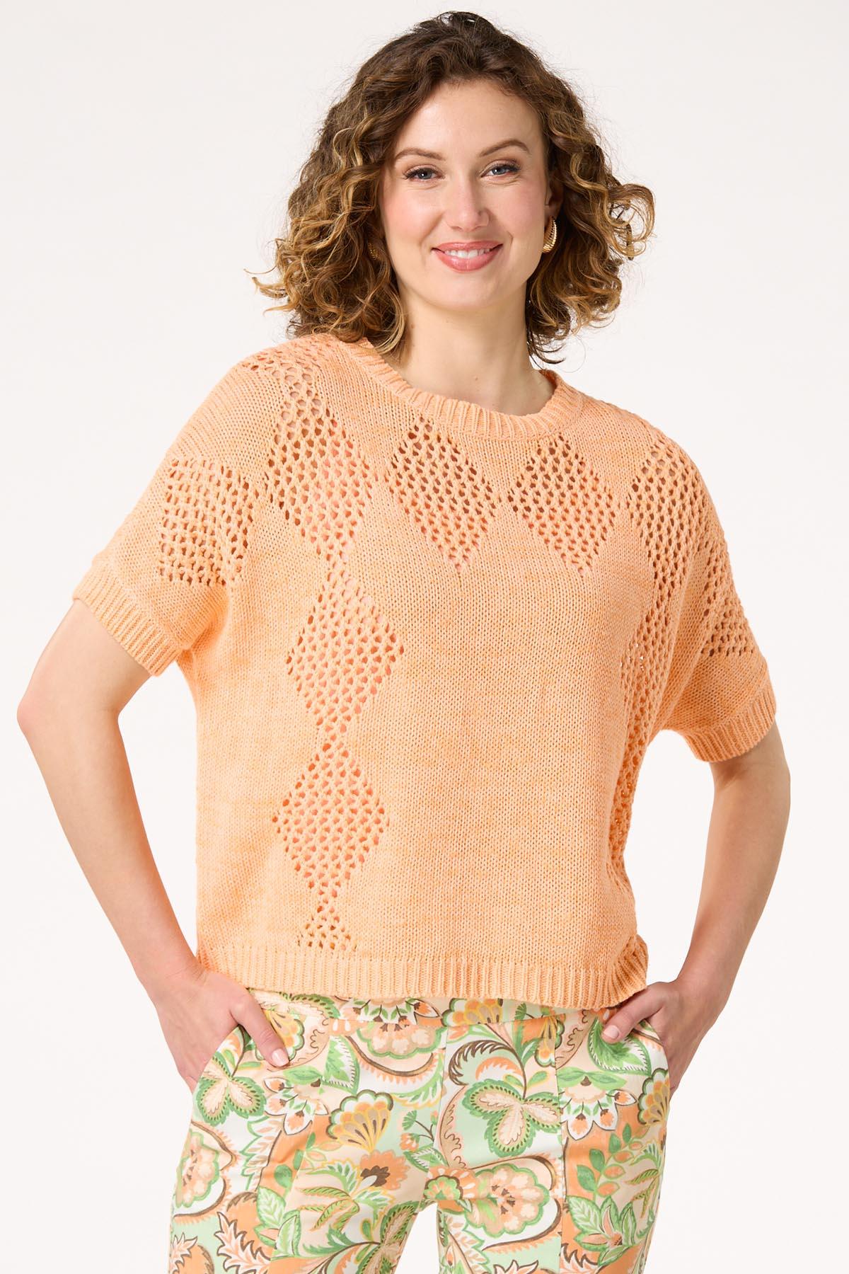 The change of seasons is bringing a whole new look to sweater season with this open stitch style, featuring a scoop neckline, diamond design, relaxed fit and the sweetest hue that is perfect for sunshine and warmer weather. Be sure to grab one of our layering tanks for a no-show finish you can feel confident about.