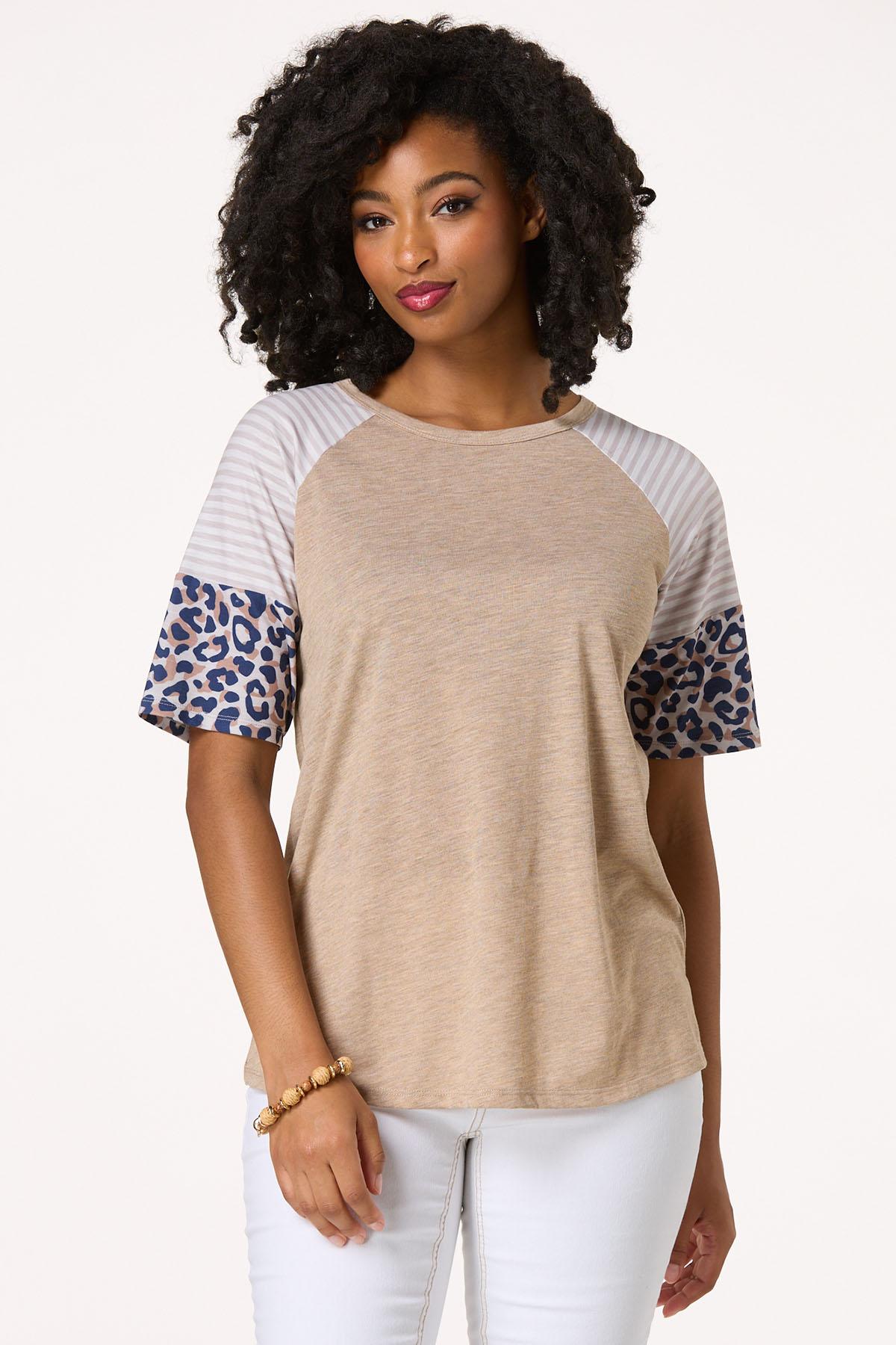 So casual and comfortable with a bit of fun mixed in. Lightweight-stretchy knit fabric features a light brown hue with a crew neckline, baseball-style short sleeves with mixed striped-and-animal prints and a super soft feel.