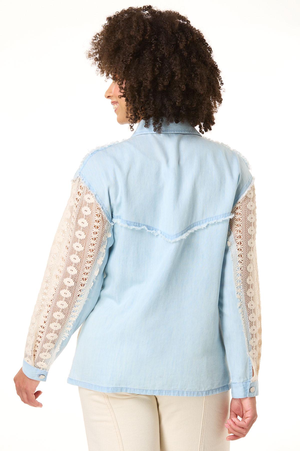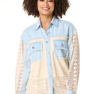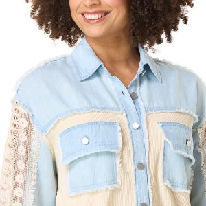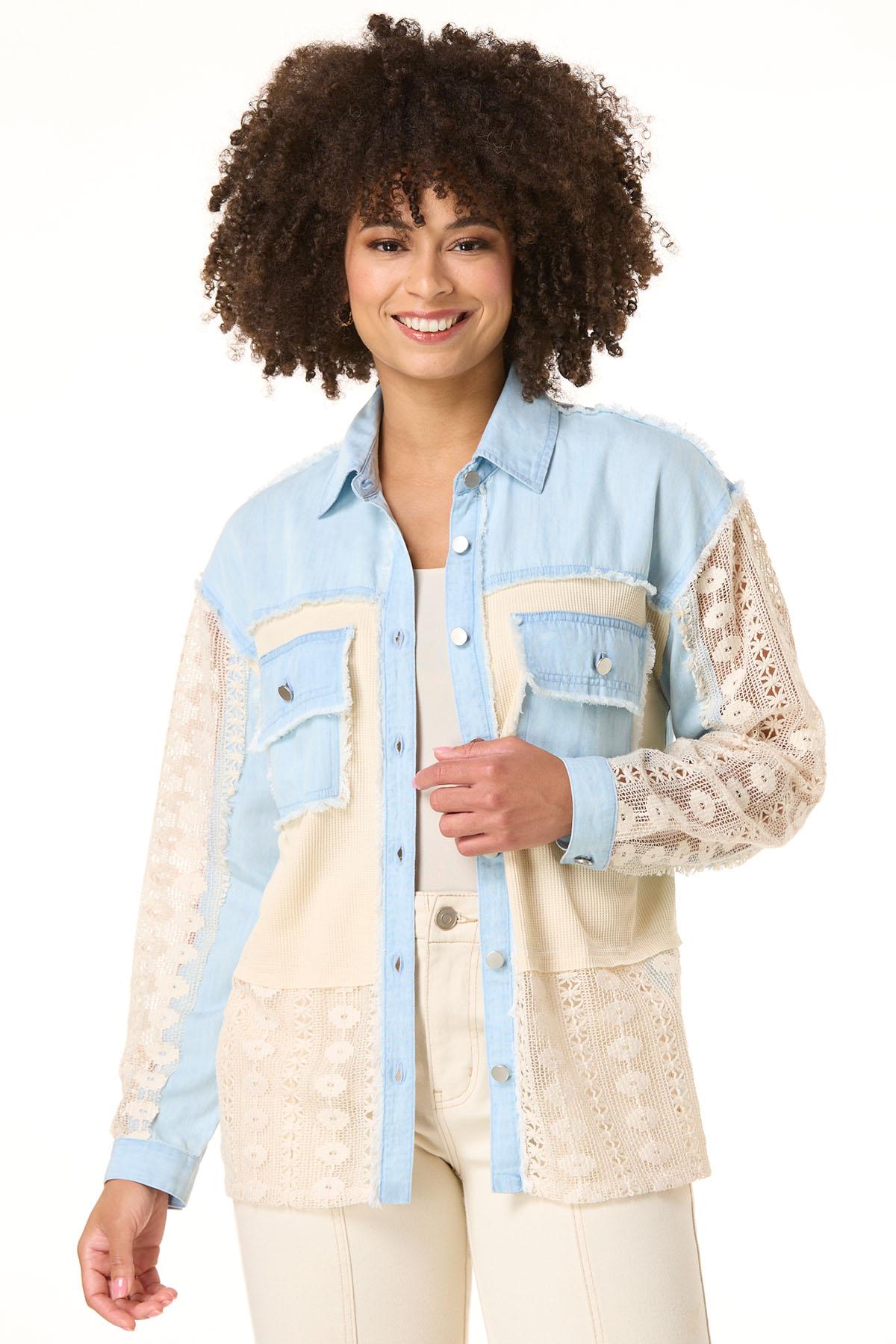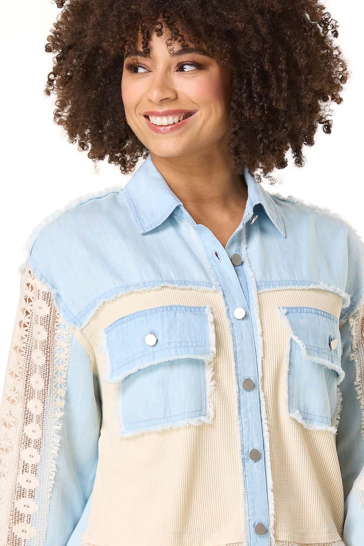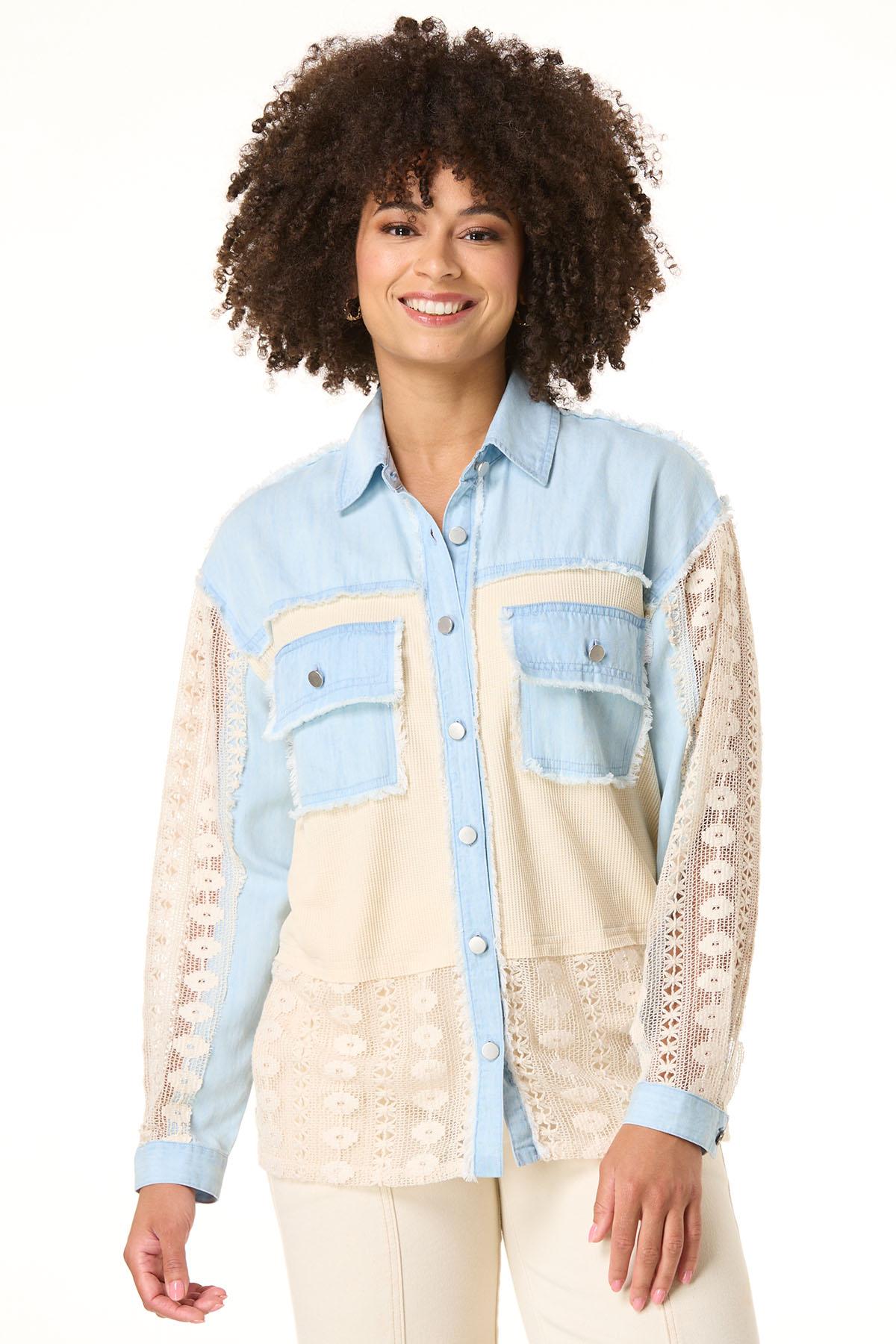 When the temps are calling for a layered look, this button down style is ready for it. Starting with a lightweight, chambray fabric and continuing with a contrasting-waffled texture, lace detail and frayed trim, this relaxed look is just what those basics need for a chic, warmed-up finish.