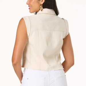 You’ll love the layered look of this darling denim vest with a distressed hem, beige hue, button down closure, double front pockets and frayed hem for a cool, carefree and trending finish.