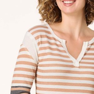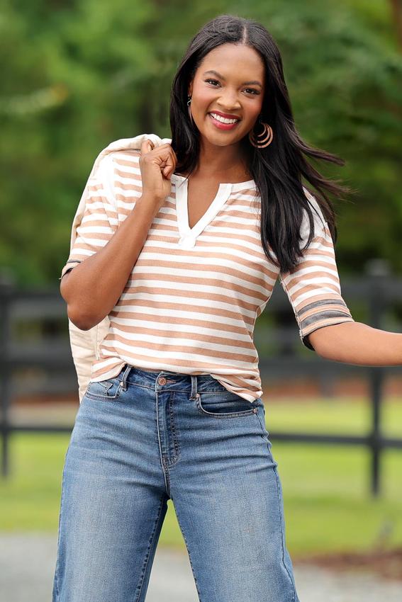 It’s a home run with this one. As a classic stripe print and shades of beige bring a timeless vibe, the soft feel and baseball-style silhouette create a look that’s weekend-worthy and denim-day ready. Now, let’s play ball!