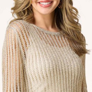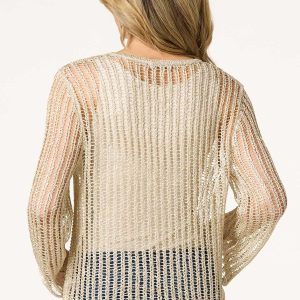 This breezy-breathable style is so perfect for summer. Super lightweight open-stitch fabric features a beige hue, a crew neckline, long sleeves and an all-over shiny sequin embellishment for a sweater that’s a perfect layering look, cover-up or any style you choose.