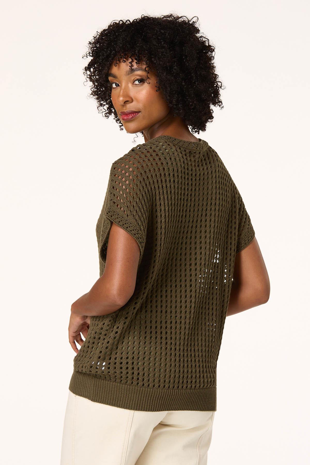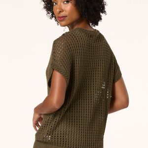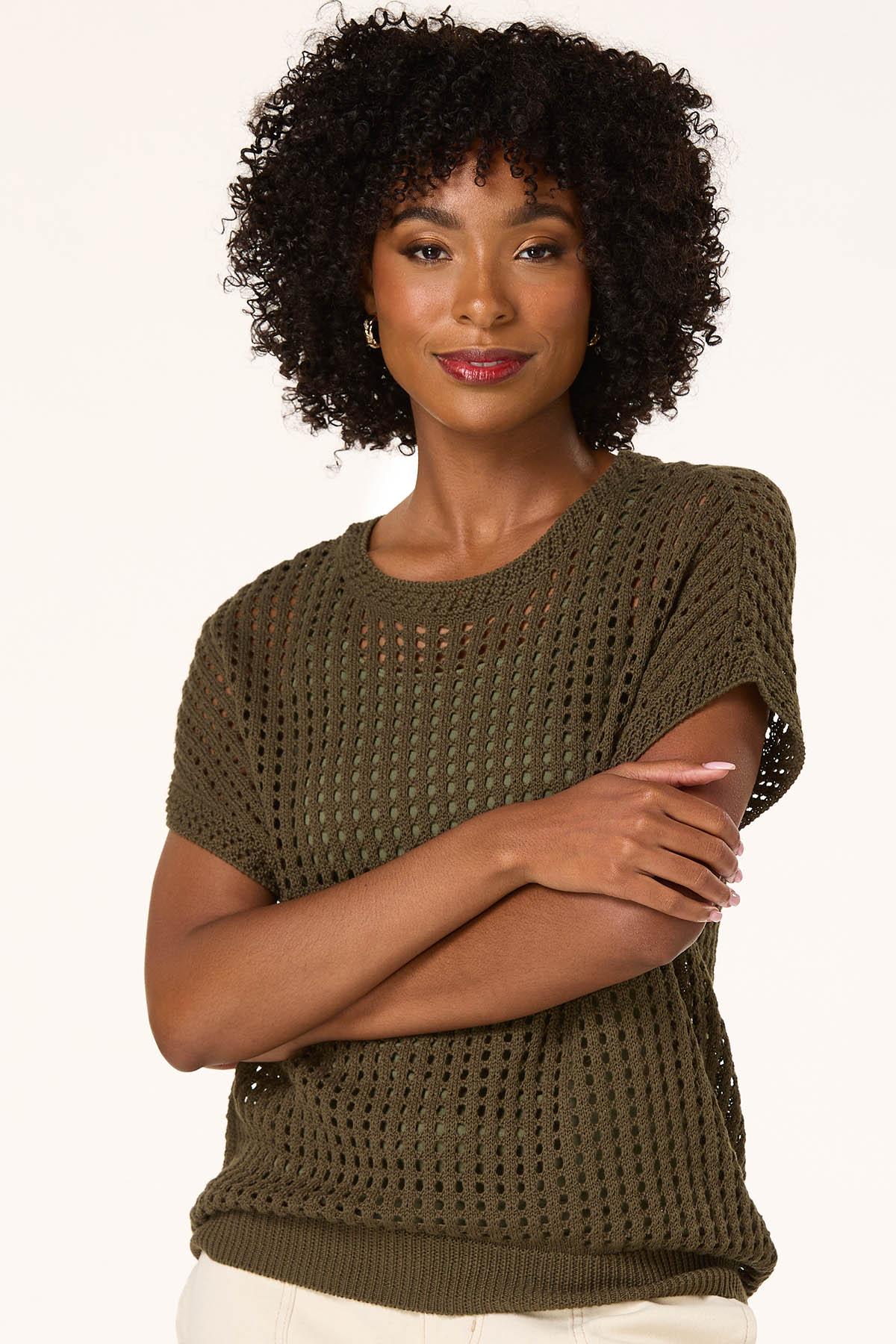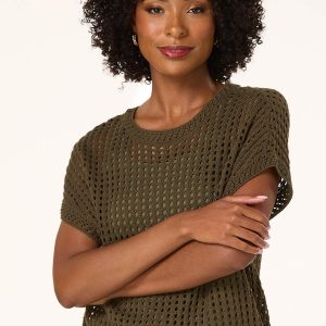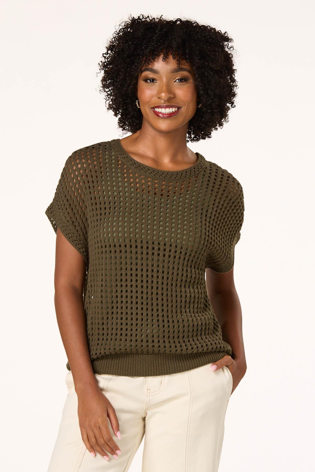 Transition into cooler temps with this trending style, featuring a scoop neckline, relaxed fit and an open stitch in an olive green hue. A simple cami and your favorite jeans will make this look complete for those fall-ready moments.