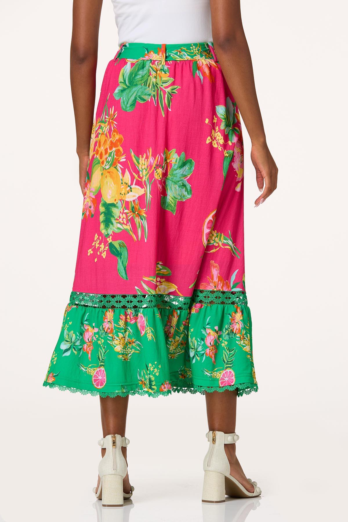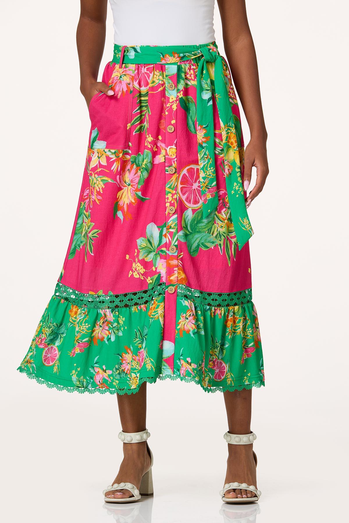 Made you look! We thought this would catch your eye. Part of our Cato Collection, this limited edition style is a summer pick-me-up with its cheerful color palette, belted-tie waist, button detail and lace trim. And to top off this limited edition piece is a floral and fruit print for a sweet finish.