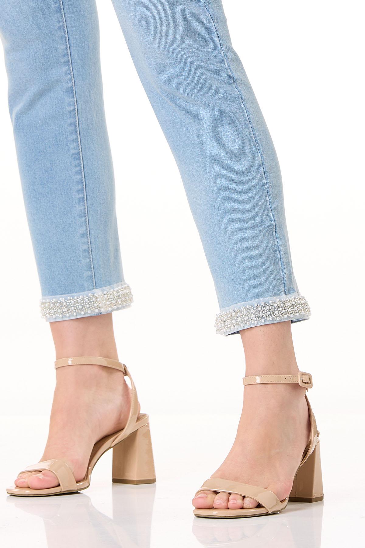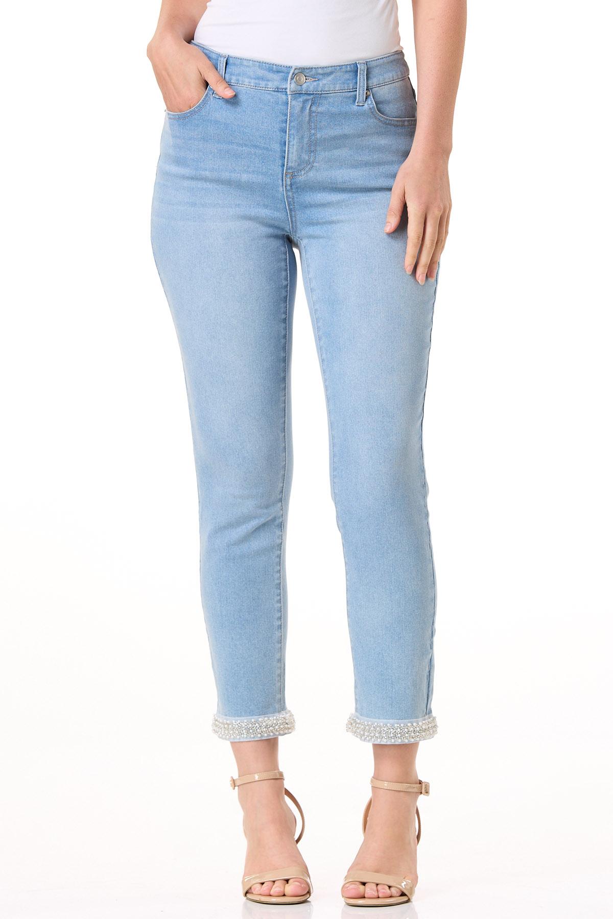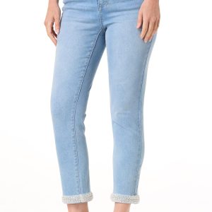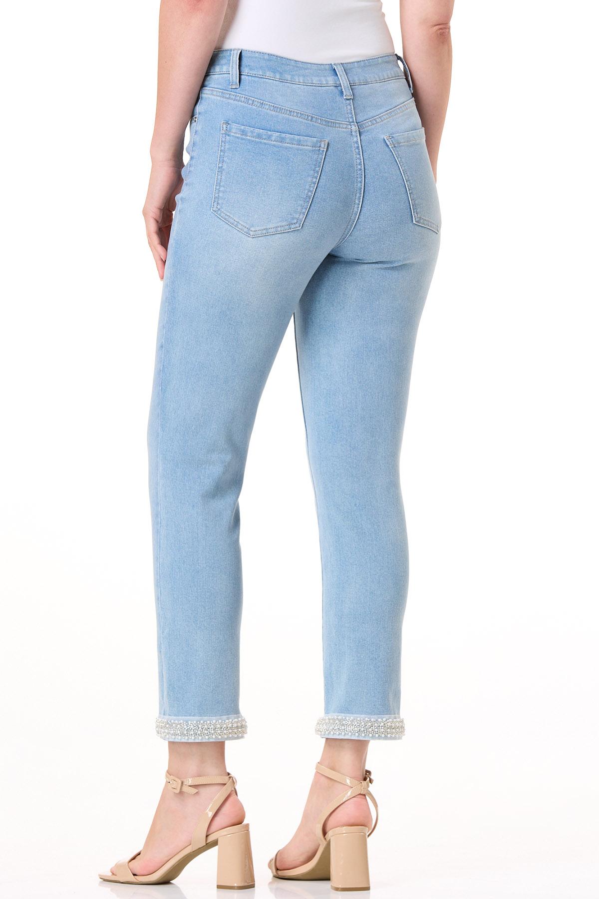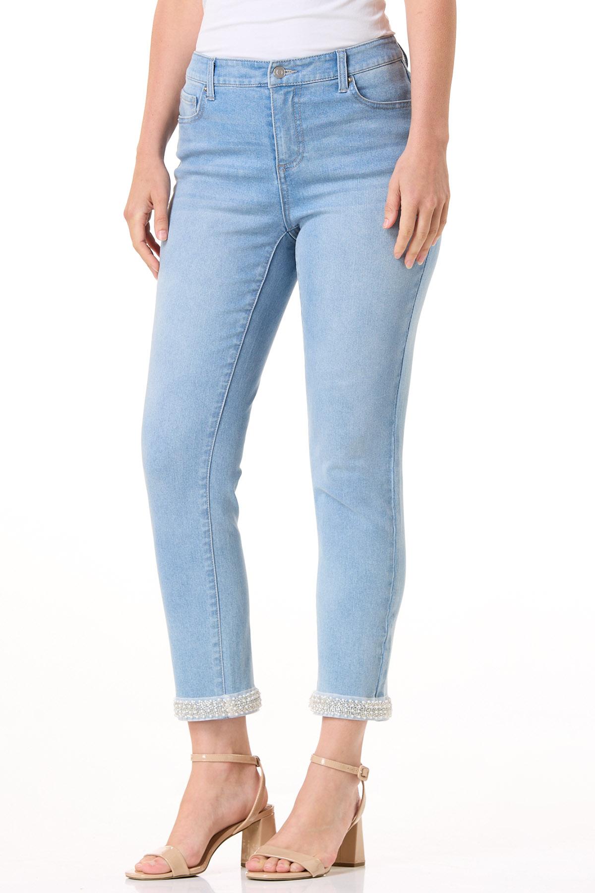 Add a touch of glam to your denim rotation with these light-wash fashion jeans. Cut in a straight-leg silhouette and ankle length, they’re finished with pearl-embellished hems for a subtle statement that shines.