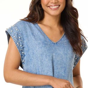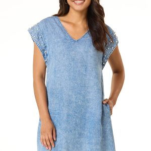 Pearl Trim Denim Shift Dress
