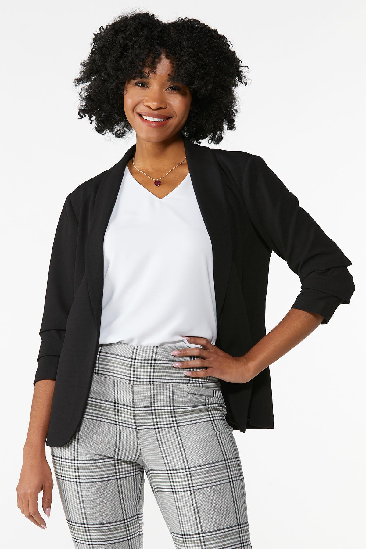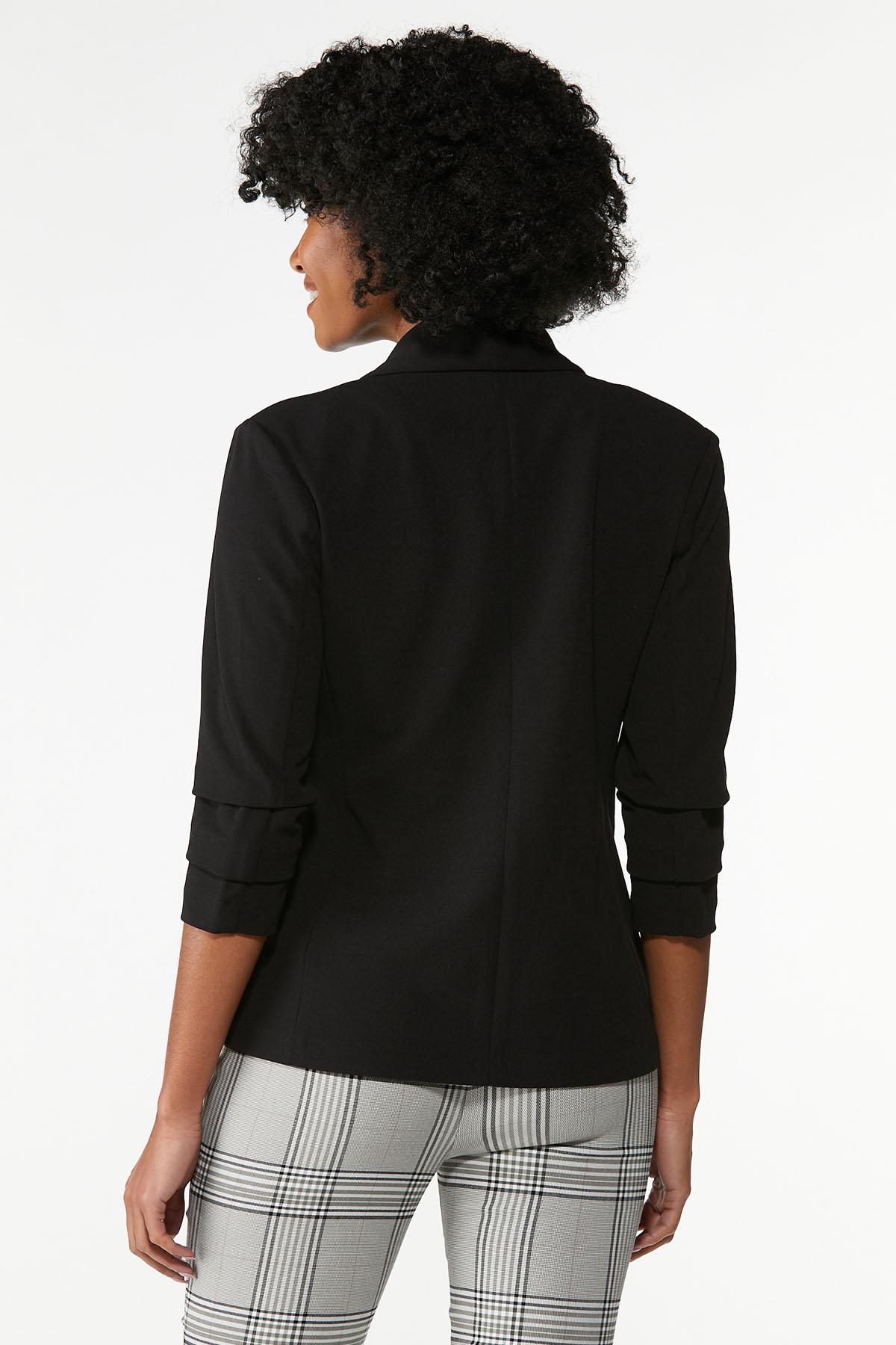 Shoulder pads lend structure to this crisp, crepe blazer, framed with ruched sleeves.