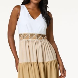 From summer vacations to dinner with your favorites, you’ll love making this sweet style a part of your plans. A v-neckline, colorblock design, crochet inset, shades of beige and side pockets are the darling details that will leave you smitten with this one.