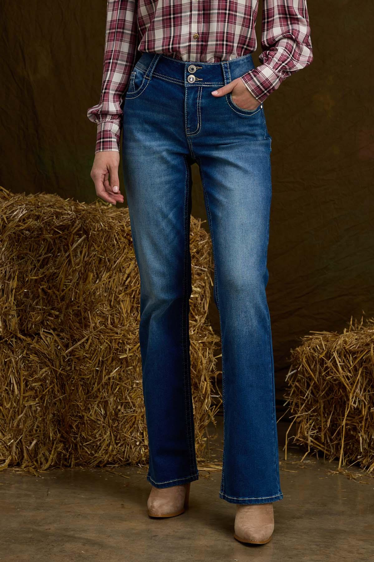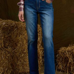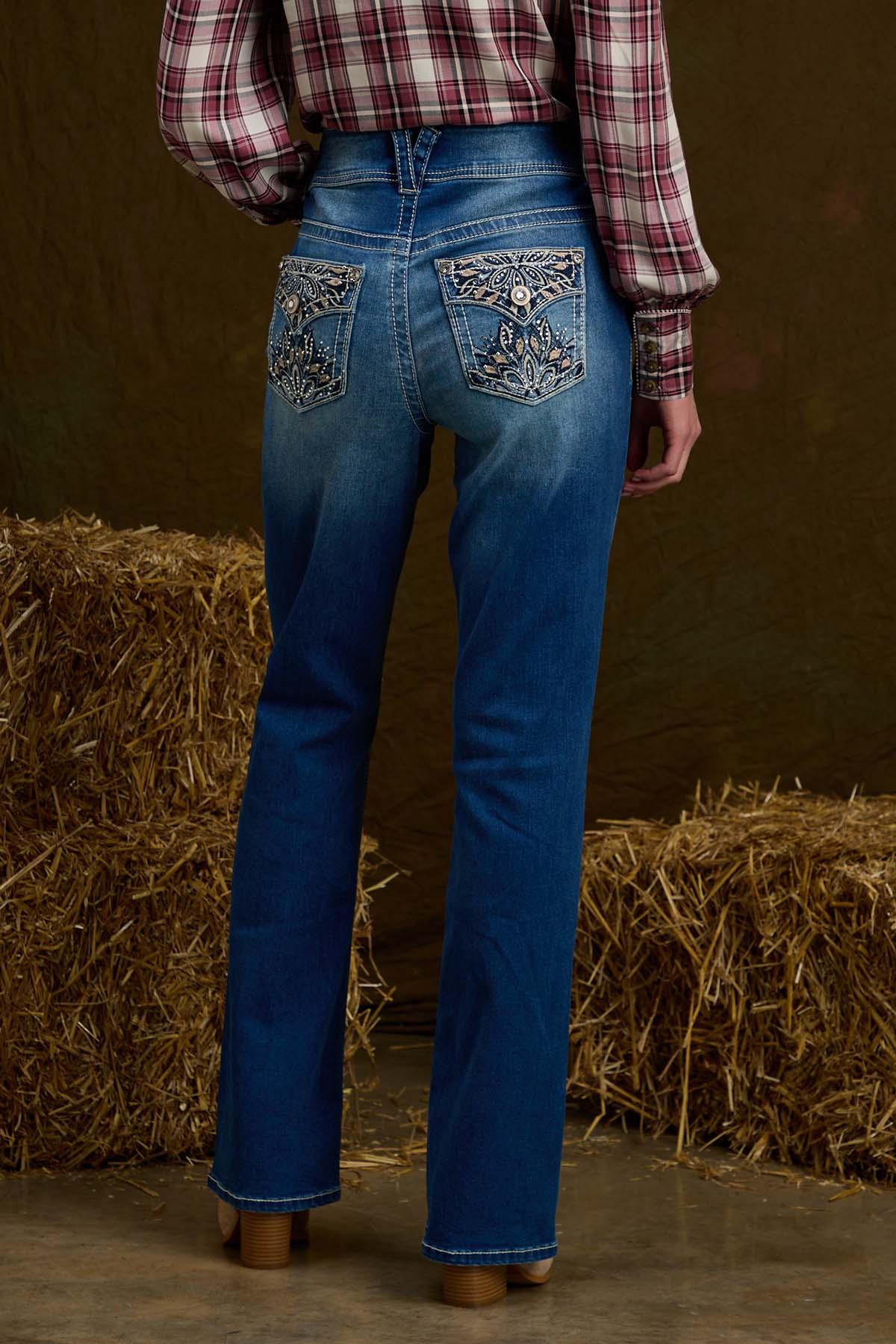 It’s off to the rodeo or your favorite country concert with this dazzling denim style. Designed to fit your curves just perfectly, these bootcut jeans feature a faded-blue hue, contrast-white stitching and back pockets with embroidery and rhinestone detail.