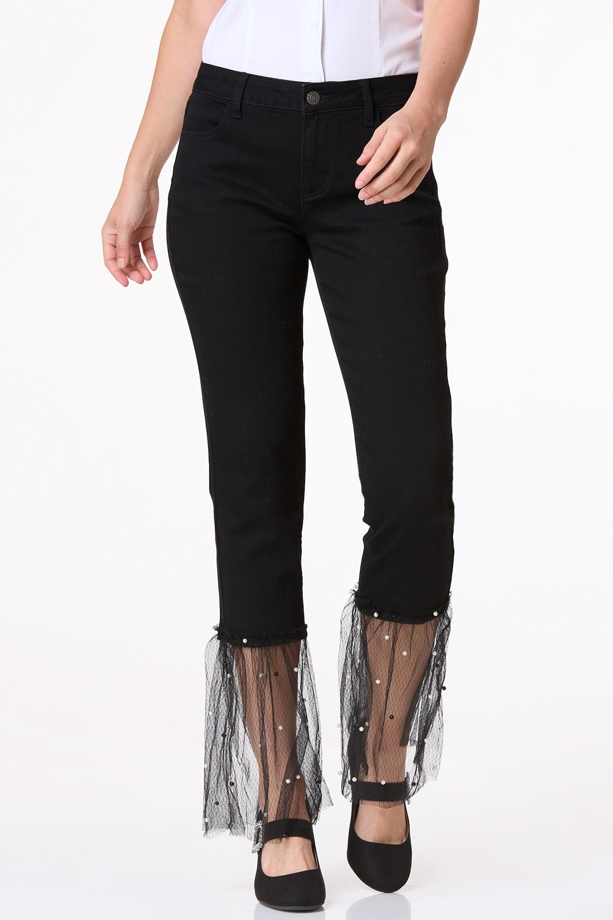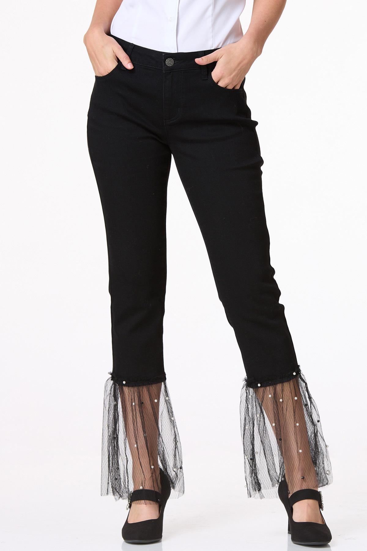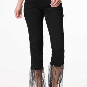 Catch them looking twice when you show up wearing this statement style. A mid-rise waist, stretchy fit and solid hue are topped off by a mesh flare hem, adorned with pearl detail. Think jeans are just basic – think again with this so-chic look you don’t want to miss.