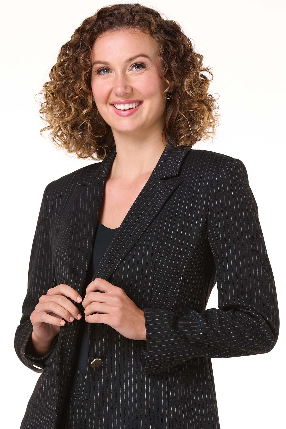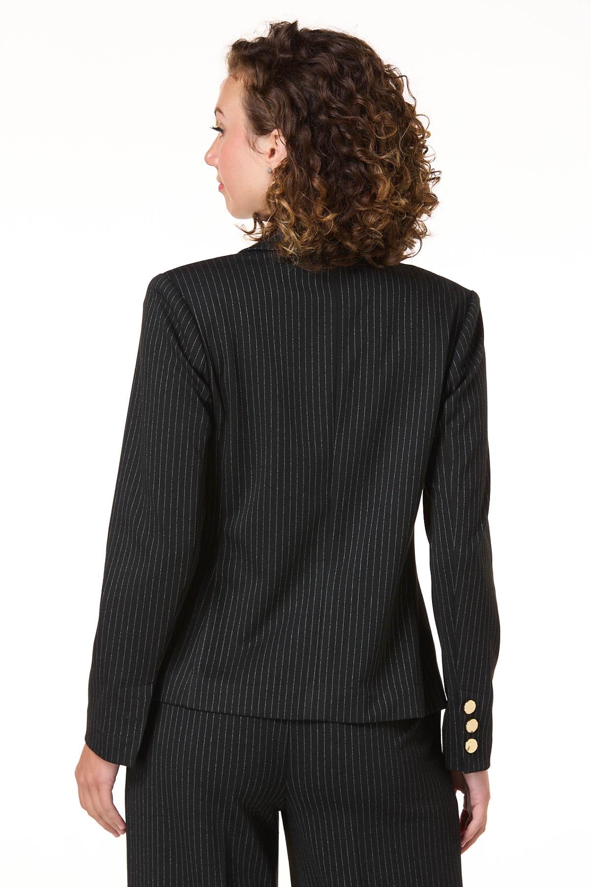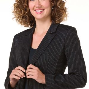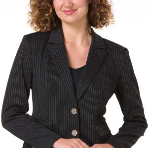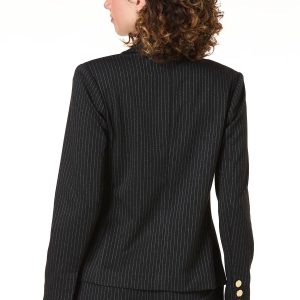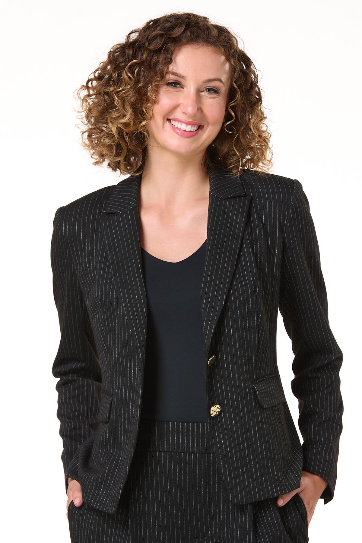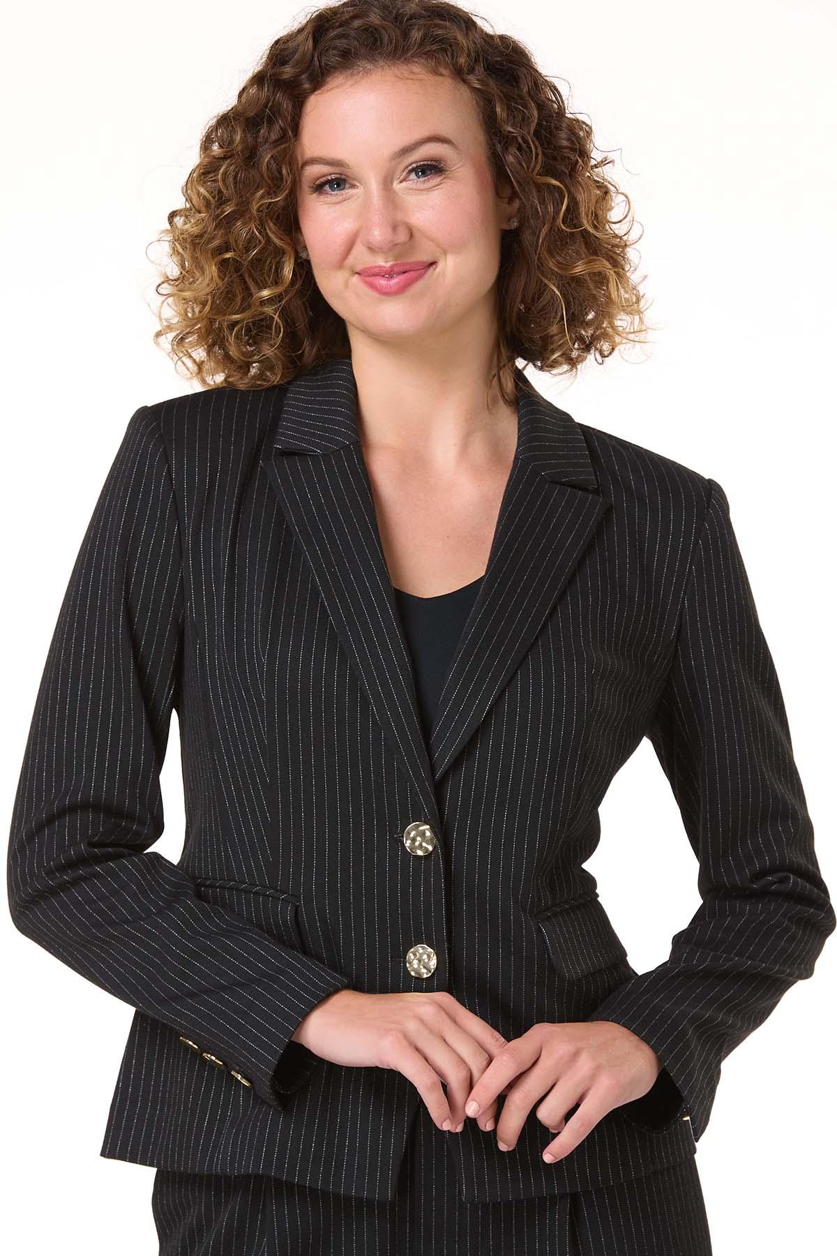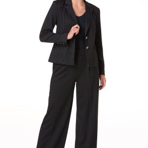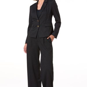 This black and white pinstripe blazer brings confidence to your closet. For a look that means business, it pairs seamlessly with the matching pinstripe pants. Want to dial it down? Throw it over a crisp white tee and your favorite bootcut jeans – just add sneakers and a belt for a cool, off-duty vibe.