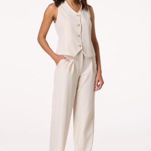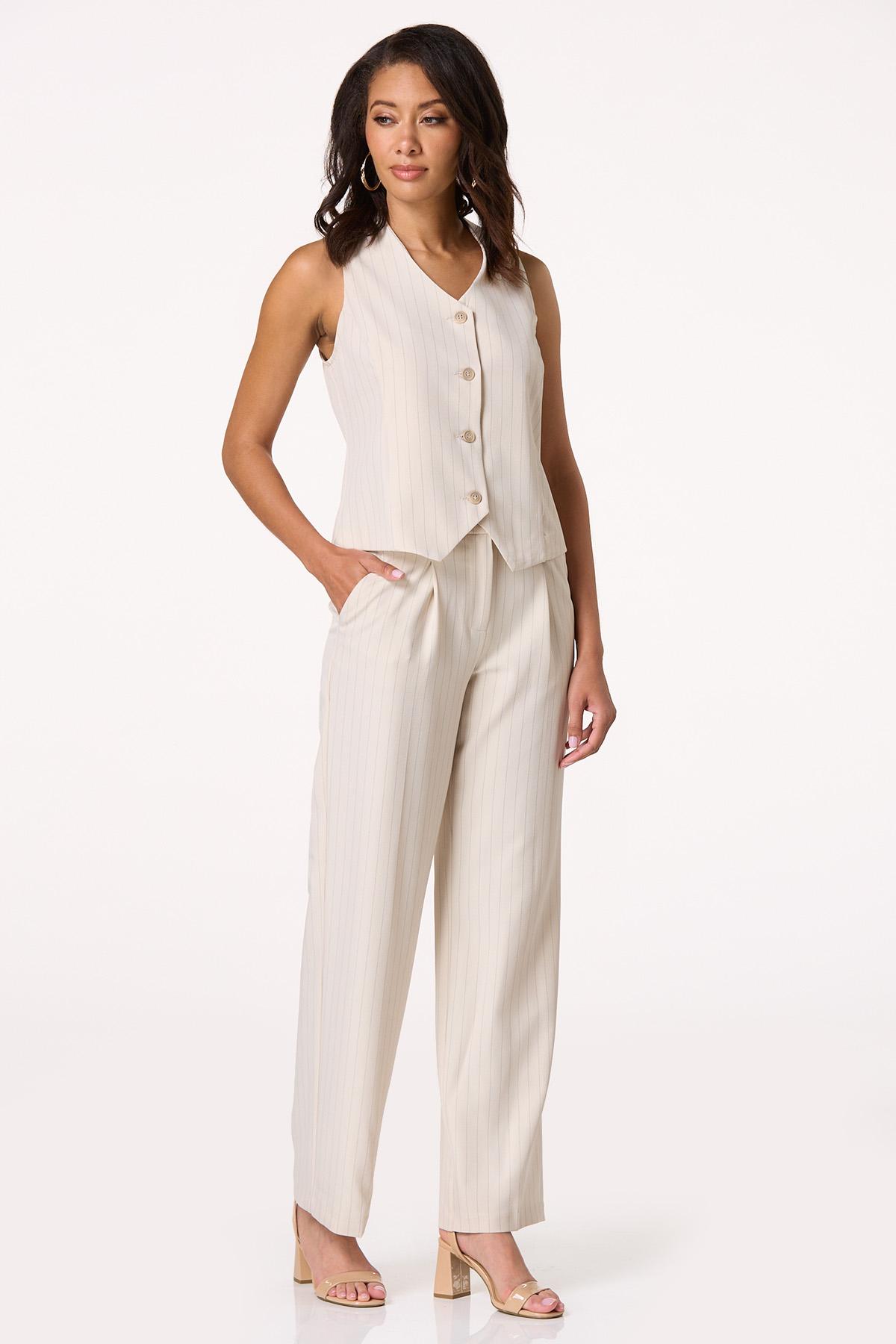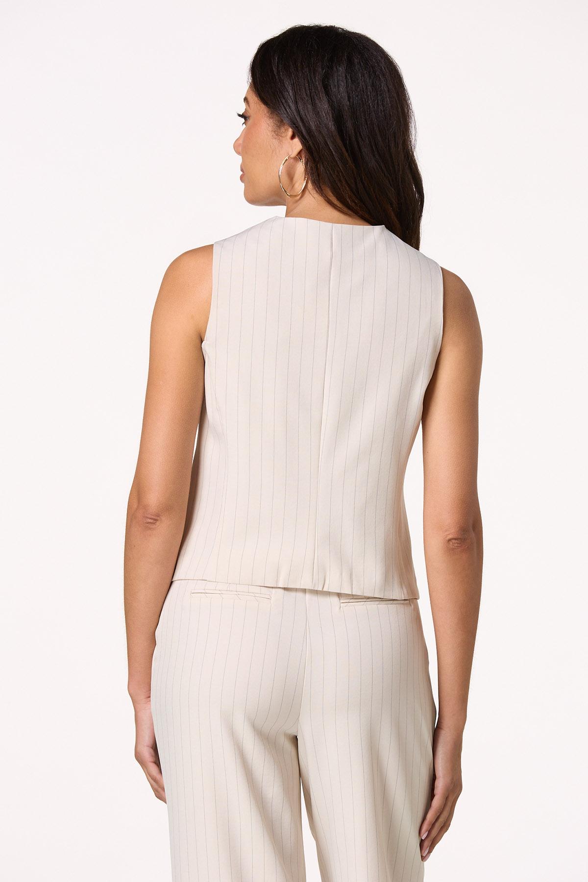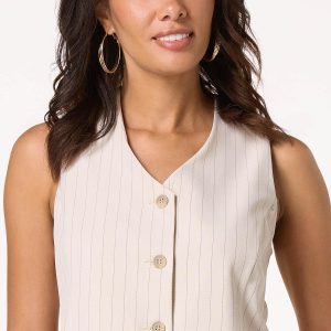Dress things up a bit with this trending, sleeveless style, featuring a pinstripe print, button front closure and natural hue. Pair with a basic tank and jeans or elevate your look even more with our matching pants for a chic, sophisticated vibe.