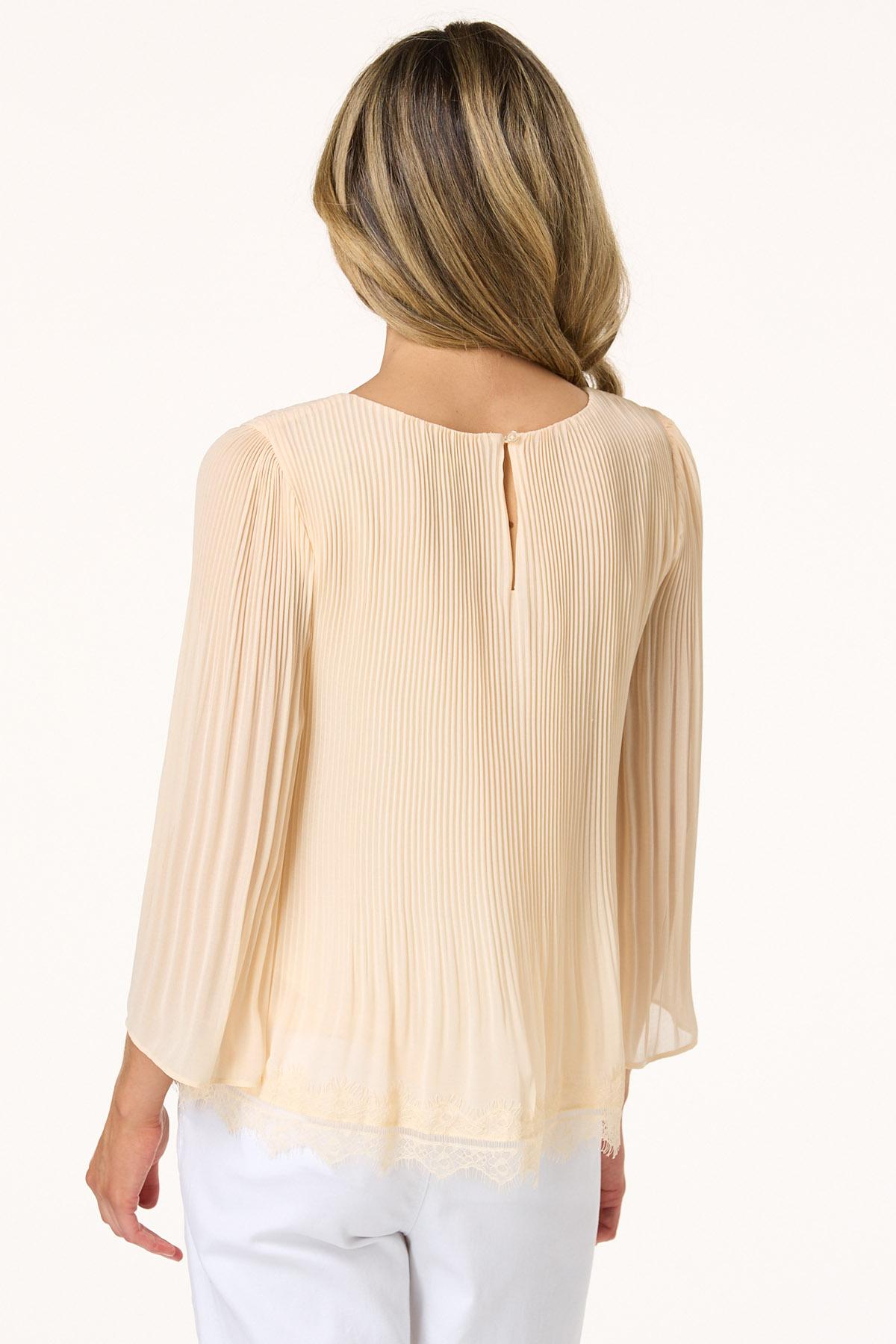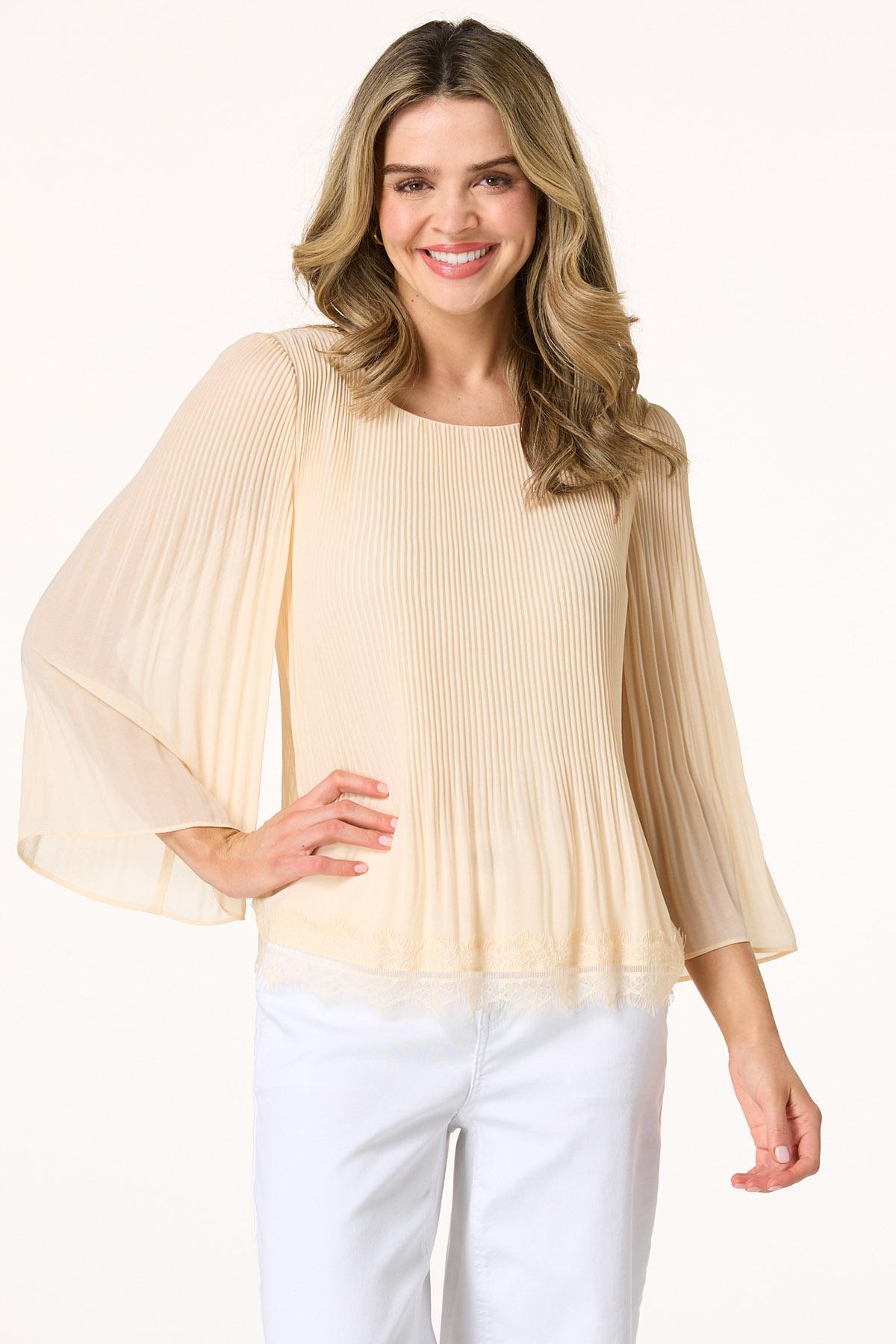 Such a sweet addition to wear to the office, dinner or anywhere else you’re looking to add a little charm to your day or night is this dreamy top. A lightweight-pleated overlay, lace trim and light-sandy hue are the details that bring an icing on the cake finish to this dressy woven style.