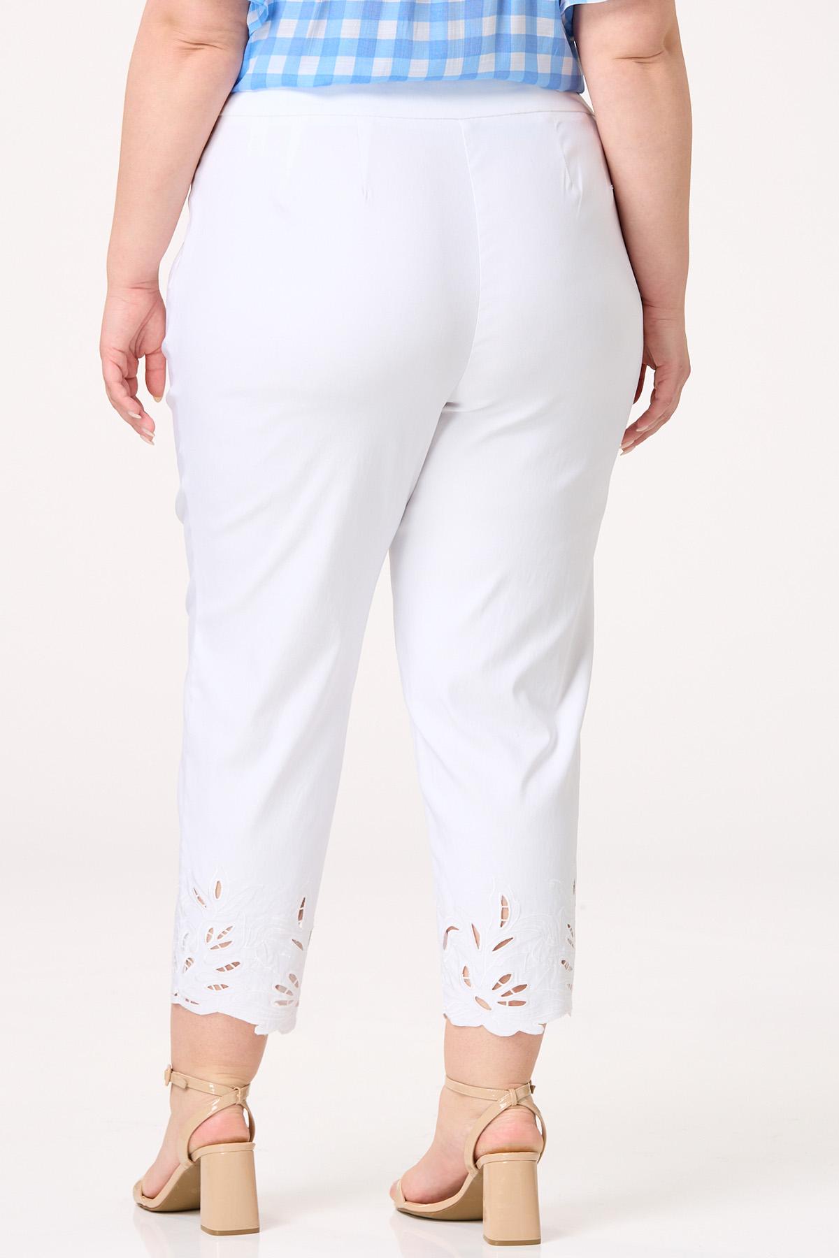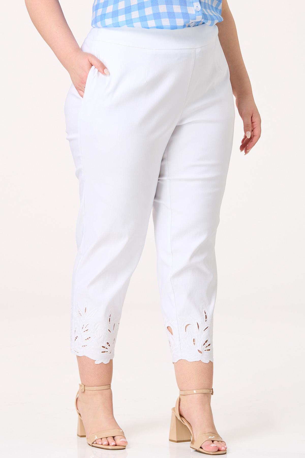 Spring style made easy. Lightweight-stretchy bengaline fabric features a pull-on waist, a solid white hue and a floral-embroidered hem design with cut out details and a scalloped trim.
