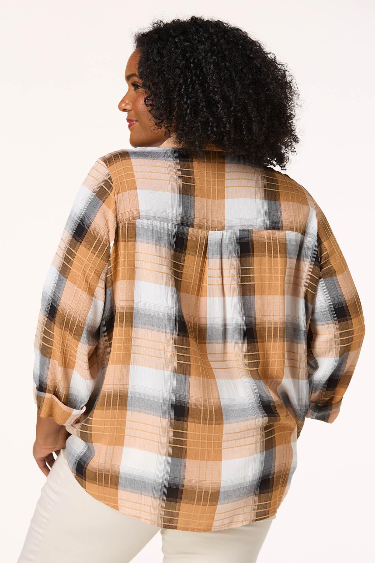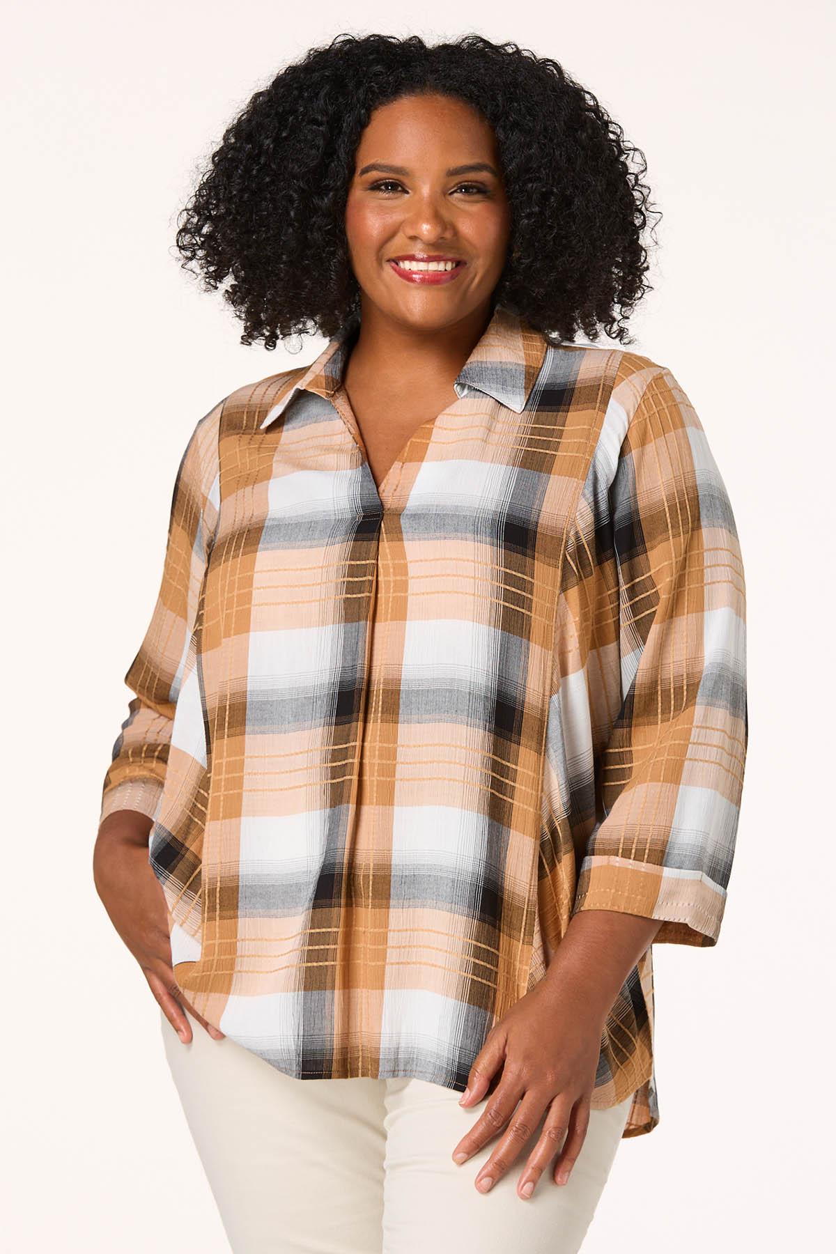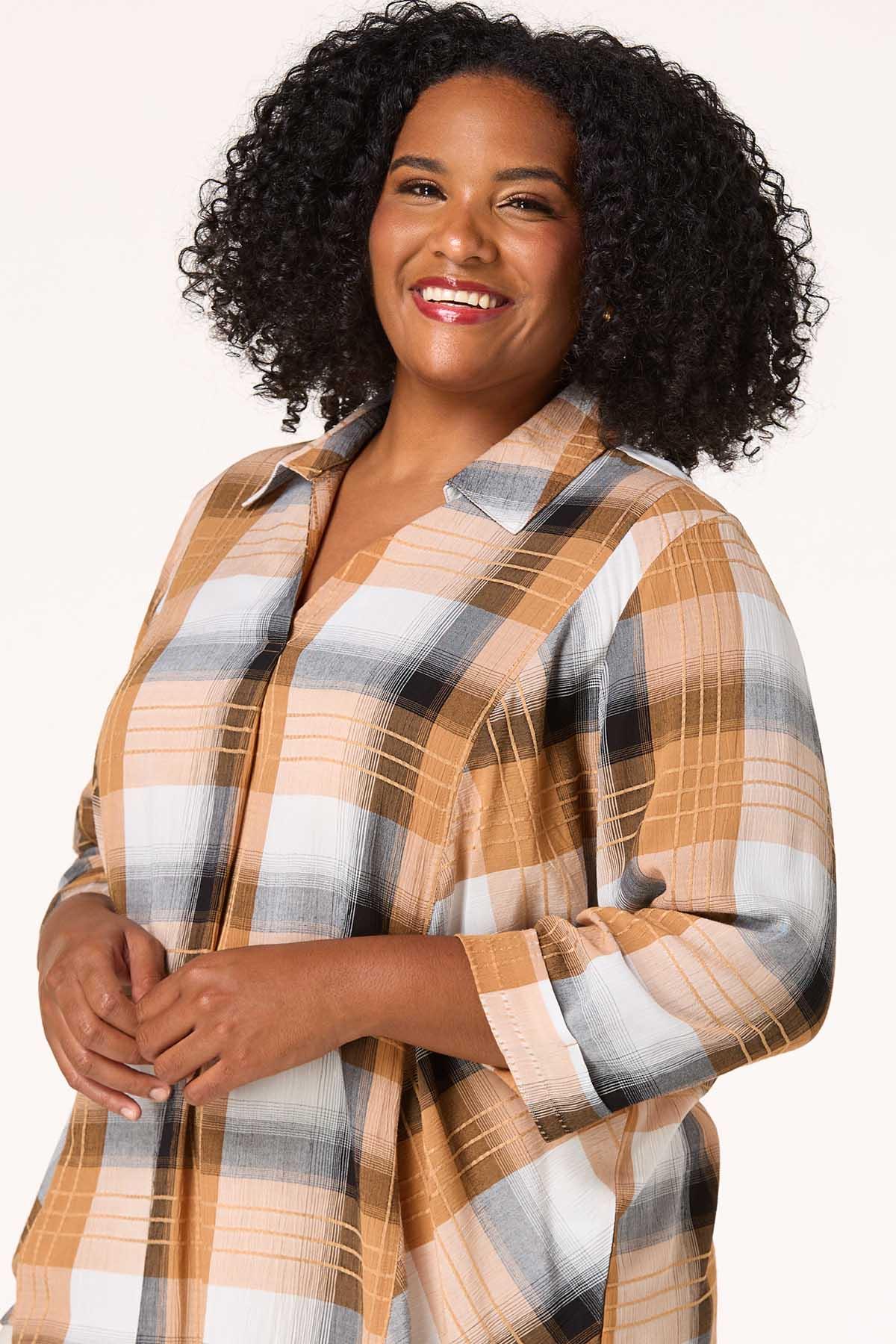 Transition into the season with this soon-to-be fall favorite, featuring a notched, collared neckline, check pattern and shades of black and beige, perfect for summer nights and autumn afternoons.