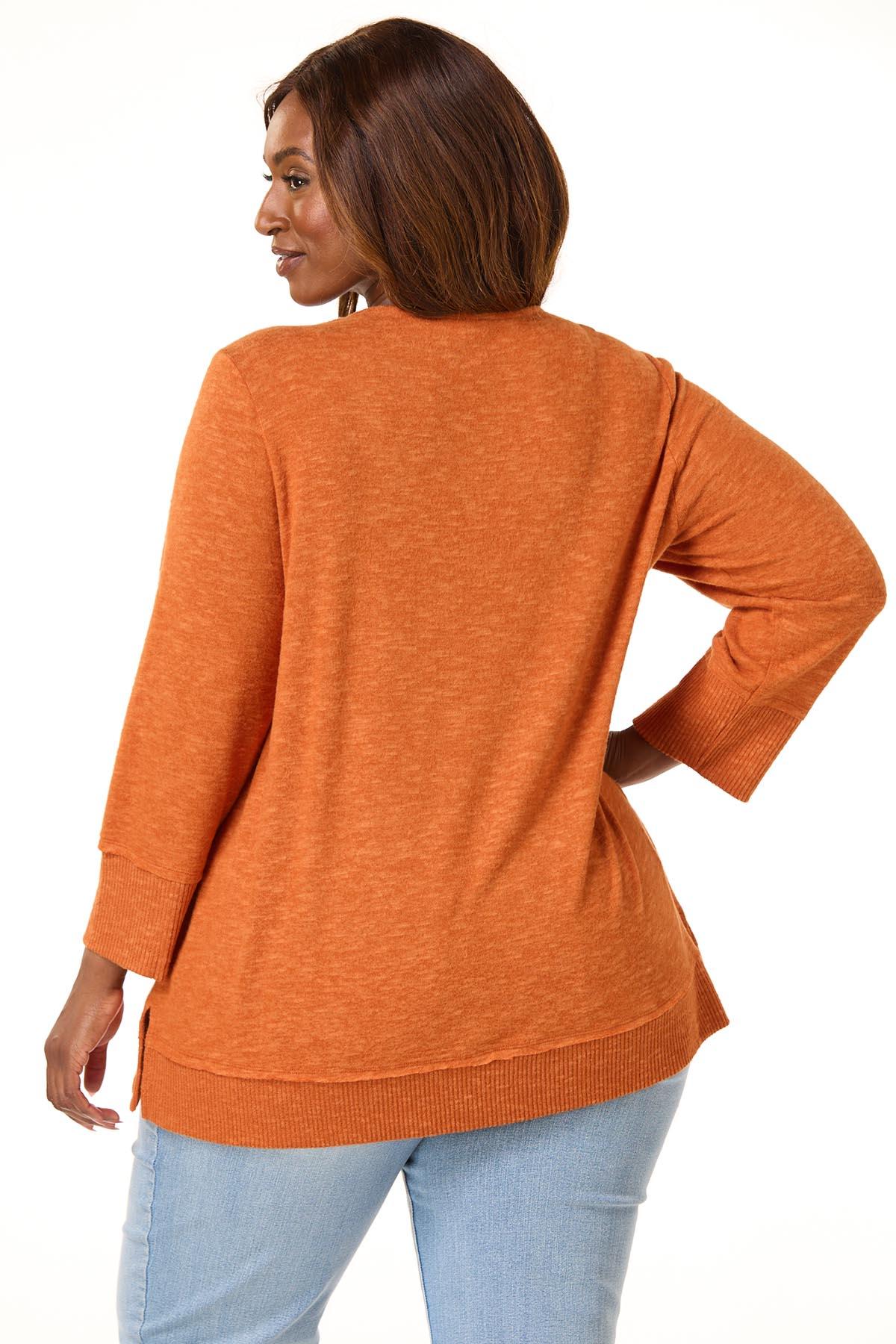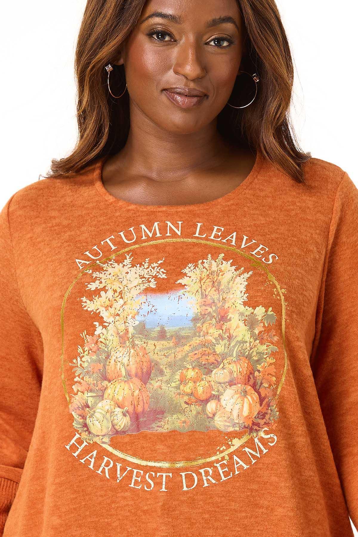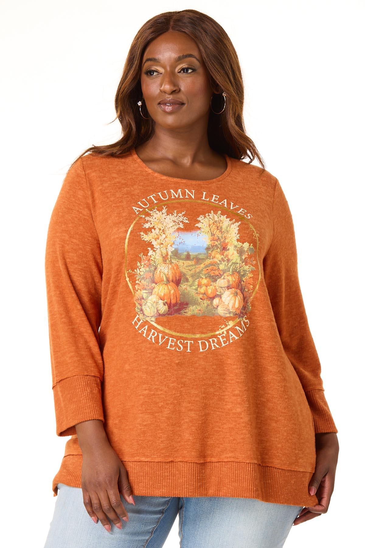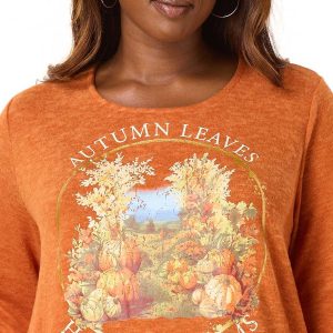 Get excited for fall with this denim-worthy style. A scoop neckline, buttery-soft, hacci knit and autumn leaf graphic come together for a look that fits right into those pumpkin spice latte a cravings and chilly afternoons.