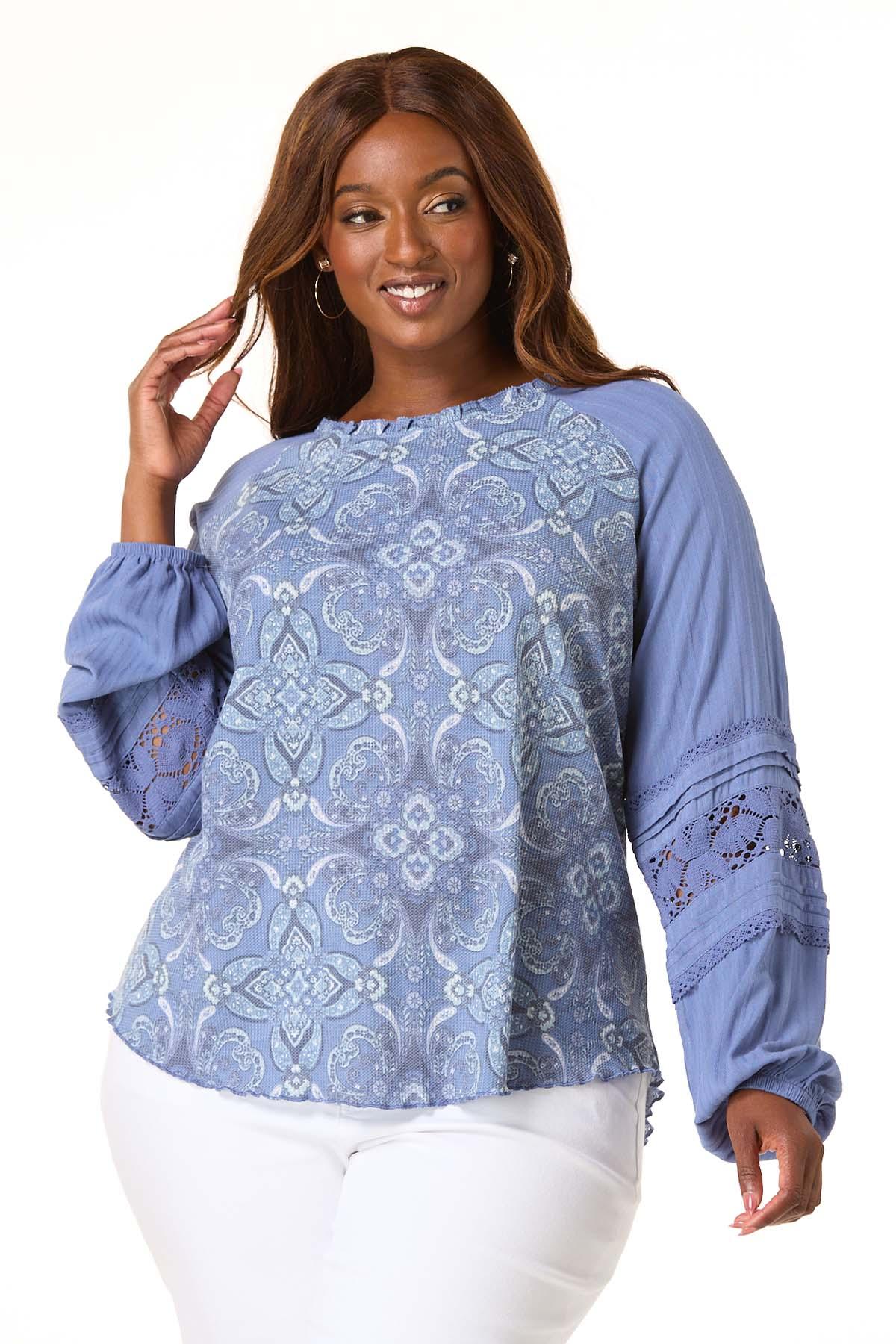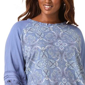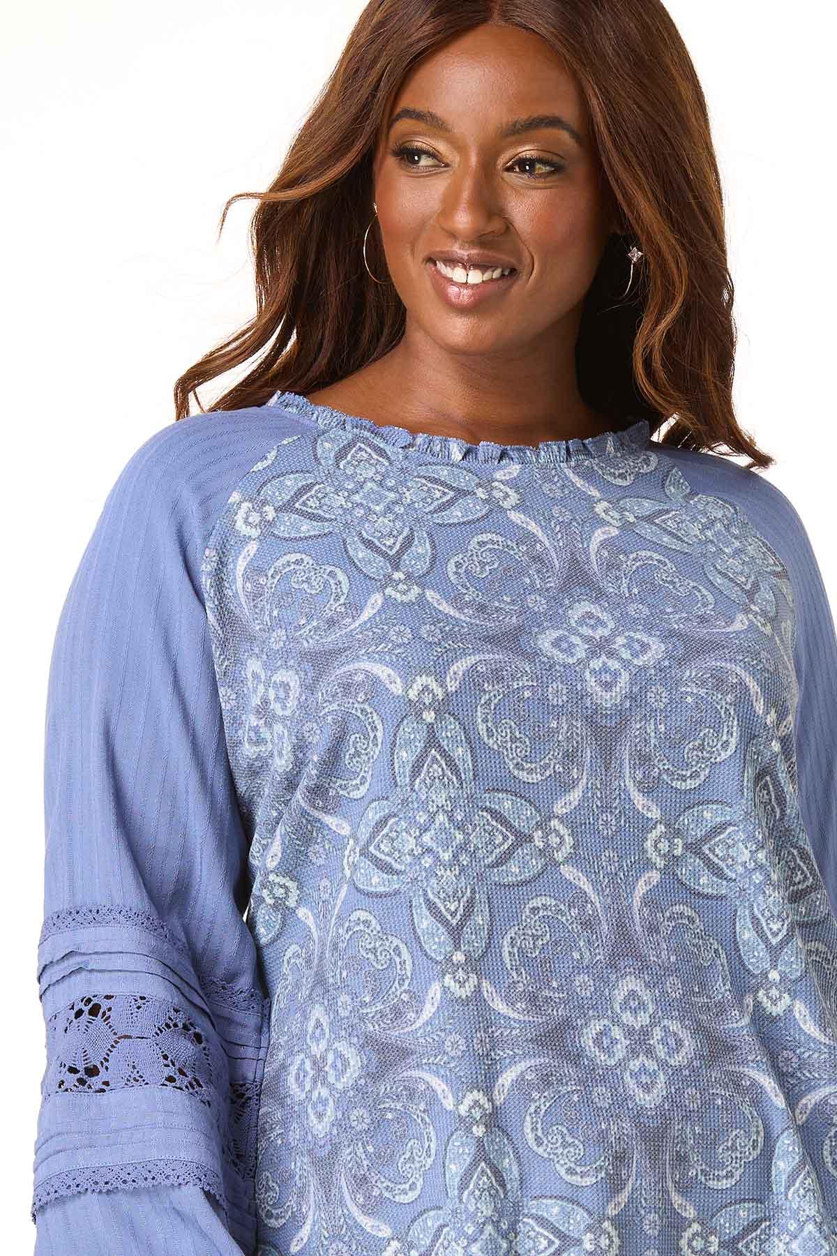 A lightweight top with such lovely details. Stretchy-textured knit fabric features a blue-multi paisley print, a crew neckline with a ruffled trim and a baseball tee-style including solid blue sleeves with a ribbed texture, pleats and a lace trim.