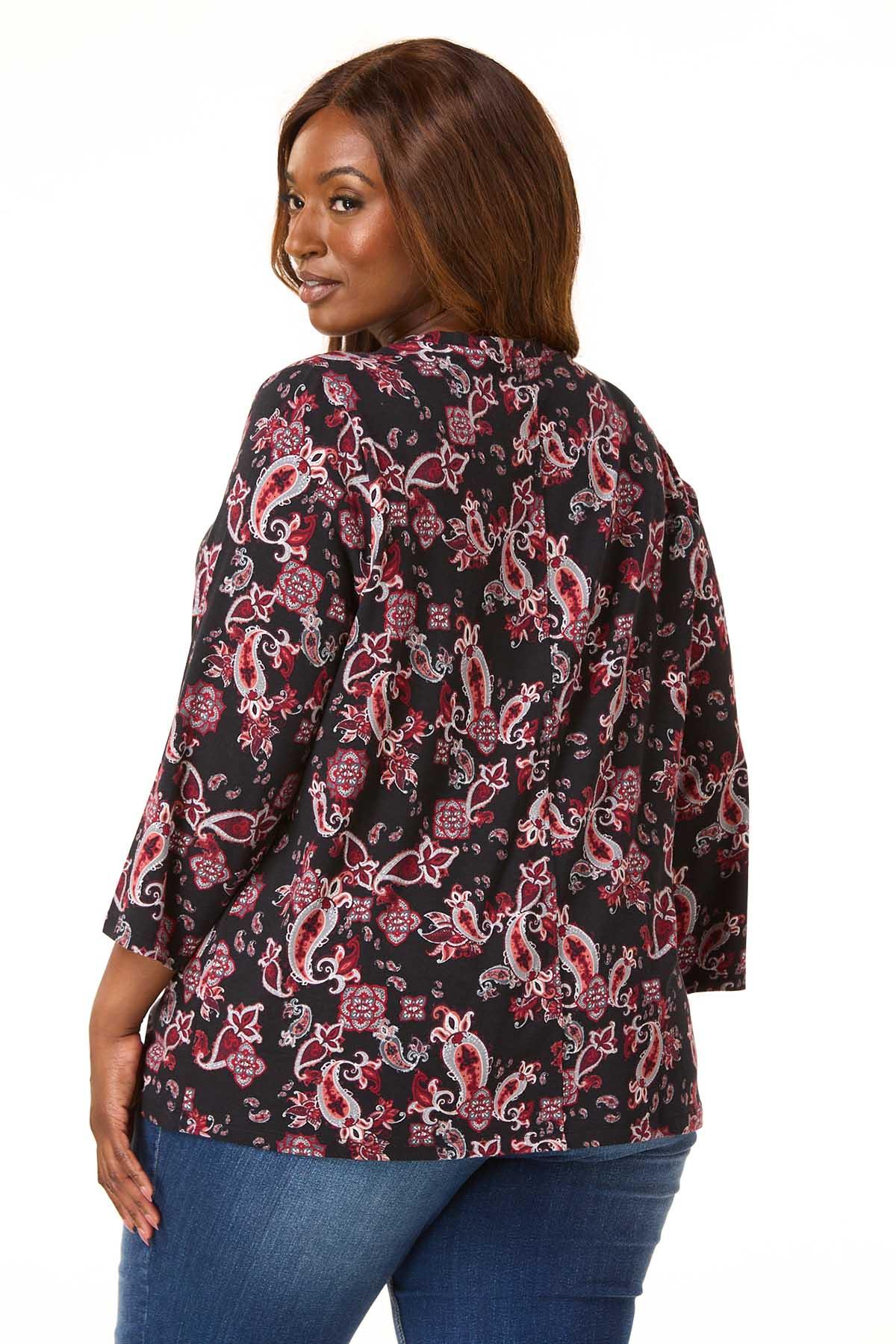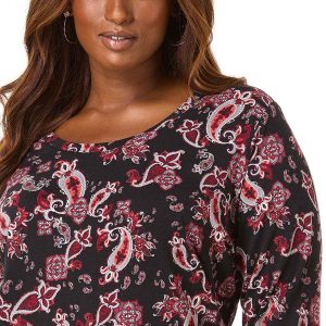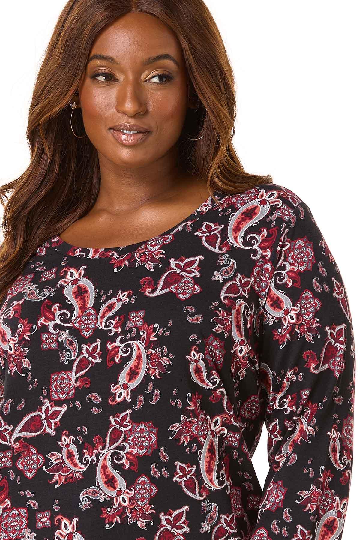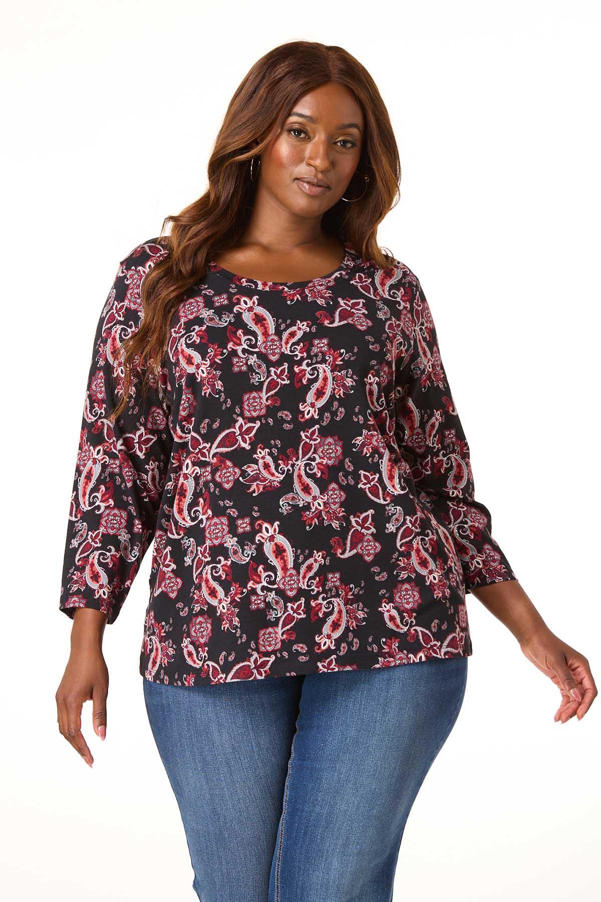 Turn heads in this scoop neck top, featuring a bold red and black paisley print. Crafted from a super soft knit fabric, it’s perfect for casual days with a touch of flair. Finished with flattering 3/4 sleeves for year-round comfort and style.