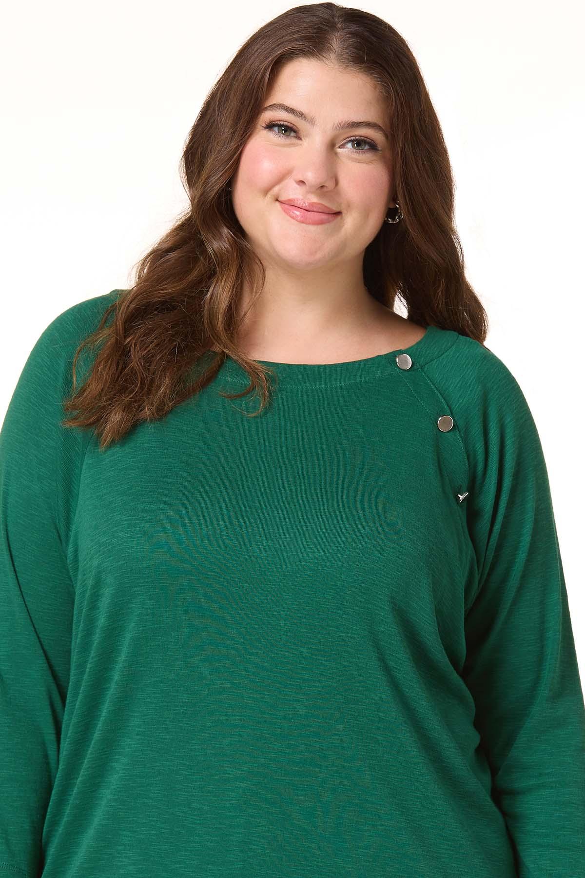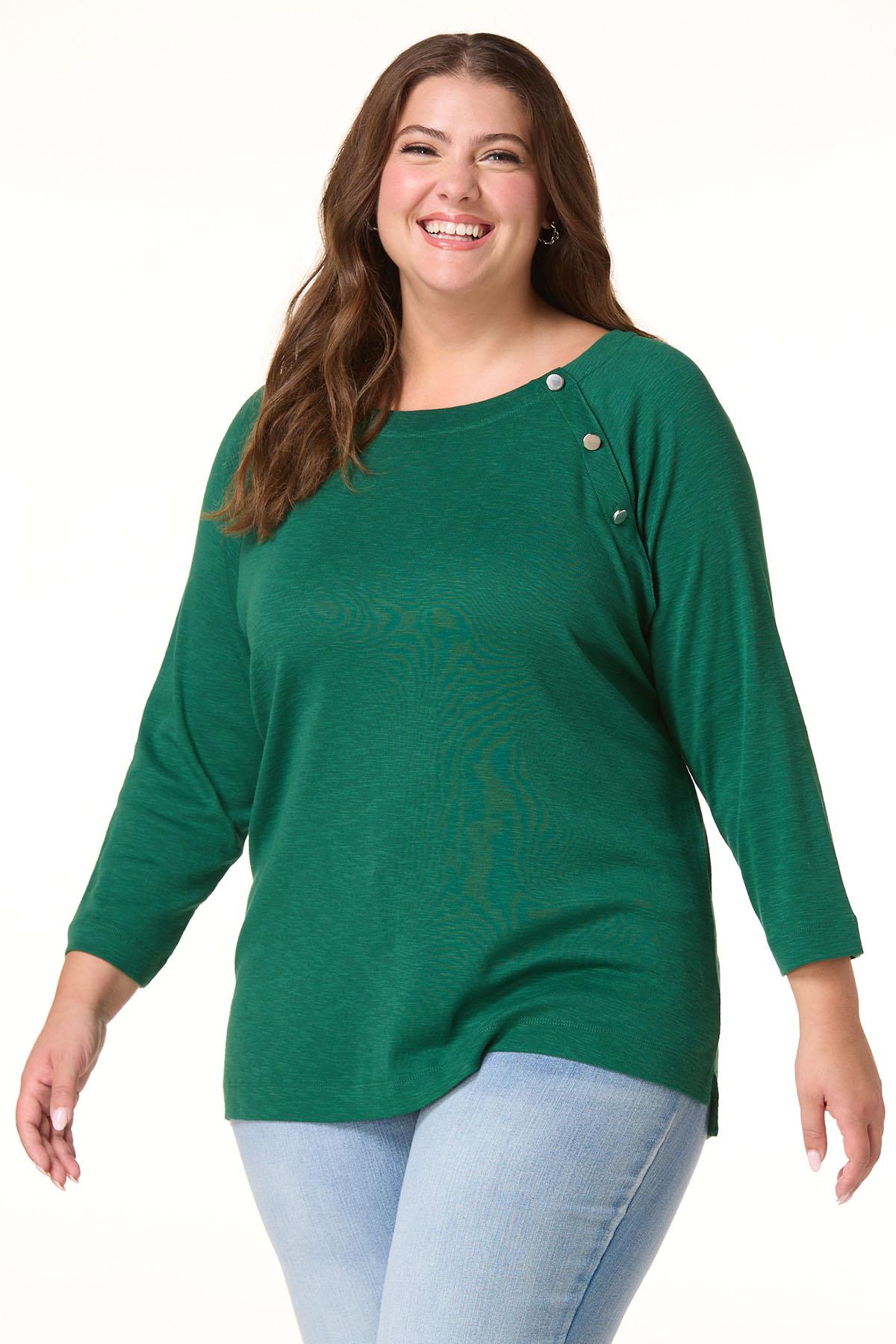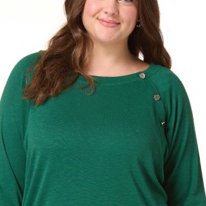 Looking polished and chic are the norm with this soft knit style, featuring a boat neckline, shiny-button detail and a relaxed fit for a look that makes getting dressed for work or play, effortless.