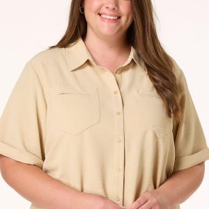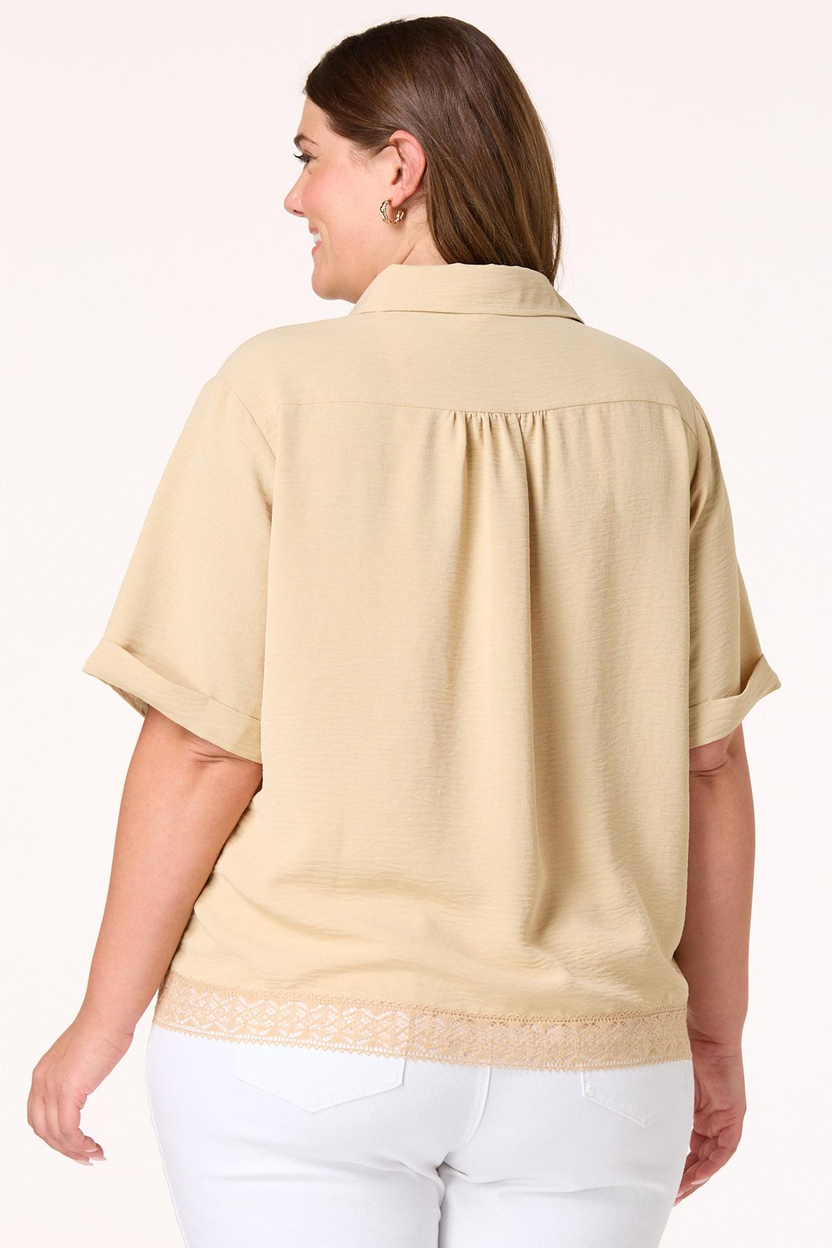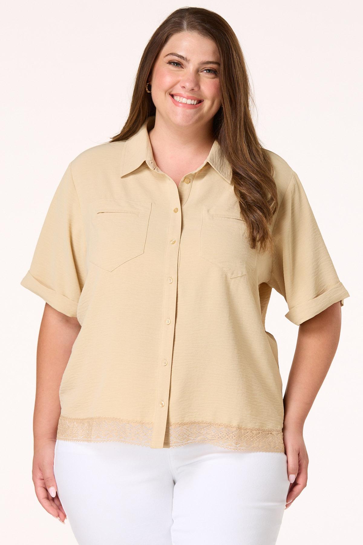 A classic button down look gets a delicate upgrade with this sweet style, featuring a collared neckline, button down front, natural hue and lace trime for a charming finish.