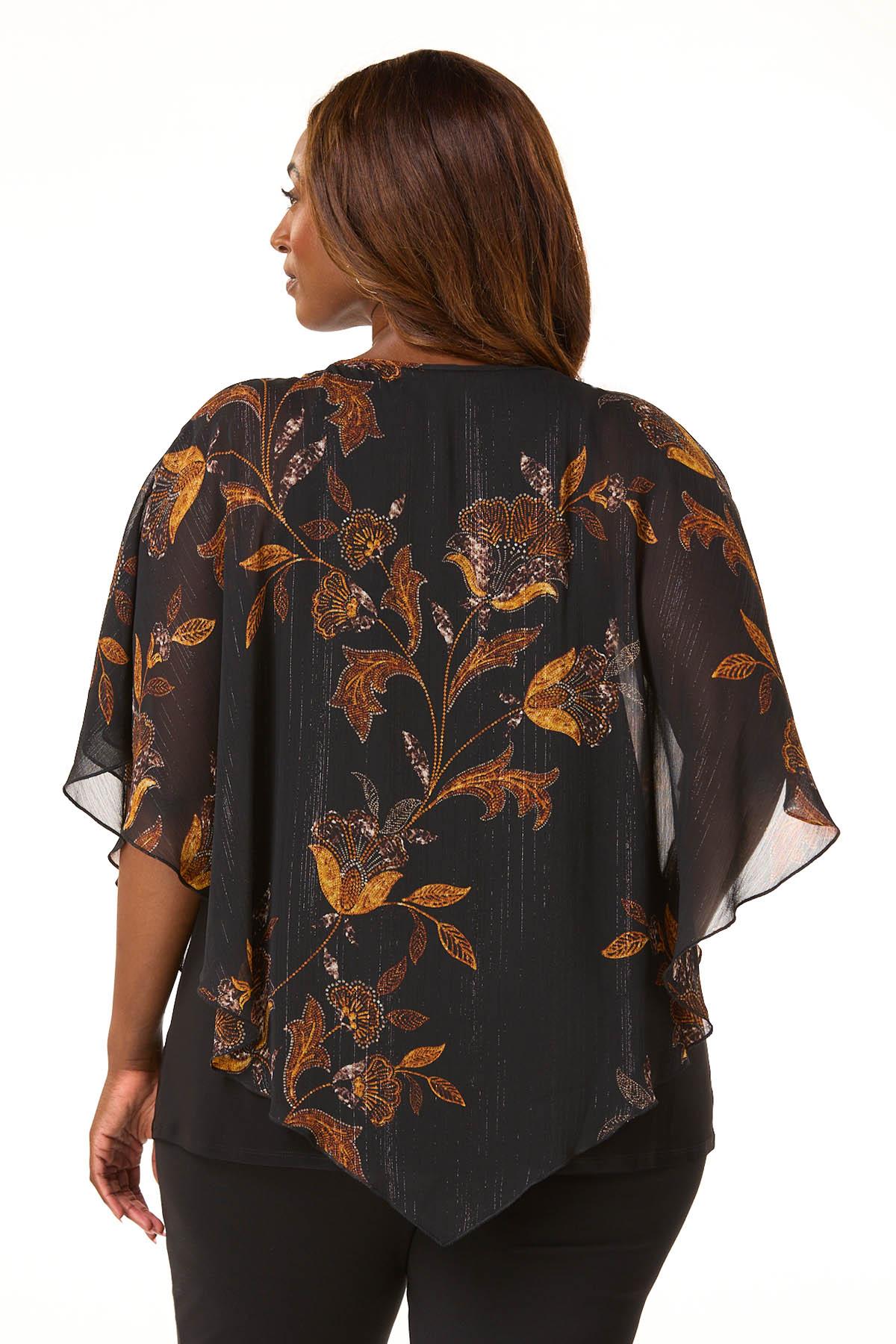 This layered capelet turns heads with its floral design and subtle metallic threading. A gold link neckline adds a touch of hardware, while the lightweight silhouette softens things up and floats with you wherever you go.