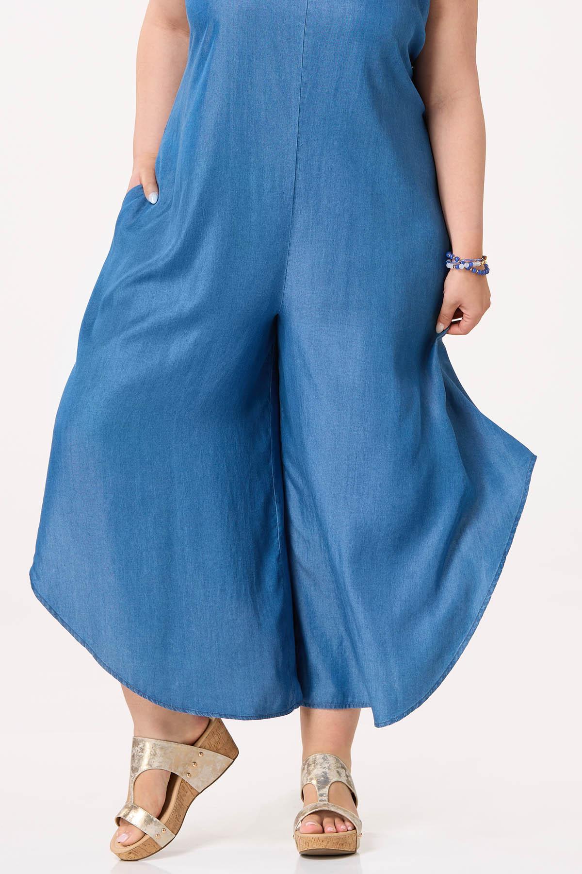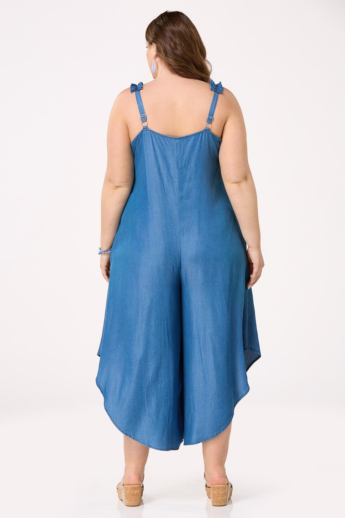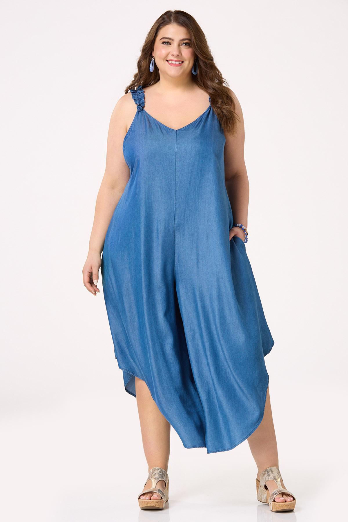 Meet the one you’ll want to live in time and time again with the easy-breezy silhouette of this chambray style, featuring a v-neckline, cool-sleeveless style, denim-blue hue and ruffled straps.