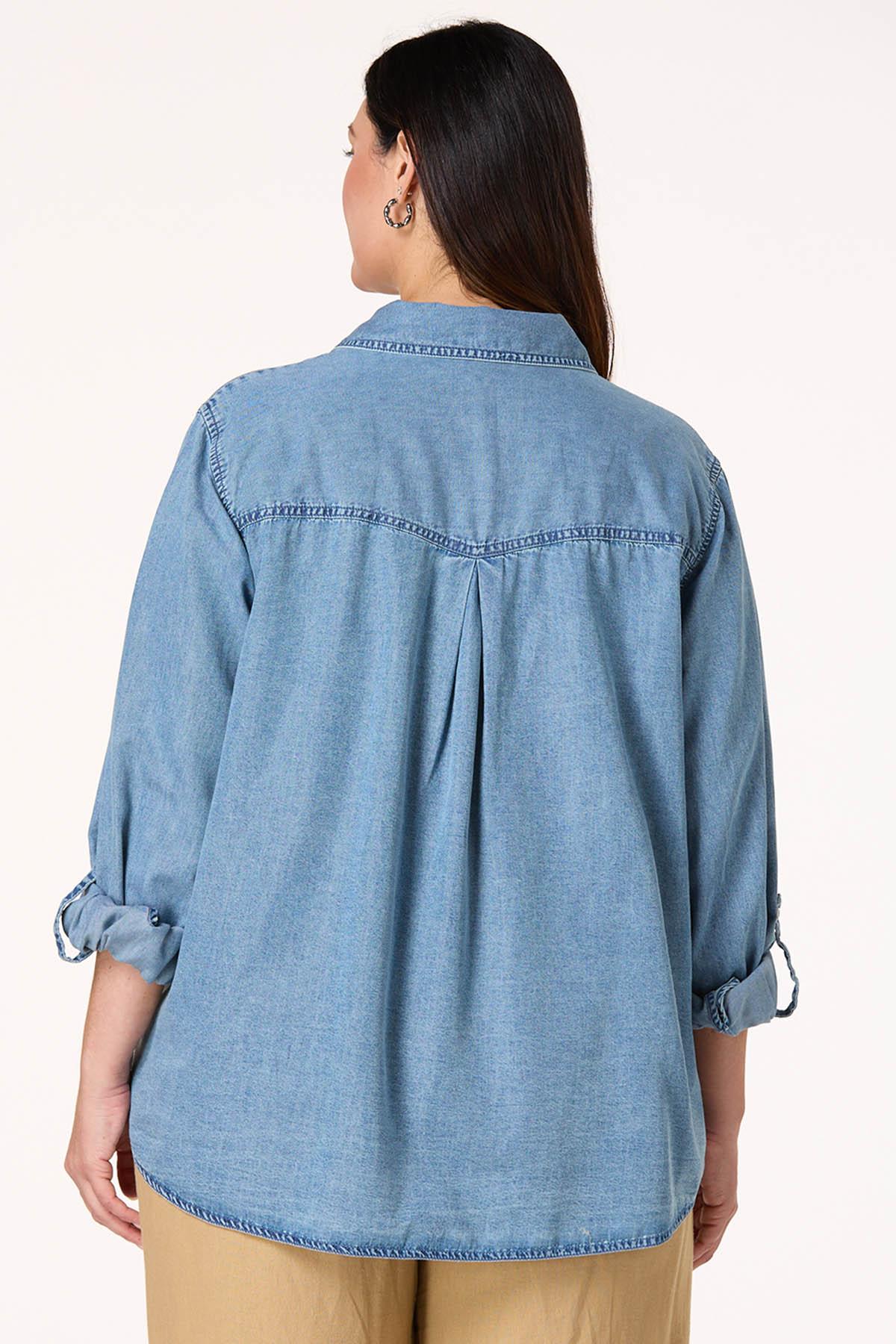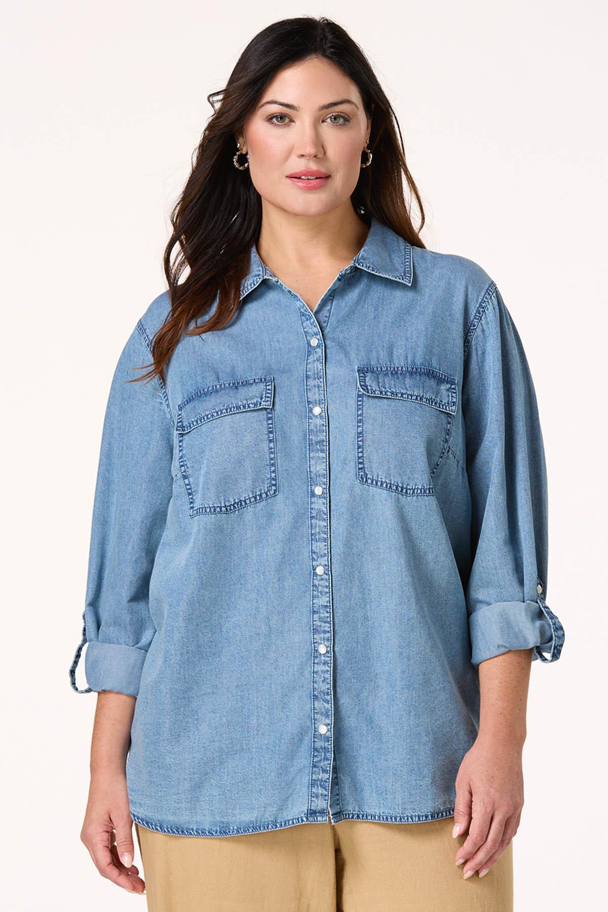 Welcome low-key days and nights with this cool, chambray shirt. Starting with a classic-collared neckline and continuing with a snap down front, double pockets and roll tab sleeves, there are so many ways to style this one. Wear open with a simple tank and jeans or keep it comfy with leggings and sneakers.