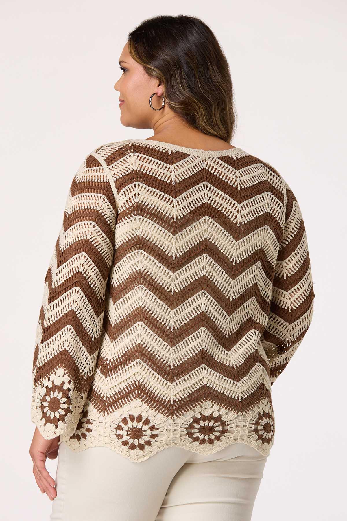 Make it a day for crochet with this pullover style, featuring shades of beige, a scoop neckline, open stitch and a chevron design. A layering tank or cami underneath and a denim favorite are all you need to make this free-spirited look complete.