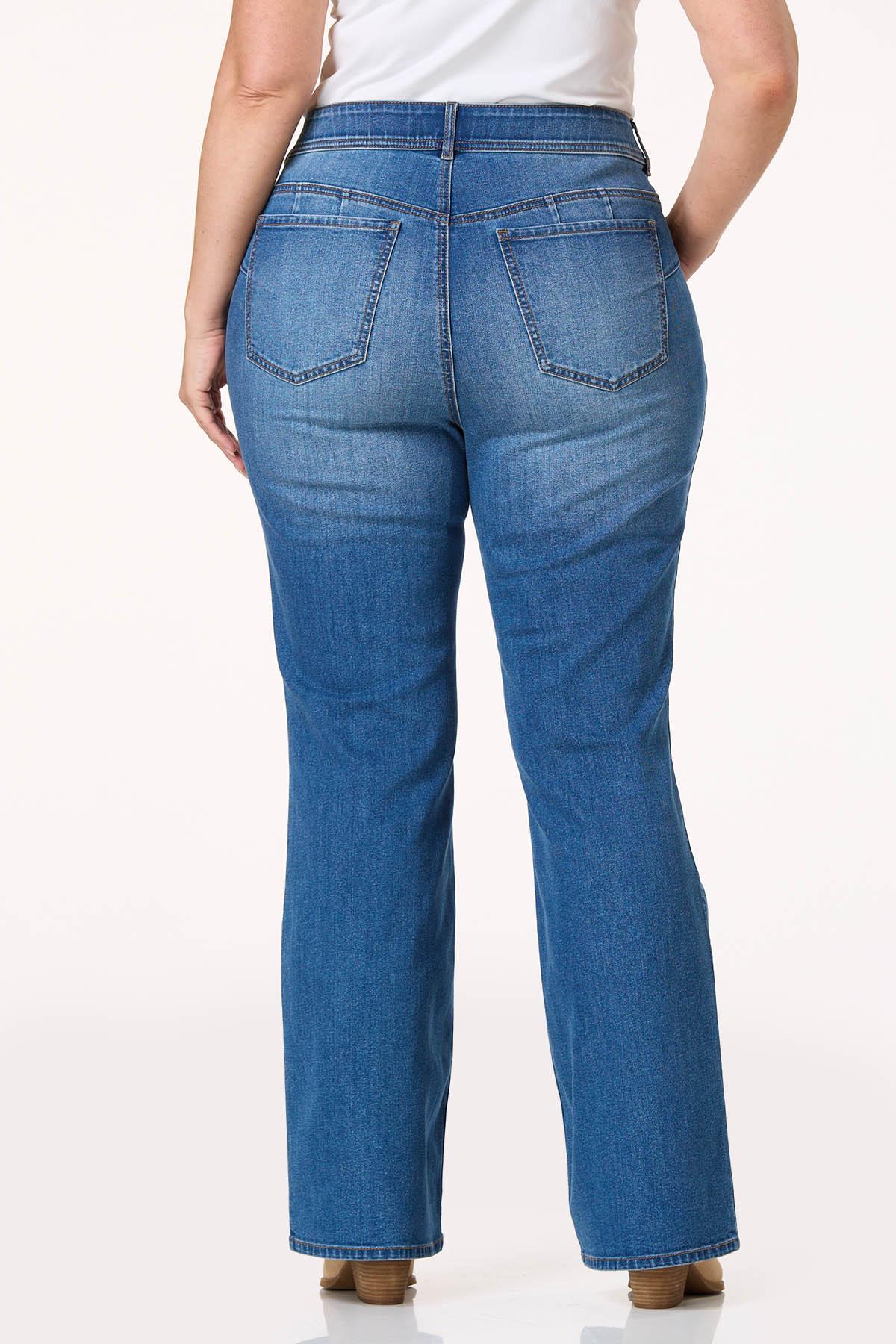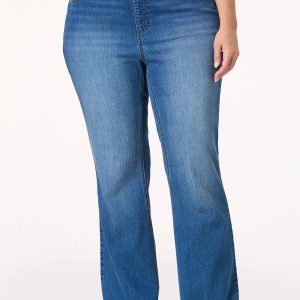 Get comfortable and stay awhile because this curve-friendly, denim style is certainly feeling comfortable, too. A stretchy, pull-on waist meets a bootcut hem, while a faded-blue hue and overall-stretchy fit makes them a dream-come-true when it comes to a favorite pair of blues.