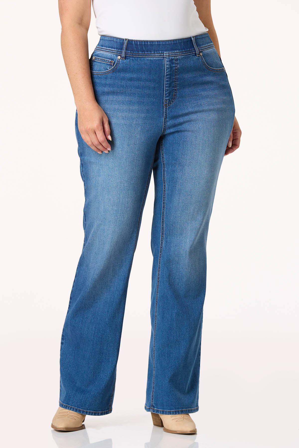 Get comfortable and stay awhile because this curve-friendly, denim style is certainly feeling comfortable, too. A stretchy, pull-on waist meets a bootcut hem, while a faded-blue hue and overall-stretchy fit makes them a dream-come-true when it comes to a favorite pair of blues.
