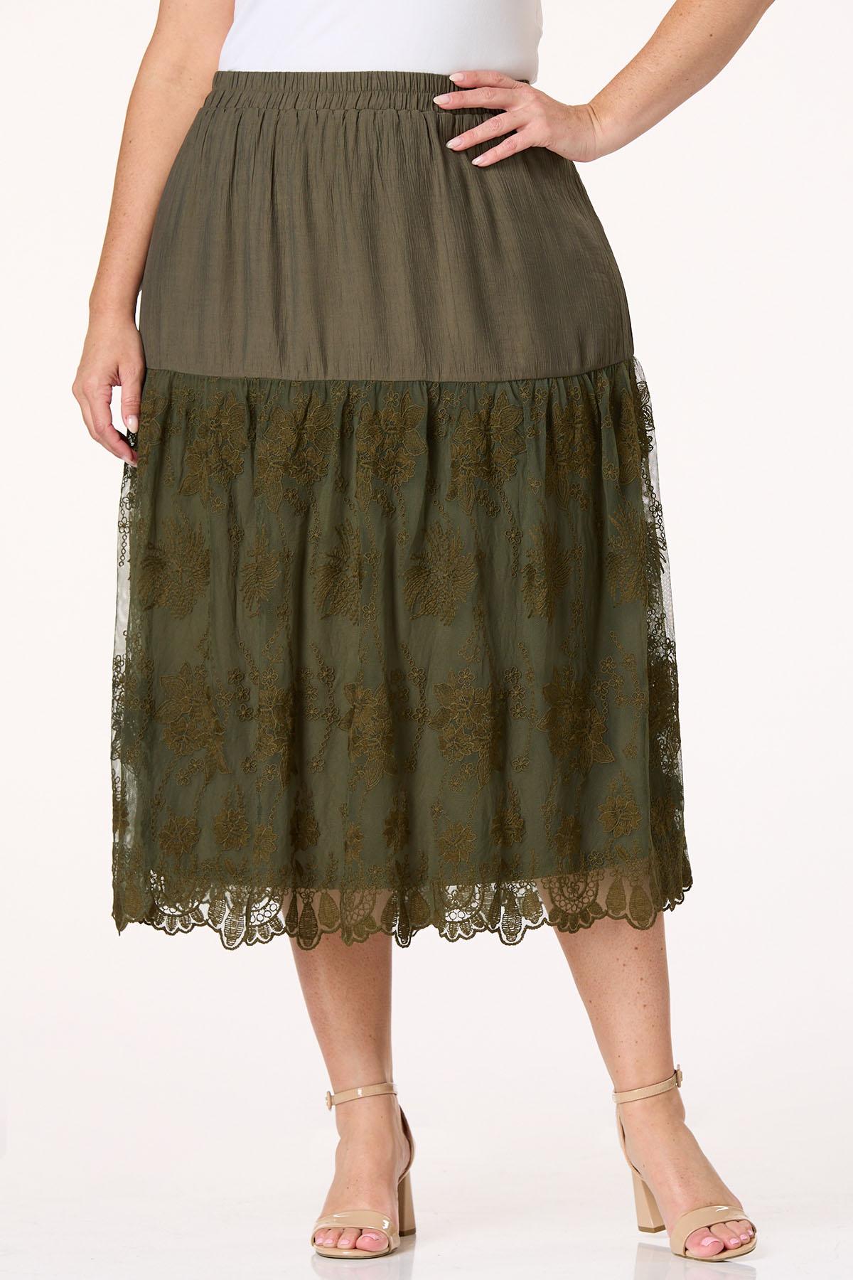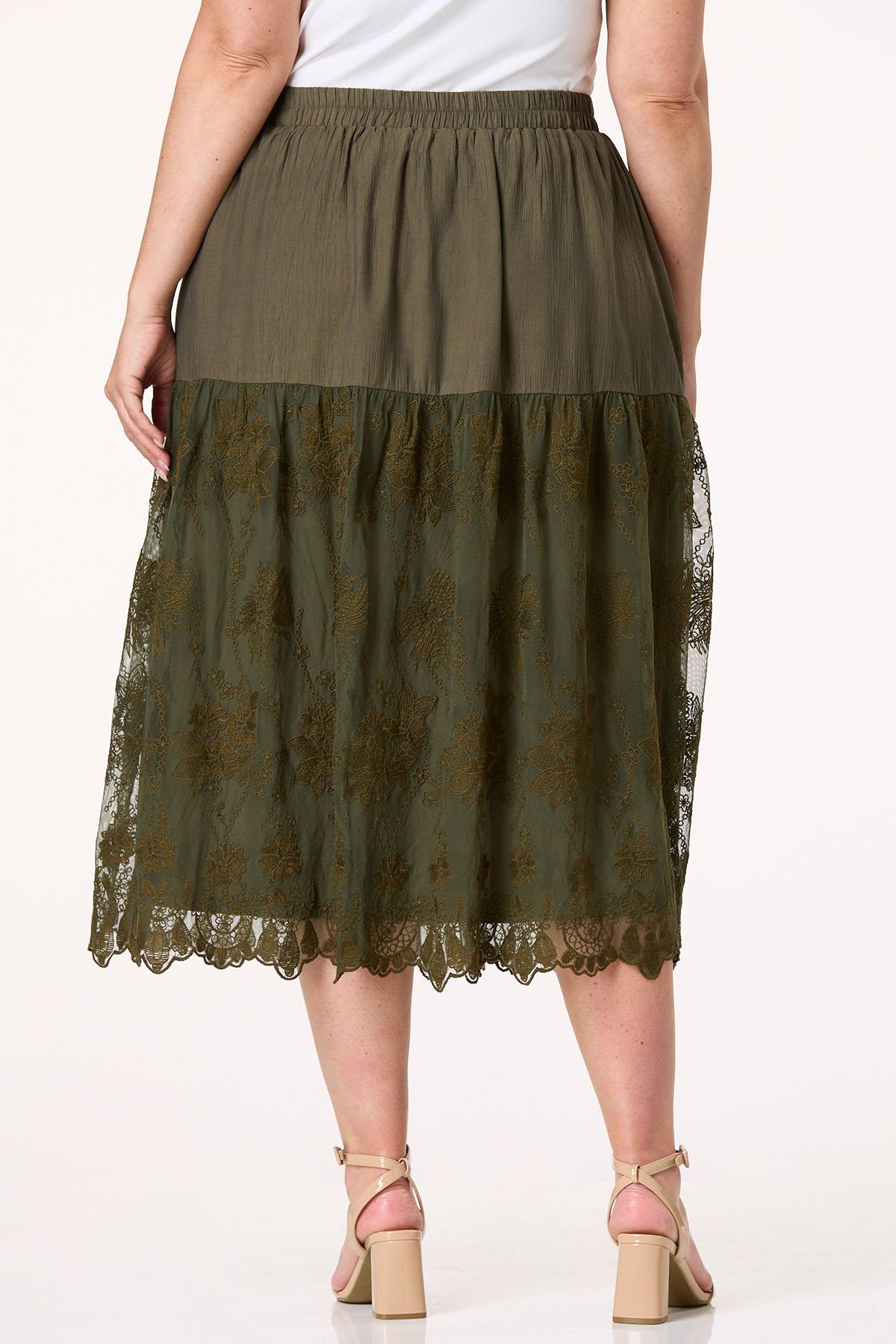 One look and you’ll be falling head over heels with this dreamy skirt, featuring a comfortable-elastic waist, earthy green hue, crinkly-satin feel and contrasting mesh fabric adorned with floral embroidery.