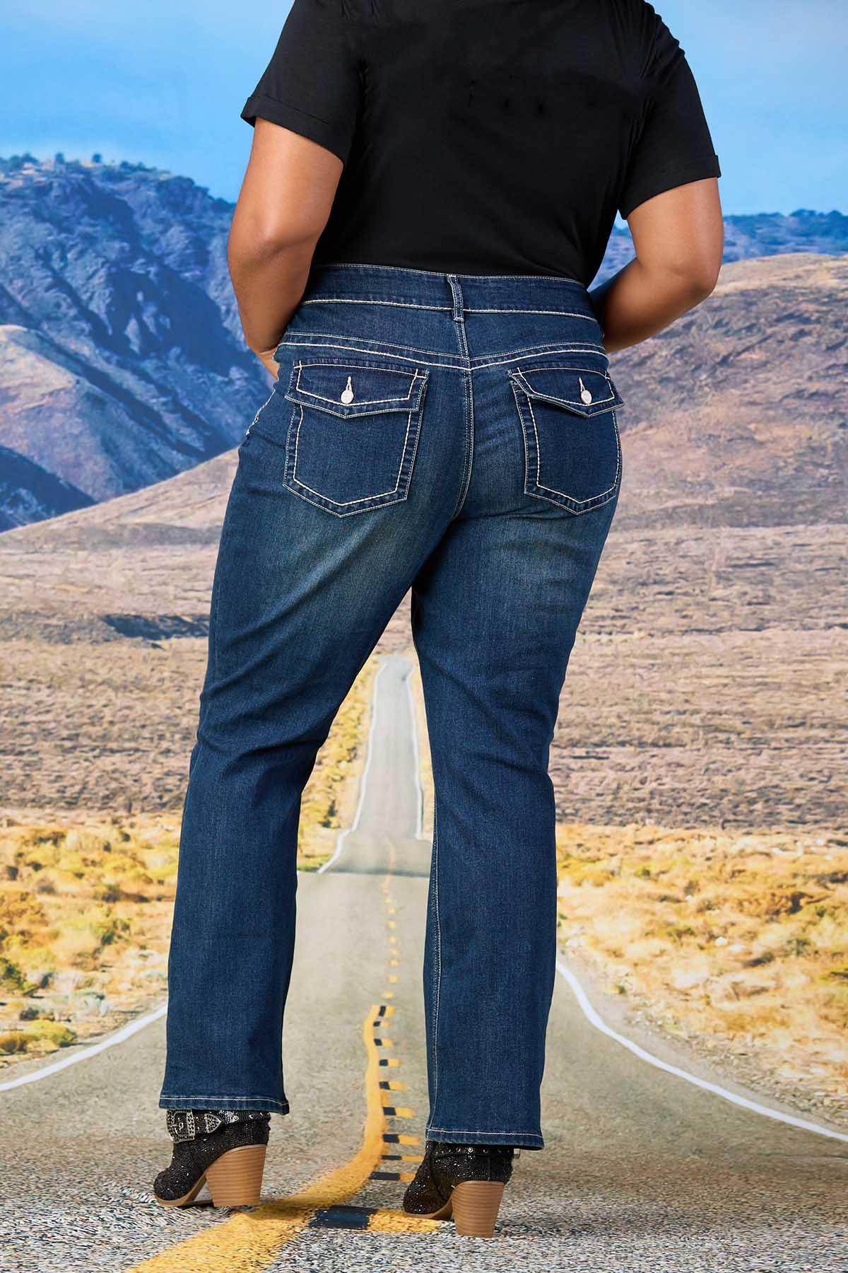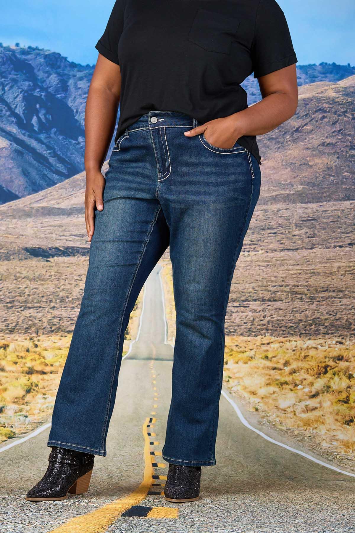Get ready to ride in these heavy-stitch bootcut jeans crafted from dark wash denim. Featuring bold back flap pockets and rugged detailing, they’re built for the rodeo – and your next adventure.