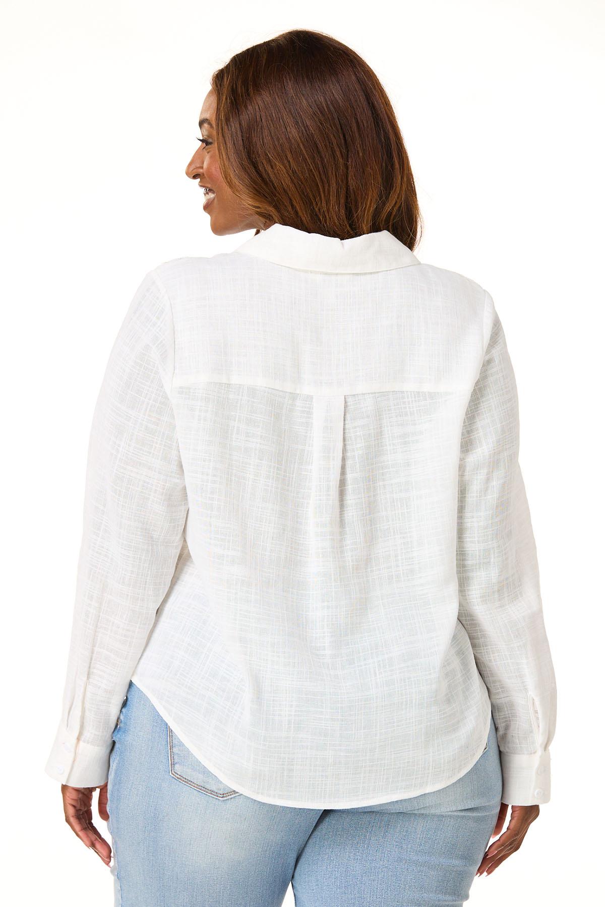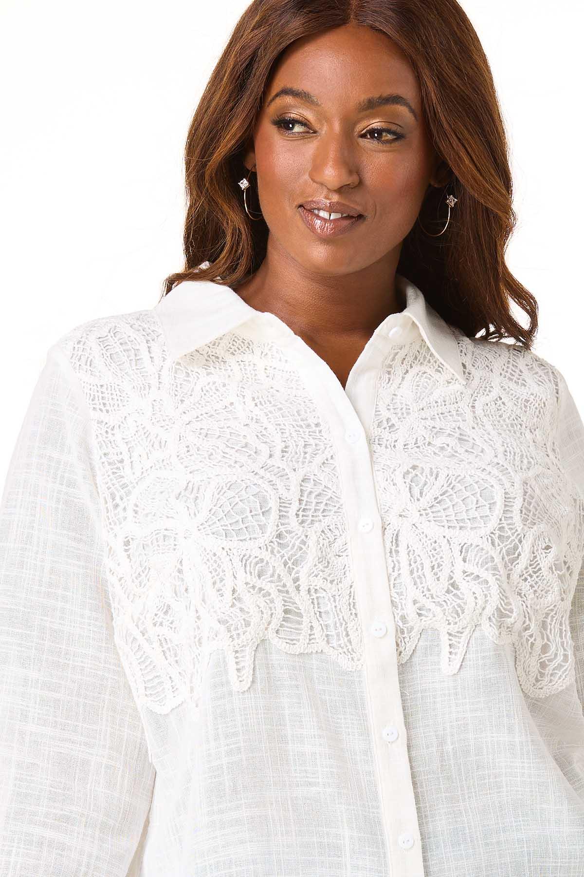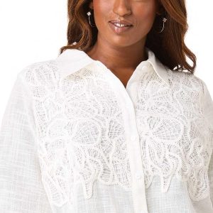 Breezy and beautiful, this lightweight linen button-down is your go-to for layering. Featuring delicate crochet piecing on the front and a semi-sheer finish, it pairs perfectly with one of our solid tanks or camis for an easy, pulled-together look.