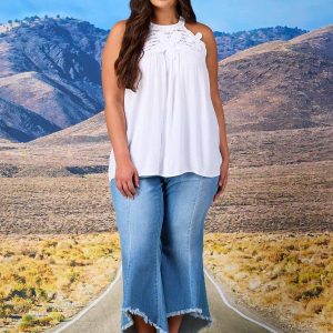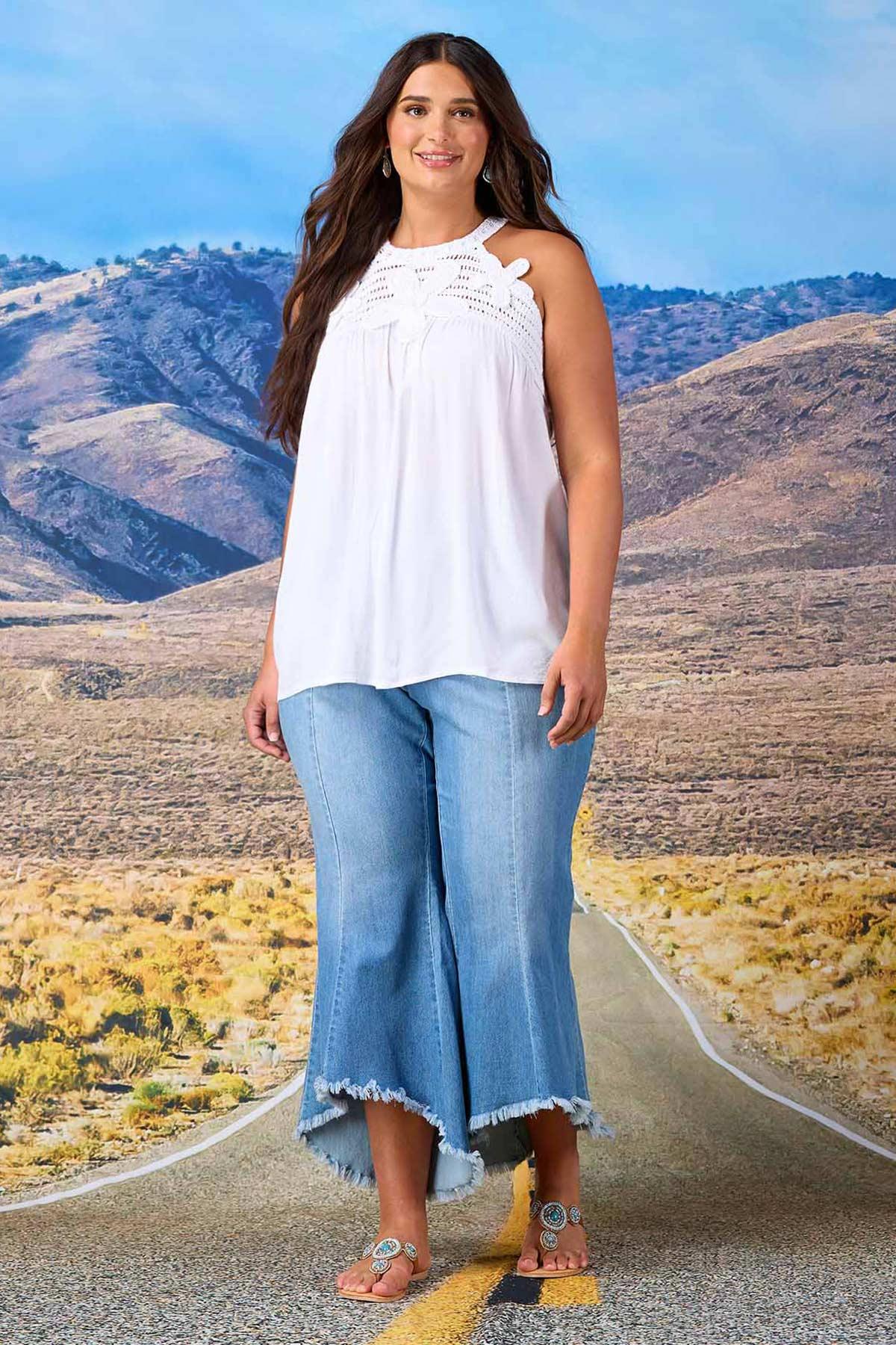 Whether you’re heading to a festival or just looking for a fun, carefree vibe – these flare jeans fit the mood perfectly with a cropped length, pull-on waist, faded-blue hue and frayed, high-low hem.